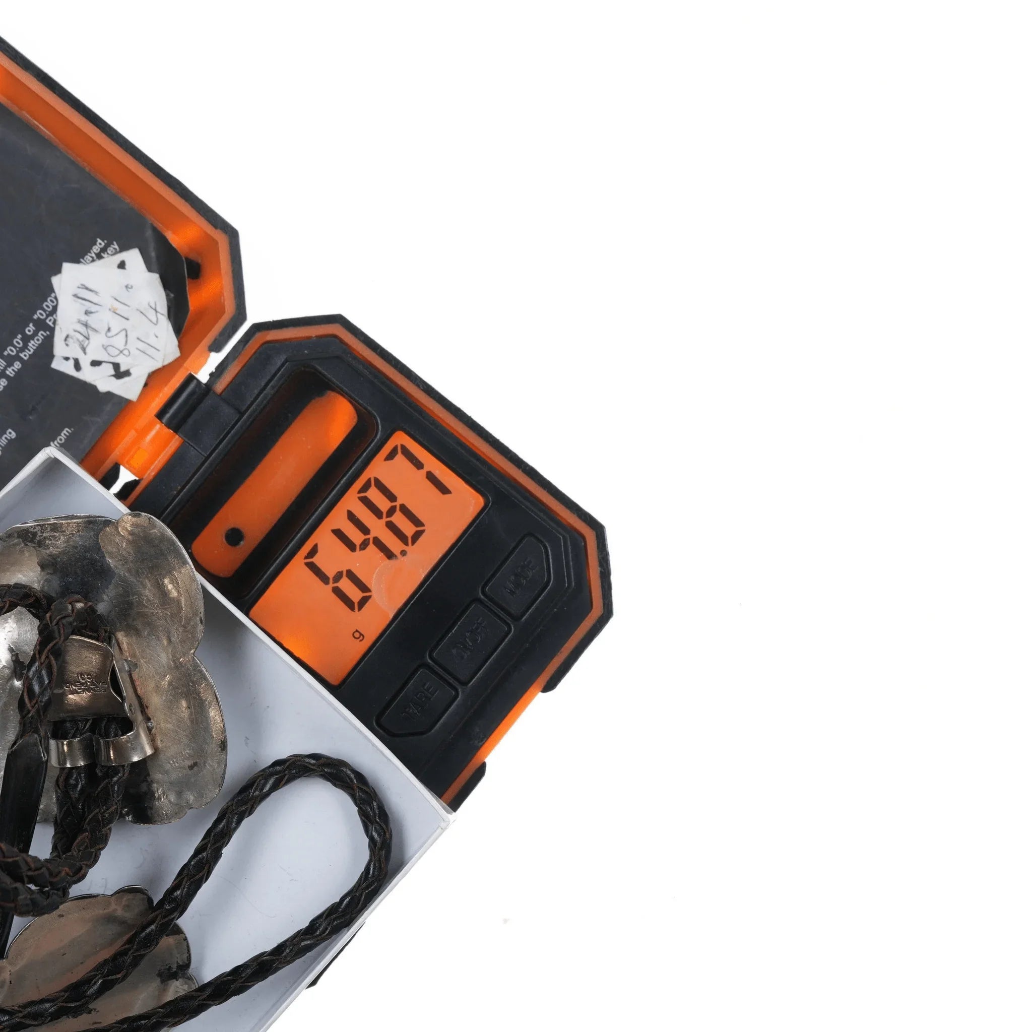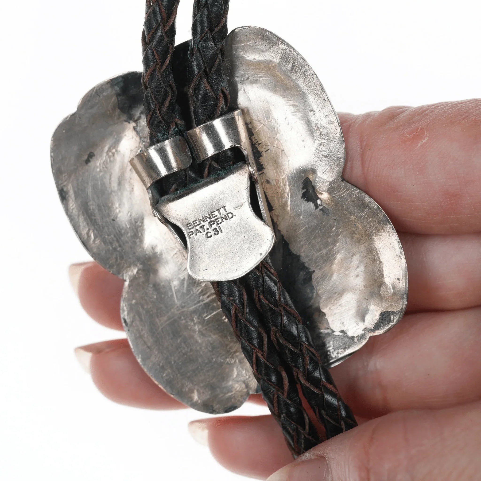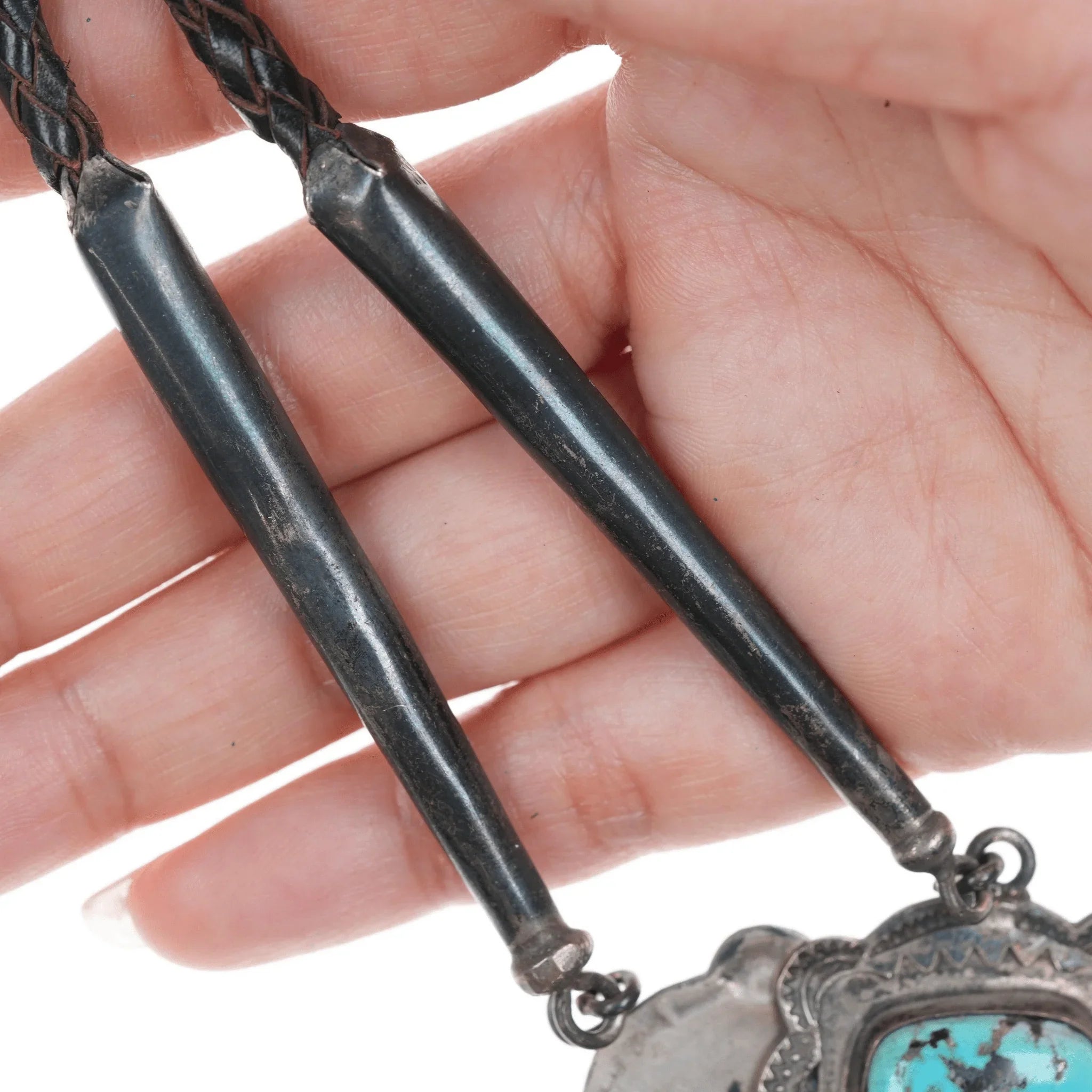 c1960 Navajo Heavy stamped silver bolo tie with turquoise and dangles. Late 50's to early 60's. Slide is 2 1/8" x 1 7/8", 41" long. <br><br>Marked or unmarked as shown in pics, weight and other measurements in pics. Sorry but my jewelry is stored in a secure location and cannot be accessed for more pictures,<br>videos, or measurements until sold. If you look at pictures/description your<br>question should be answered. Thank you so much for your time and consideration!<br><br>All precious metals are tested and guaranteed. A Native American jewelry piece referred to as "silver" or "ingot" is guaranteed to be at least 90% silver. Bracelets are photographed on a 6" women's wrist.