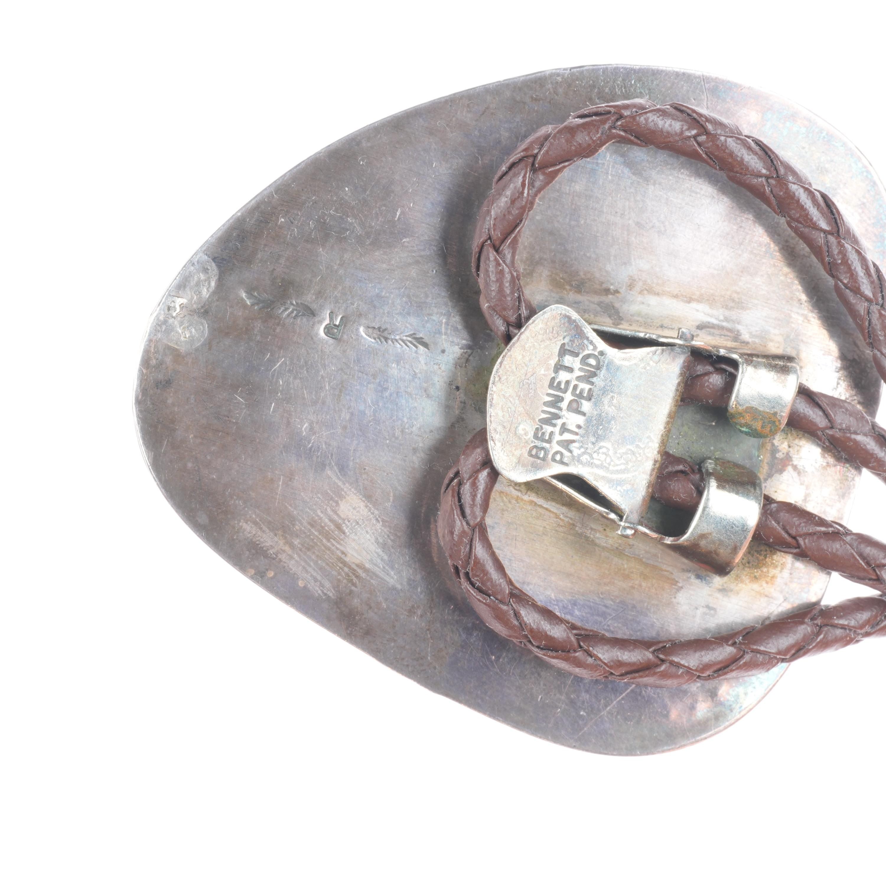 c1970 Huge Vintage Navajo sterling silver golden brown jasper bolo tie. Tested and guaranteed solid sterling silver slide and tips. Weight and measurements in pictures. 35" long. Circa third quarter of the 20th century.