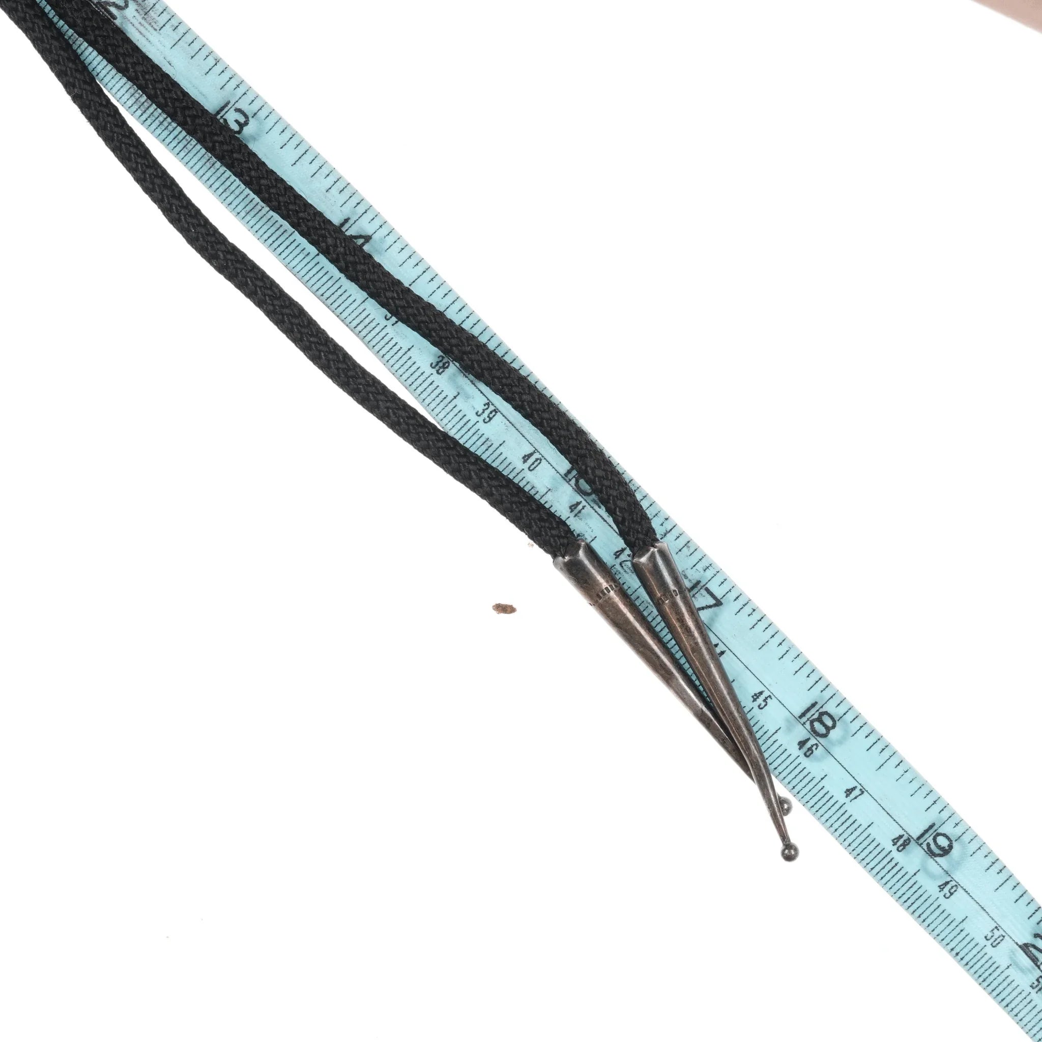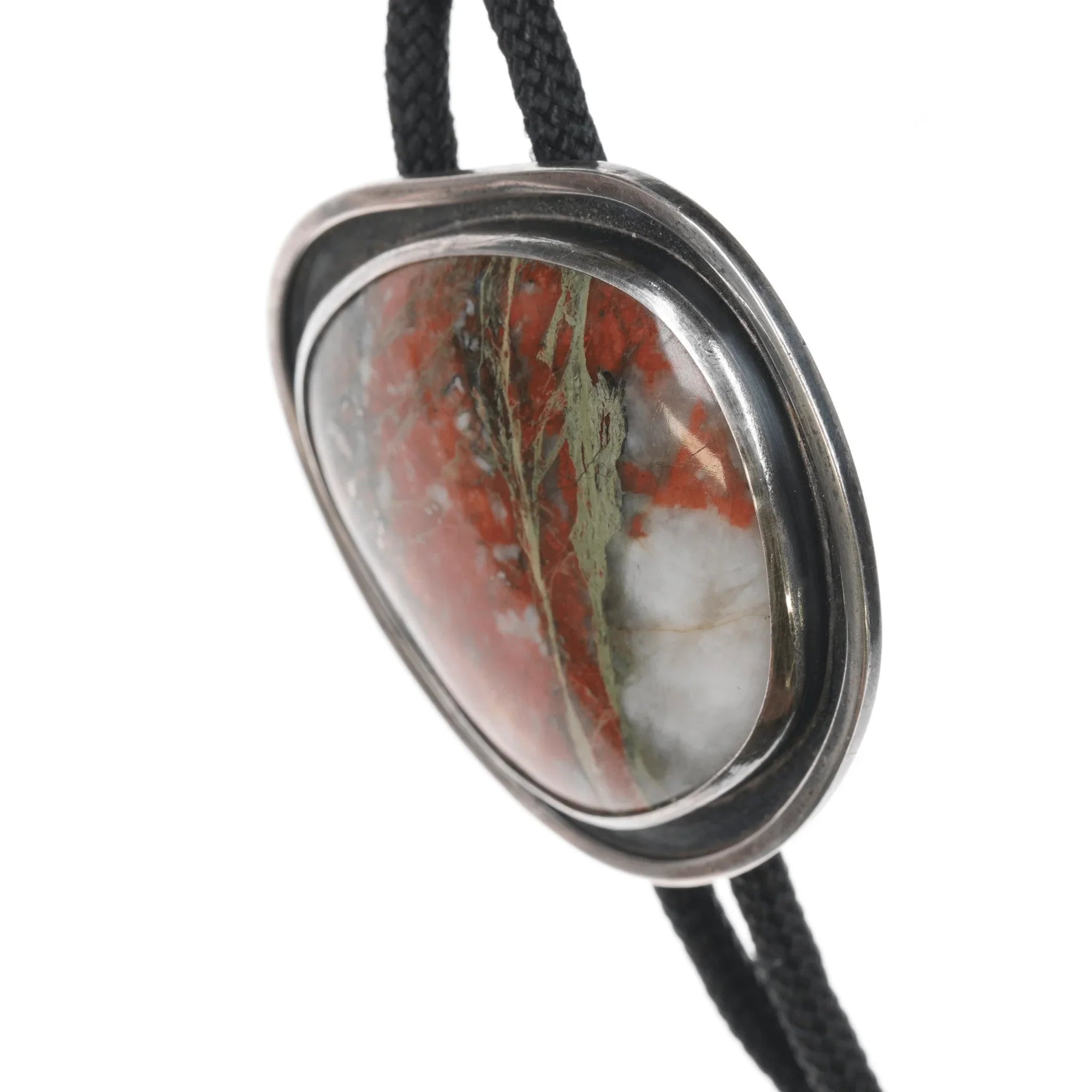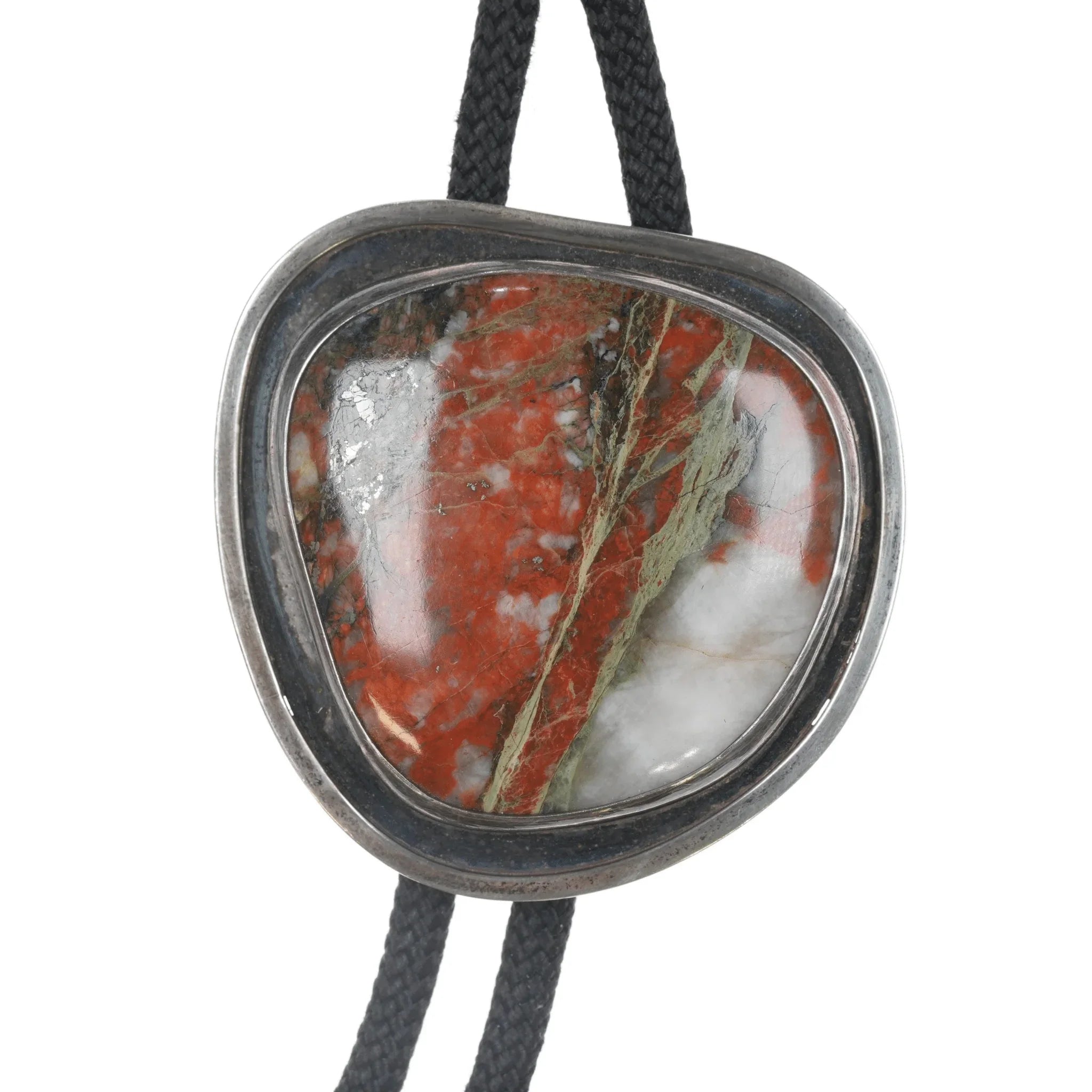 c1970's Sterling and Jasper modernist bolo tie. Nylon cord, sterling tips and bolo slide, no issues.