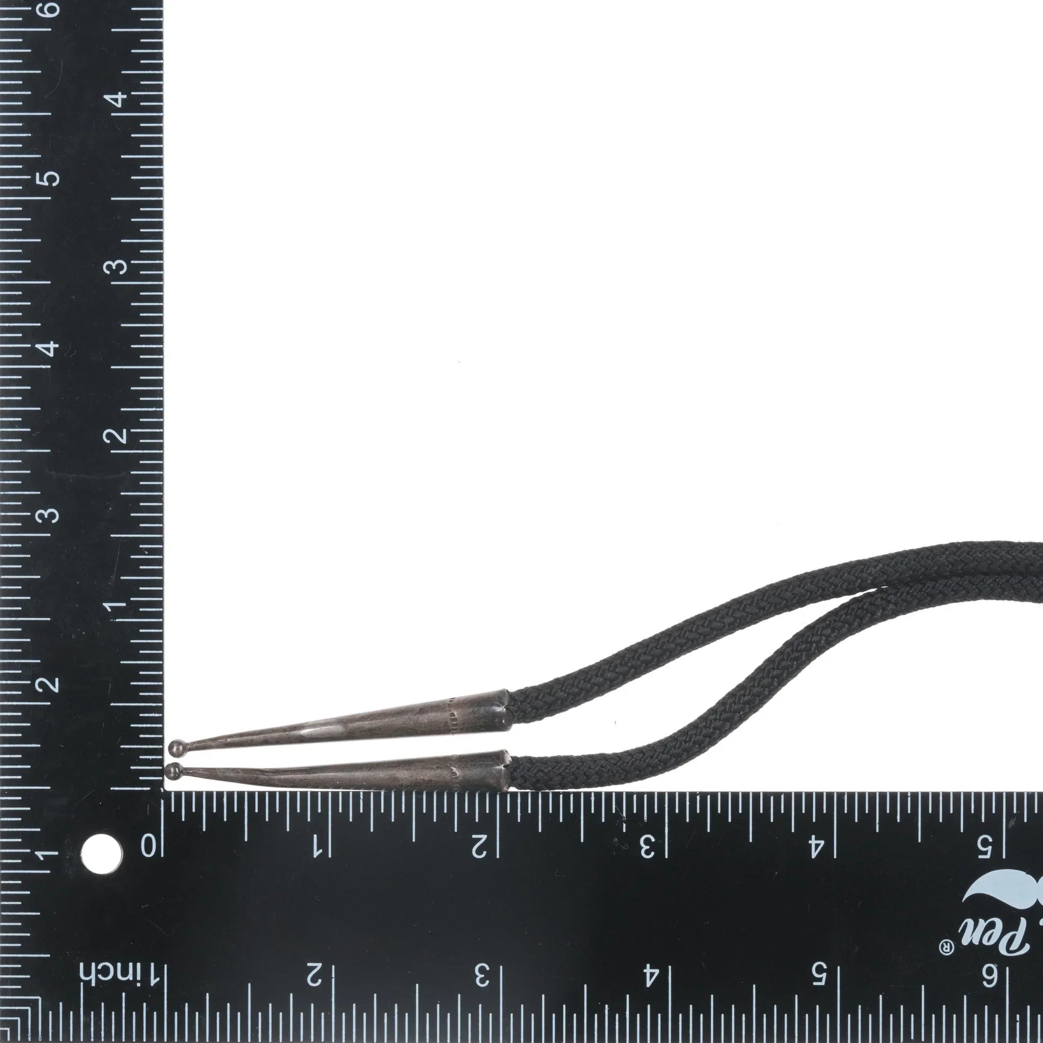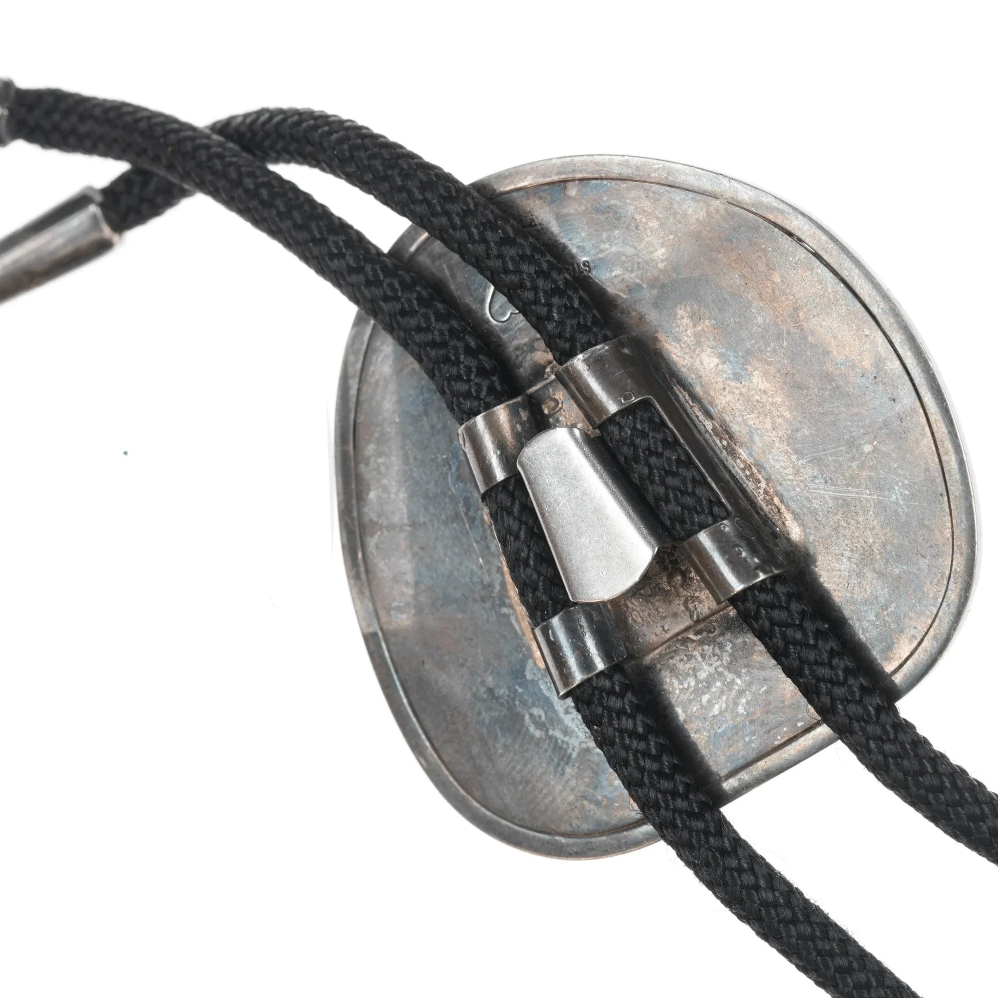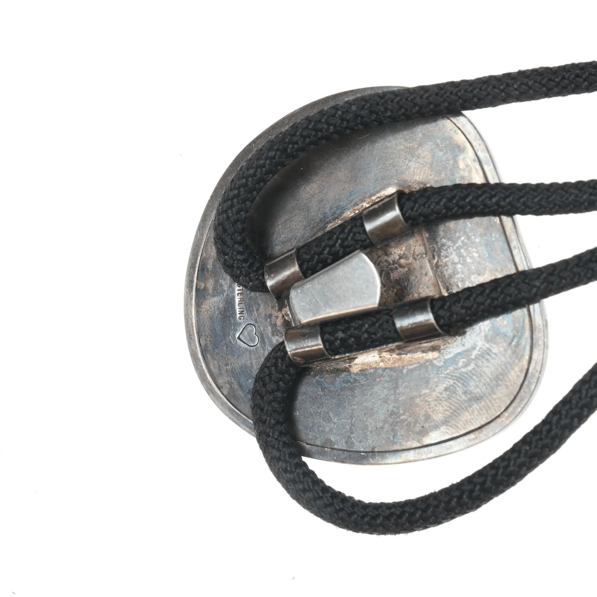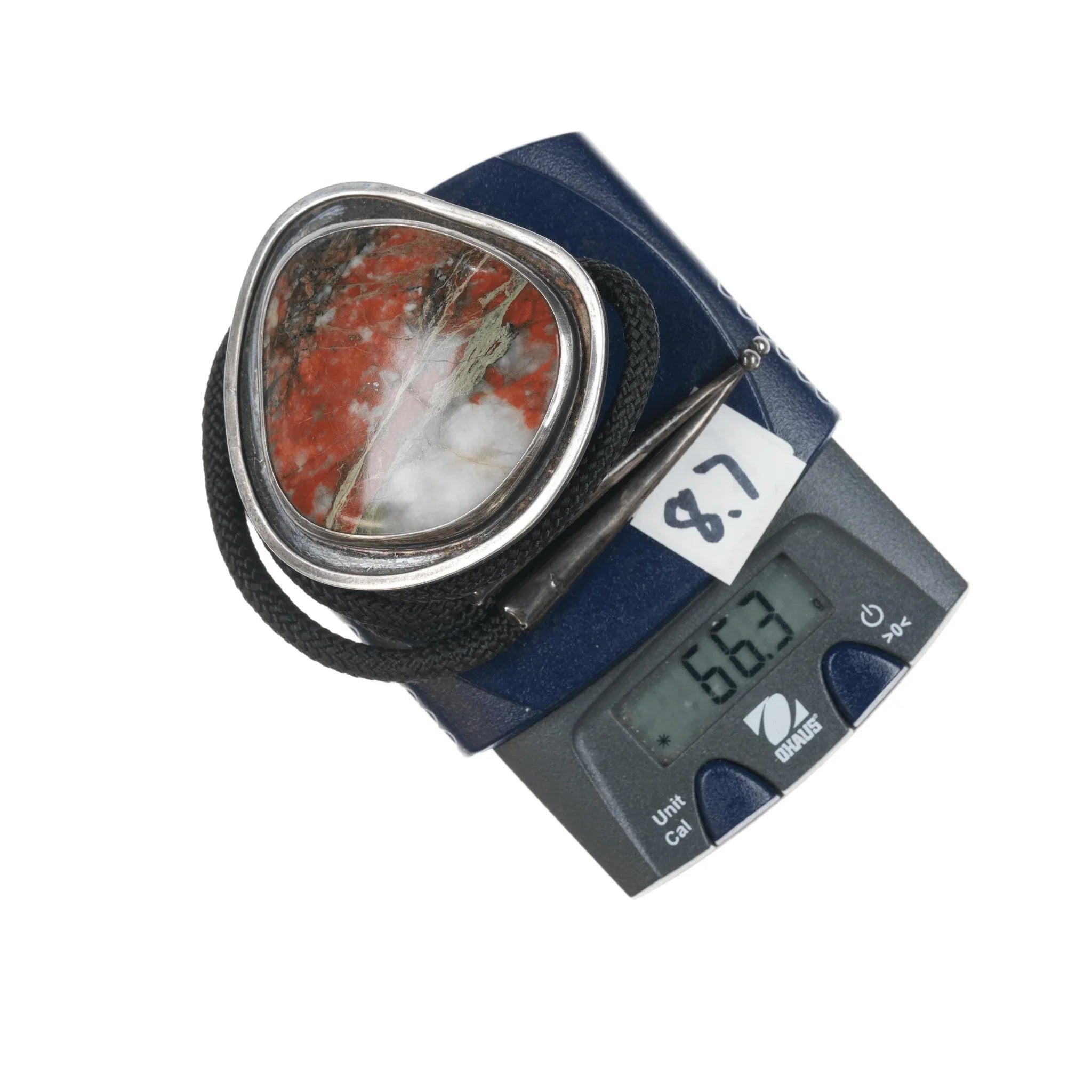 c1970's Sterling and Jasper modernist bolo tie. Nylon cord, sterling tips and bolo slide, no issues.