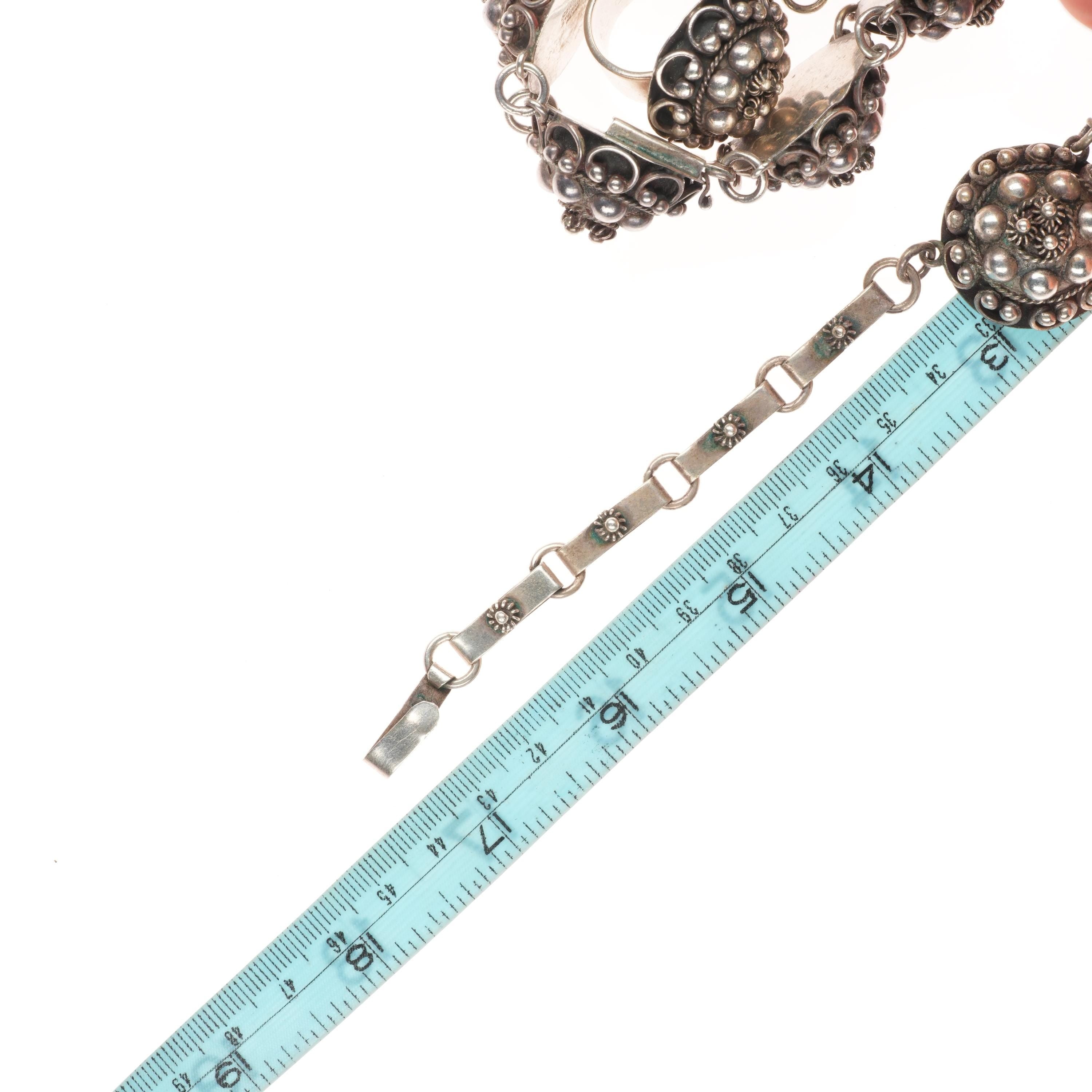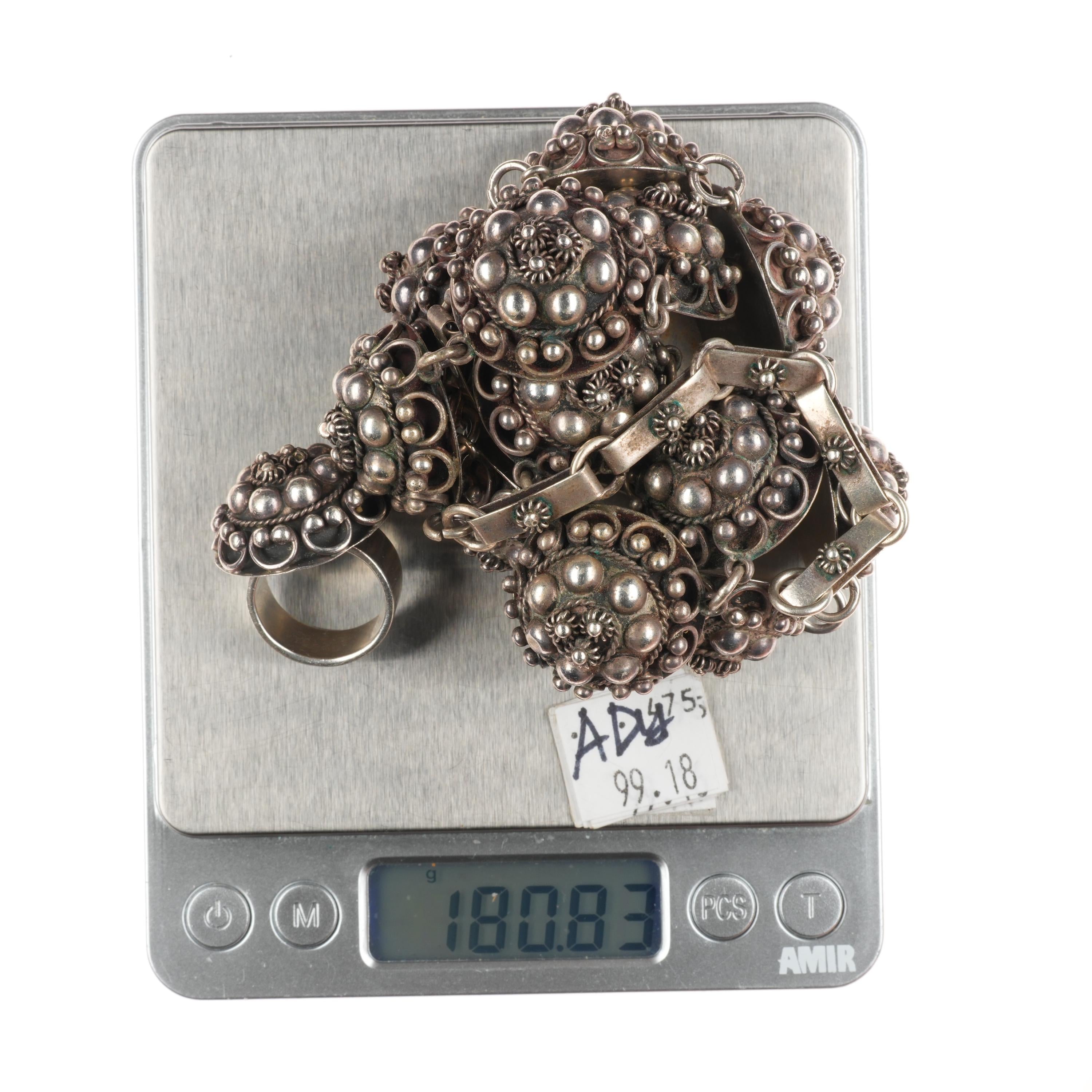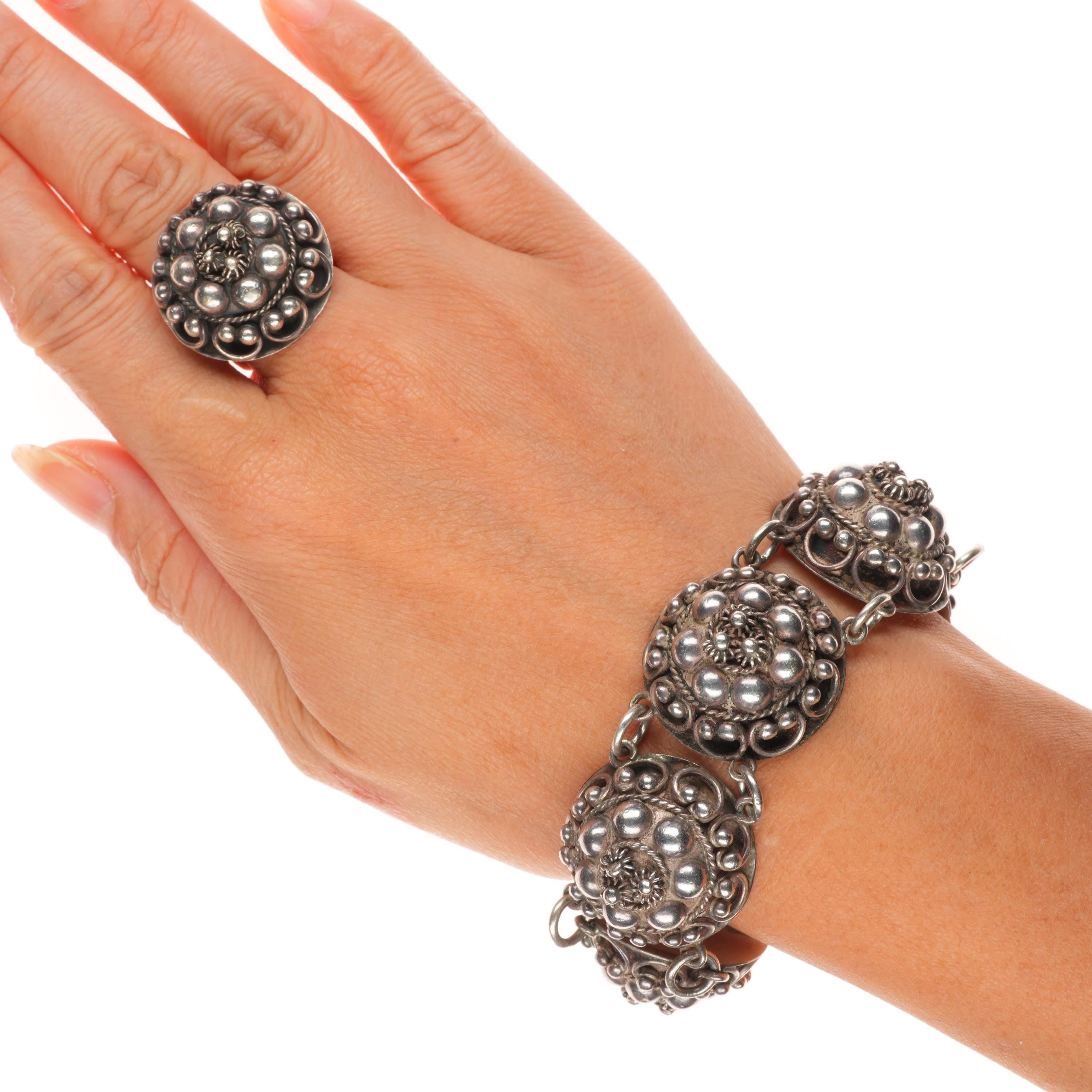 Carmen Beckmann mid century Modernist sterling silver necklace, bracelet, ring. Solid sterling silver, extremely high quality as shown 17" necklace, Size 7 ring, 6.5" bracelet. Selling the set shown from the third quarter of the 20th century with no issues. Untouched estate fresh condition, I would be happy to clean up a little upon request before shipping.