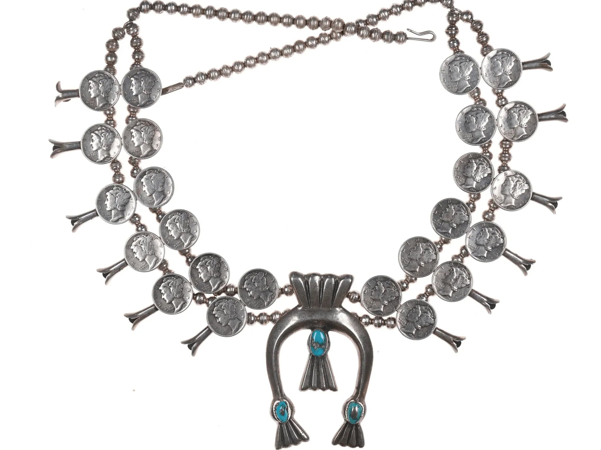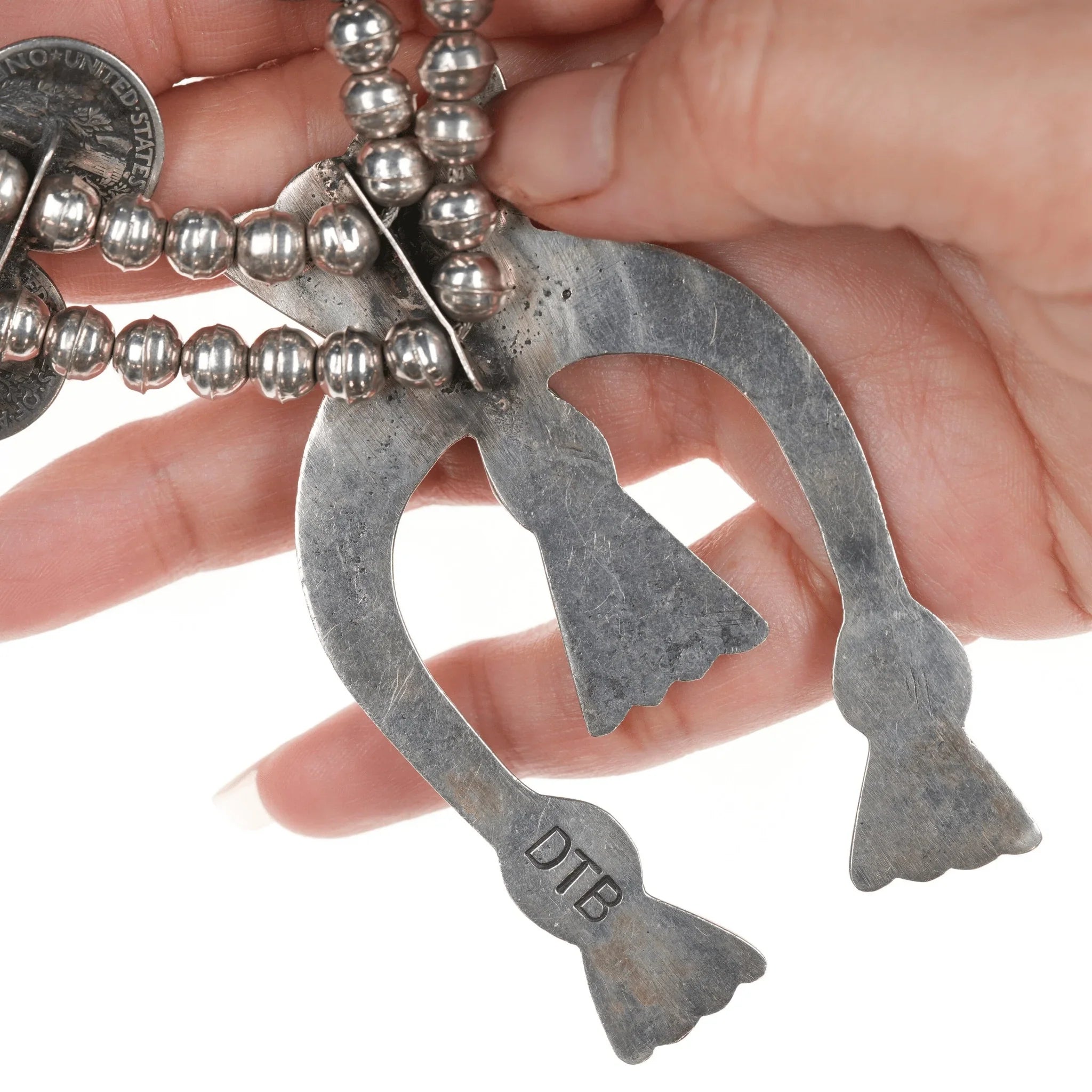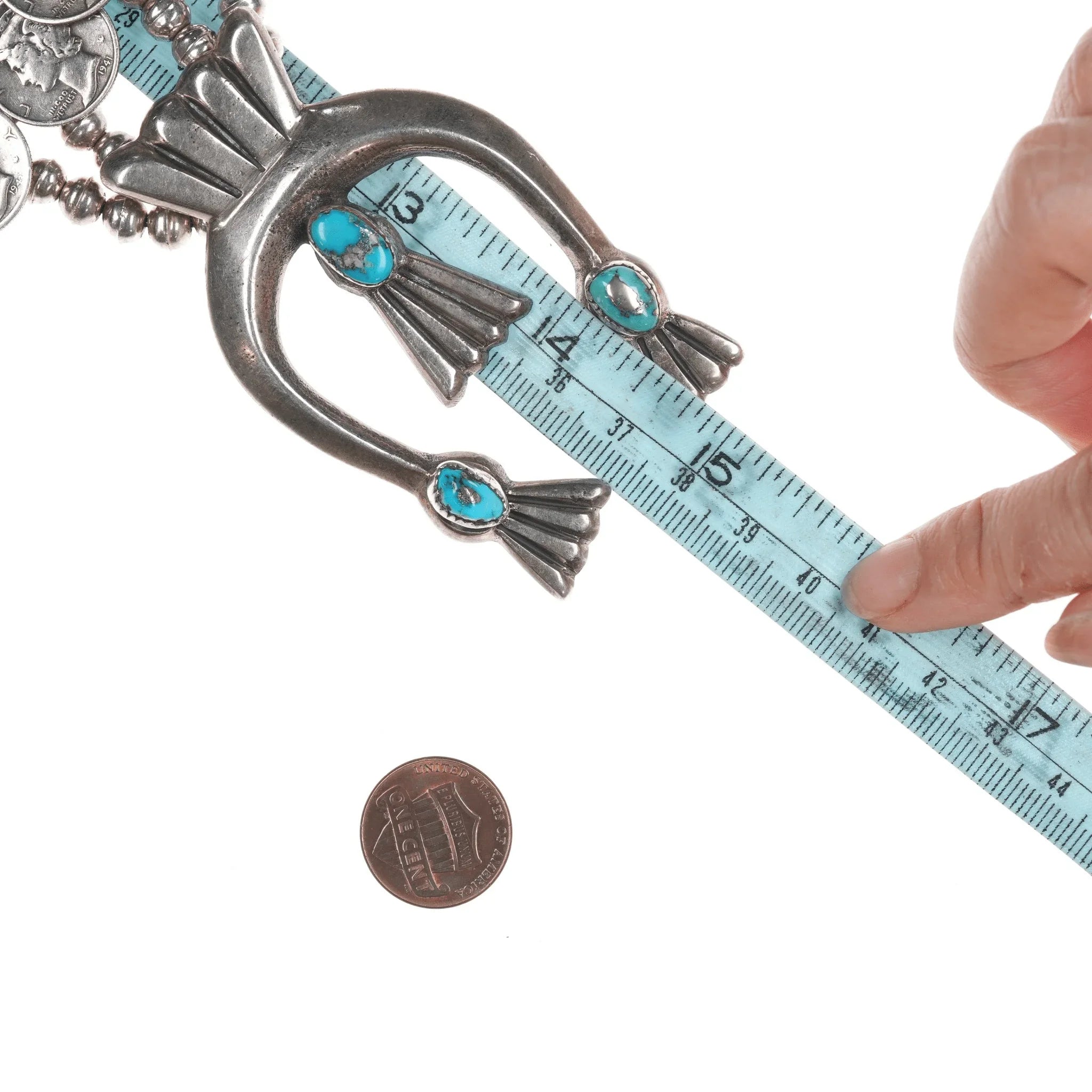 Dene Tsosie Bini Navajo Silver and turquoise 1940's dimes squash blossom necklace. No issues, Measurements and scale in pics.