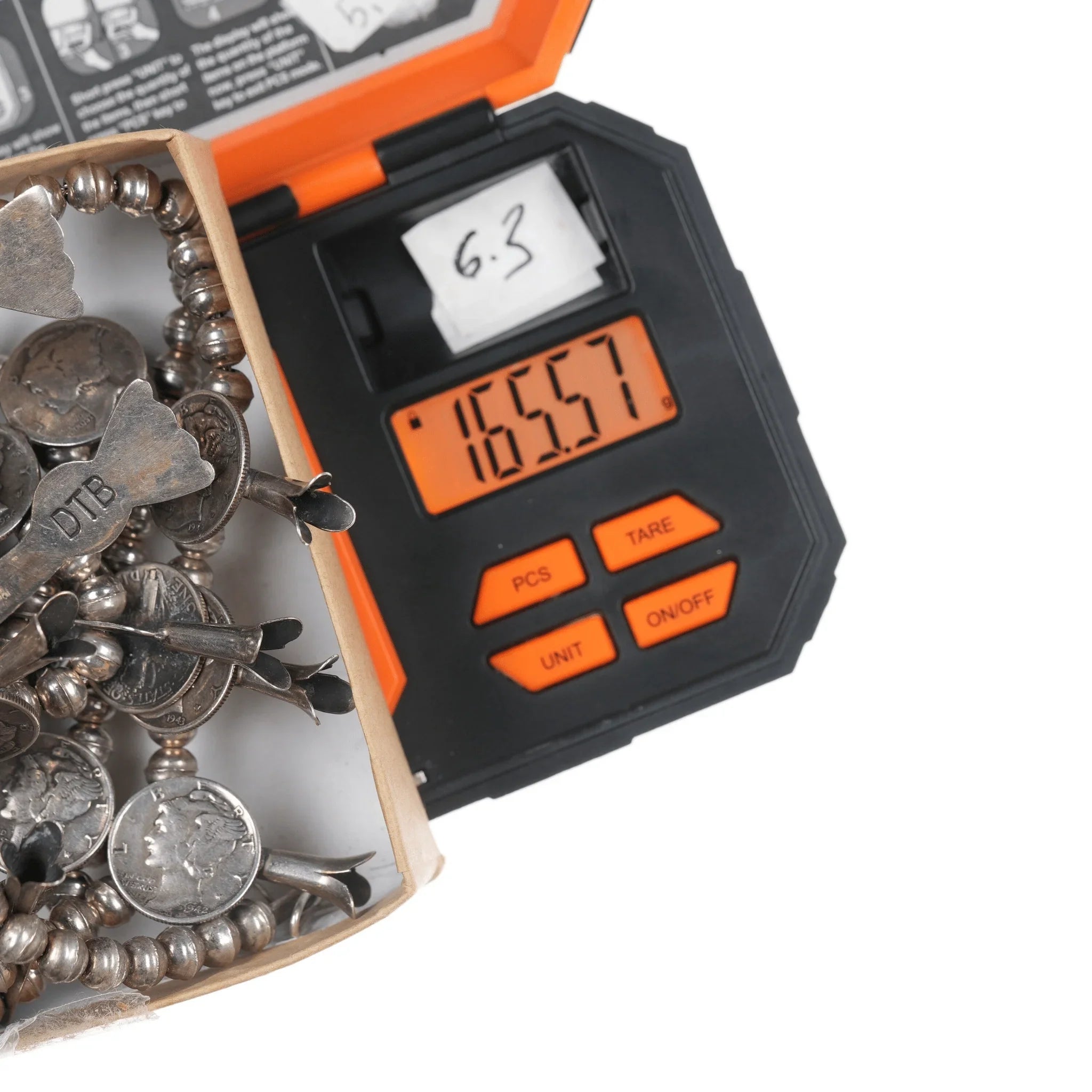 All precious metals are tested and guaranteed, any Native American jewelry<br>referred to as Silver or Sterling is guaranteed to be a minimum of 90% (coin)<br>silver and possibly higher content. Anything marked is guaranteed to be what<br>it's marked, most bracelets are photographed on a 6" wrist (non hairy), rings<br>photographed on the appropriate sized finger when possible. With bracelets if<br>the measurement is not given in the description then inside circumference is<br>shown where the metal meets the number on the the cloth tape measure.