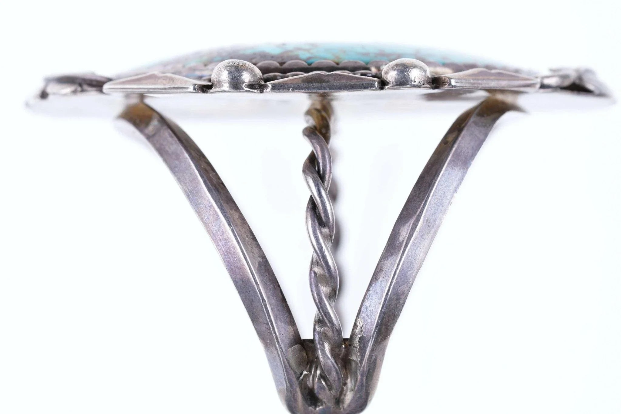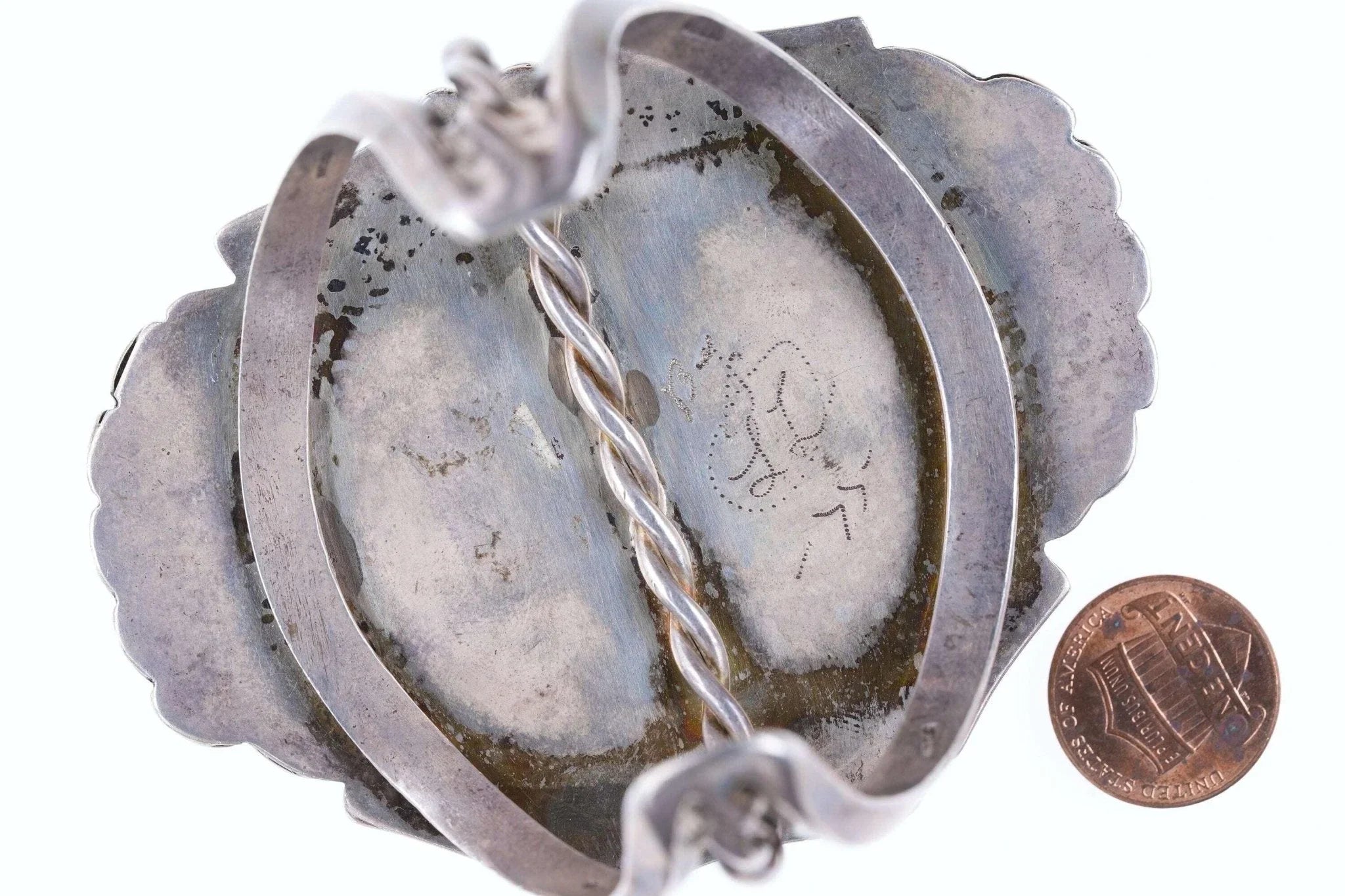 Large Vintage Native American sterling Turquoise cuff bracelet. 6.75" inside diameter including the 1.5" gap. Marked sterling and engraved by the artist in 1977. 3.5" x 2.75" face 124.9 grams.