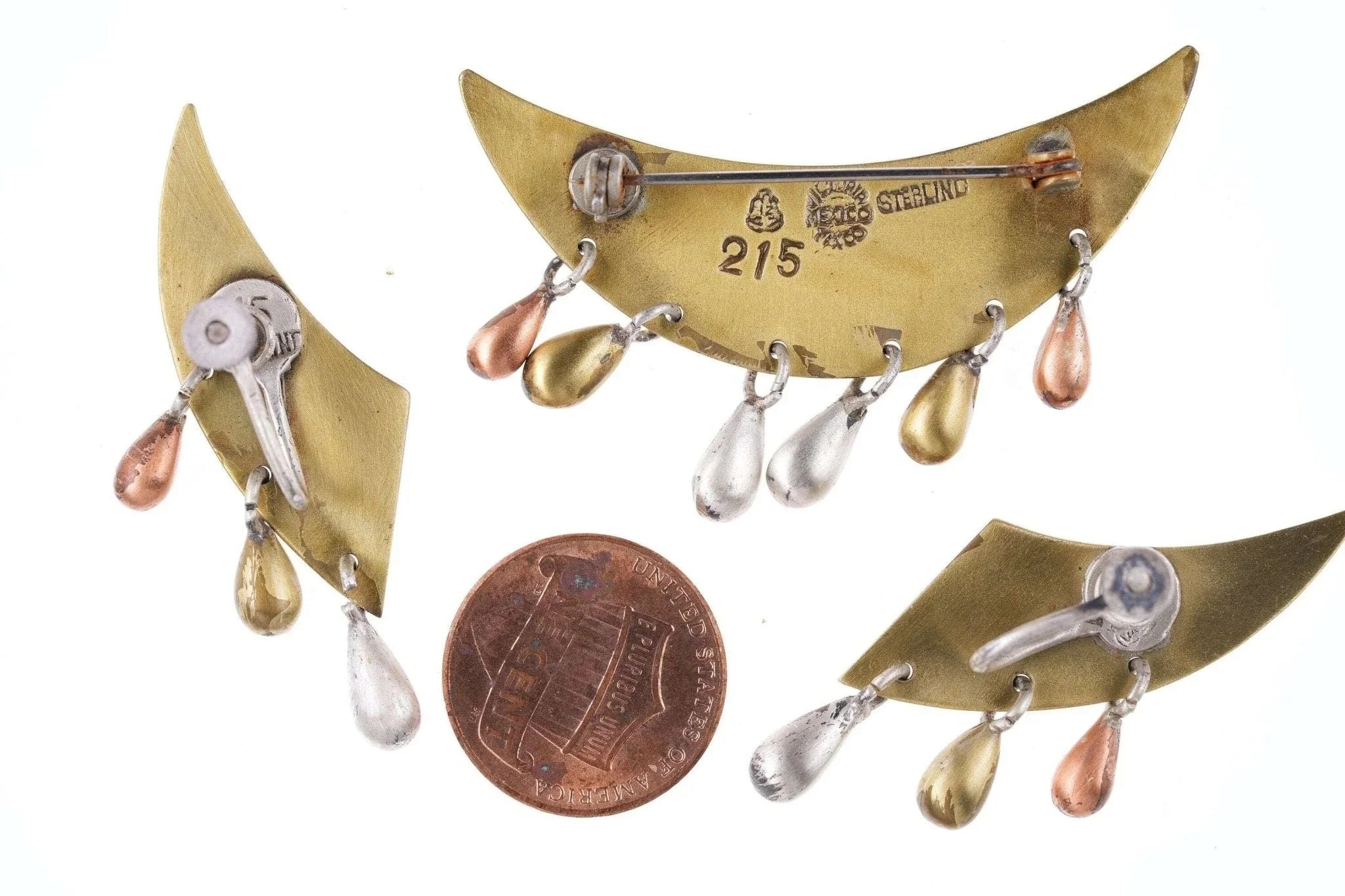 MCM Victoria Sterling/Copper/Brass Mexican Mixed Metals Pin/Screw back earrings<br>set. Doesn't appear ever worn, 2" wide brooch for scale. 19 grams total weight.