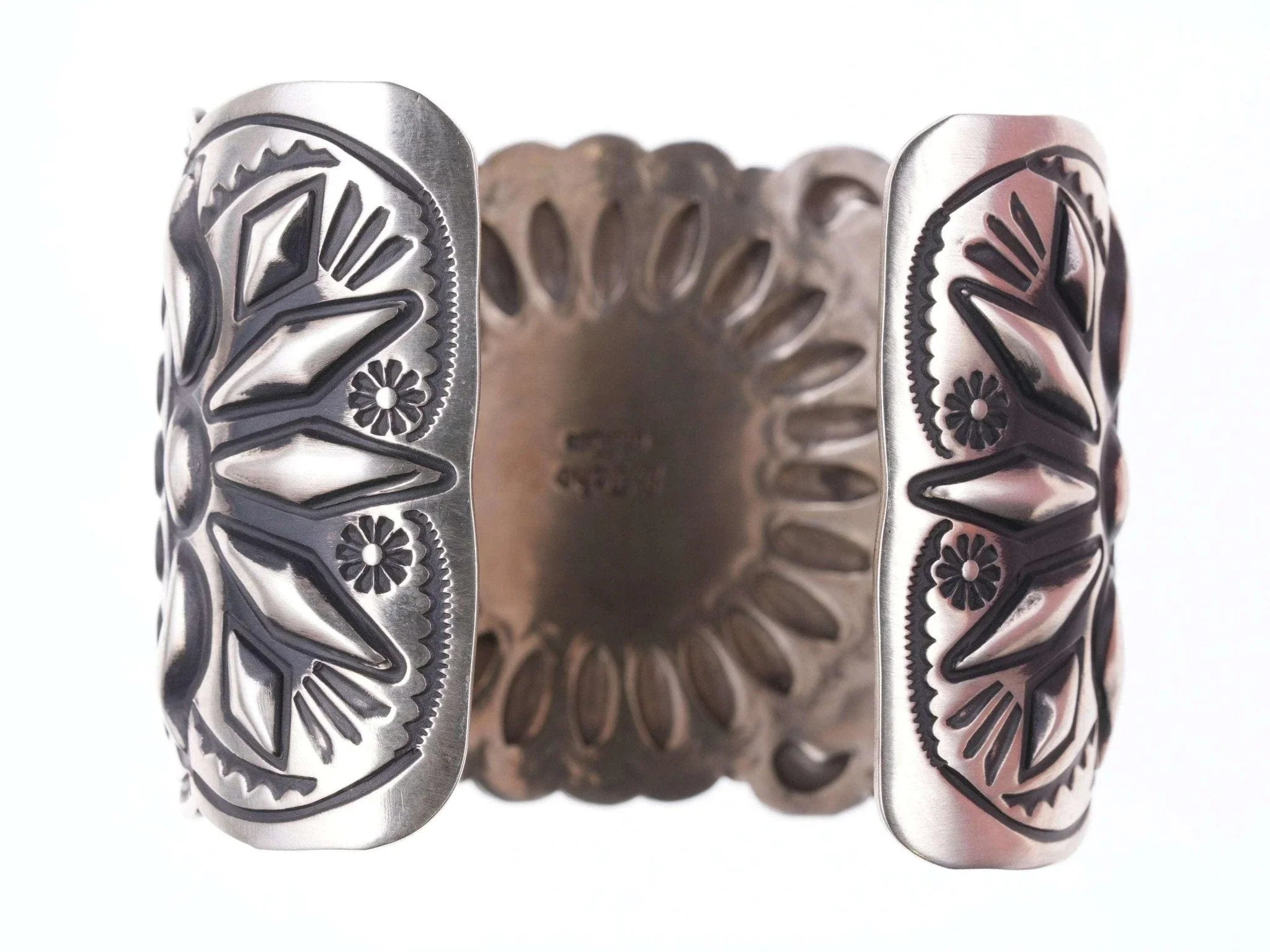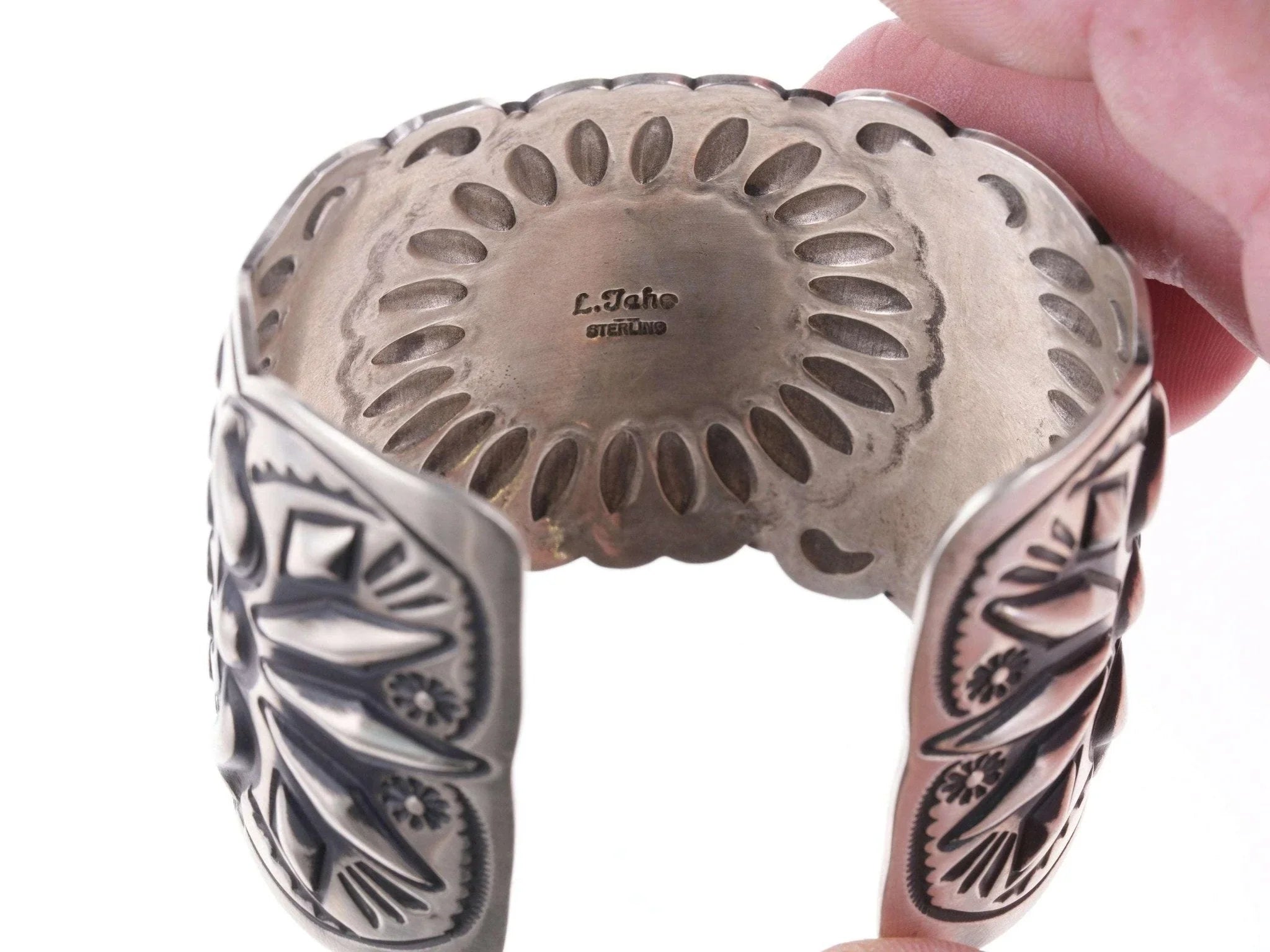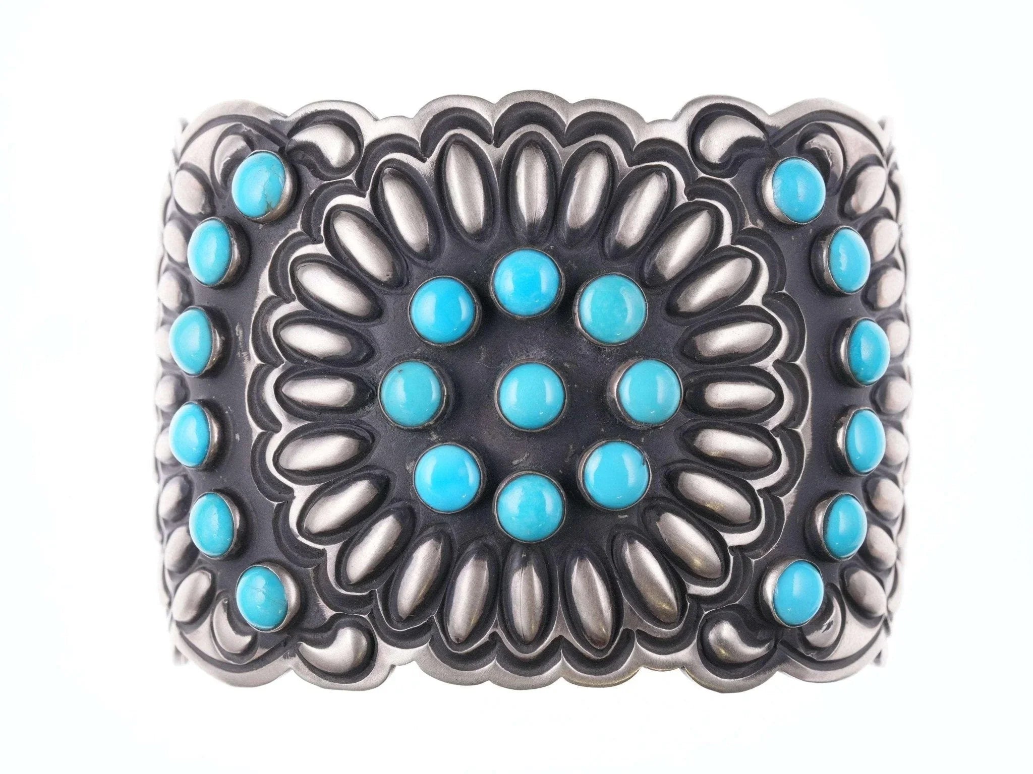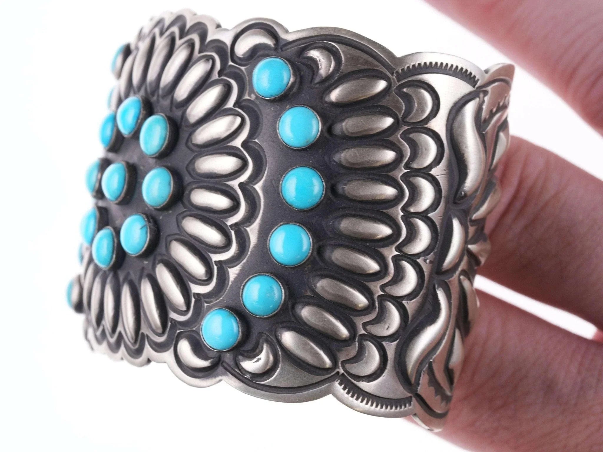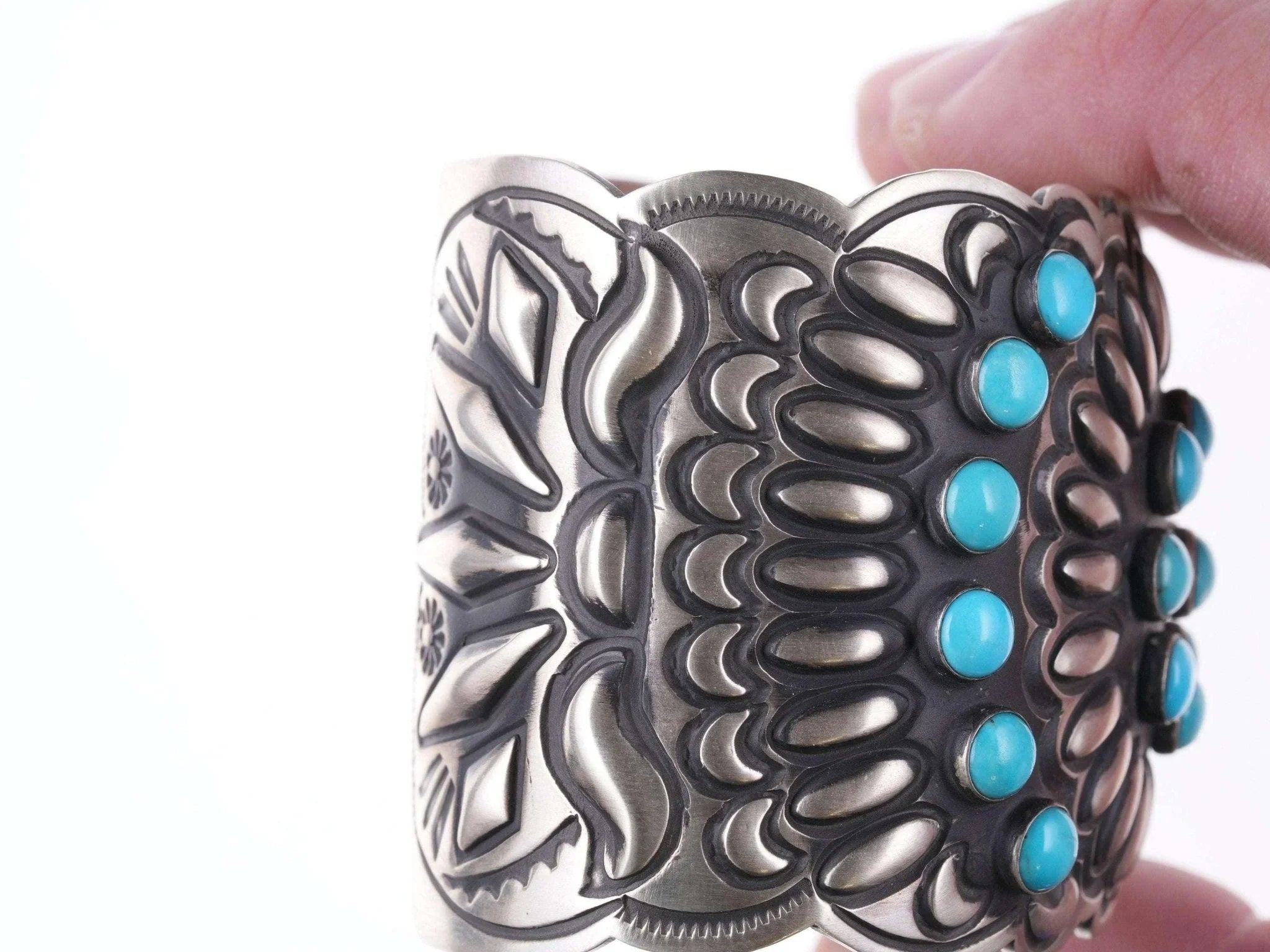 Leander Tahe Navajo Sterling and sleeping beauty turquoise bracelet, fits up to a 7.25" wrist, 1 1/8" gap, 105.6 grams with no issues. All precious metals are tested and guaranteed,