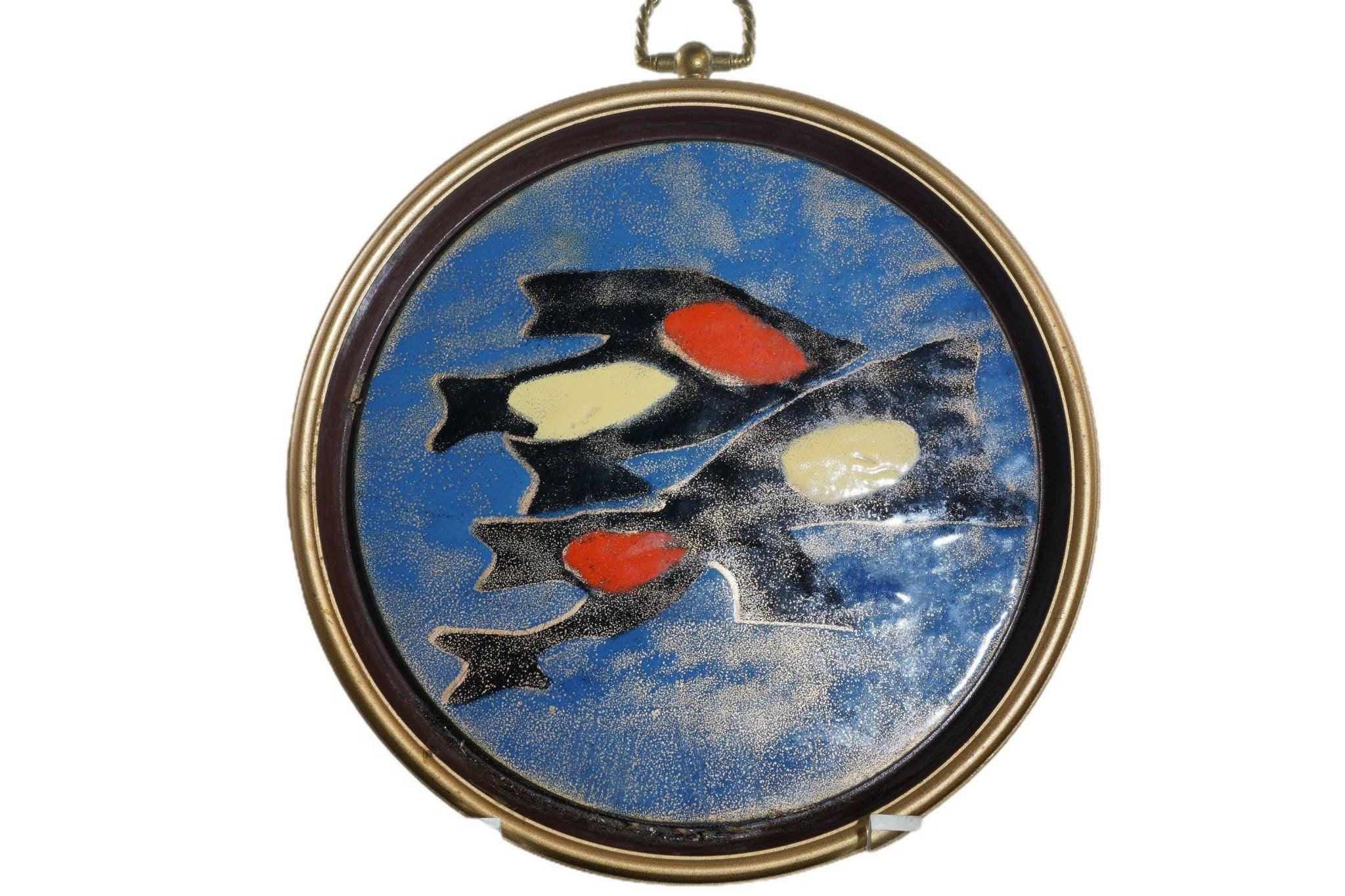 1970's MCM Copper enamel plaque. Very cool with no apparent signature, frame is plastic 7" total width. tw271