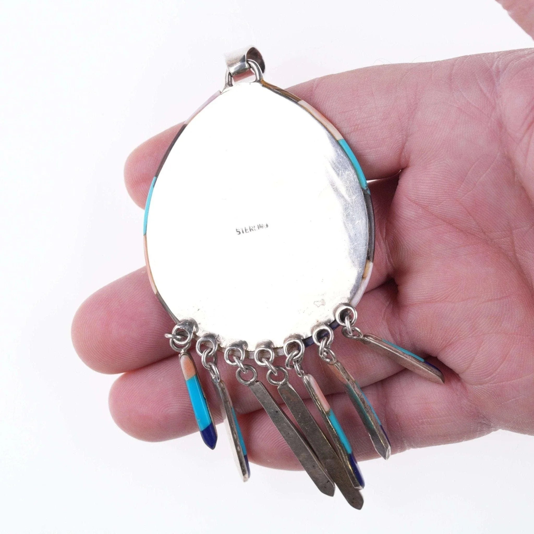 Large Southwestern sterling shell and stone inlay pendant 4.5" tall x 2 1/16"<br>wide x 33.5 grams.<br><br>All precious metals are tested and guaranteed, any Native American jewelry<br>referred to as Silver or Sterling is guaranteed to be a minimum of 90% (coin)<br>silver and possibly higher content. Most cuff bracelets are shown photographed<br>on a 6" woman's wrist and will include a photo showing the inside circumference<br>where the metal tip meets the number on the tape measure.