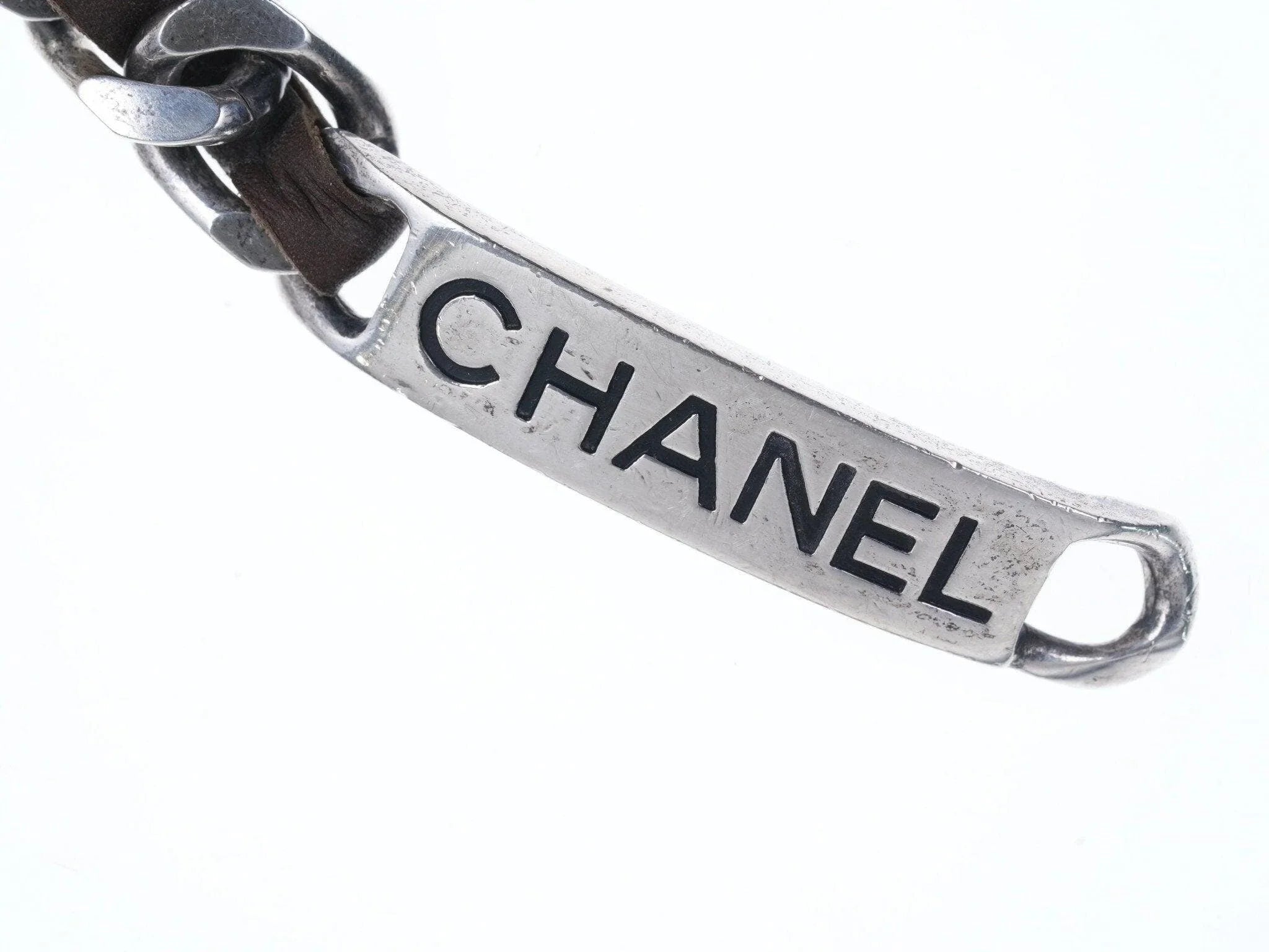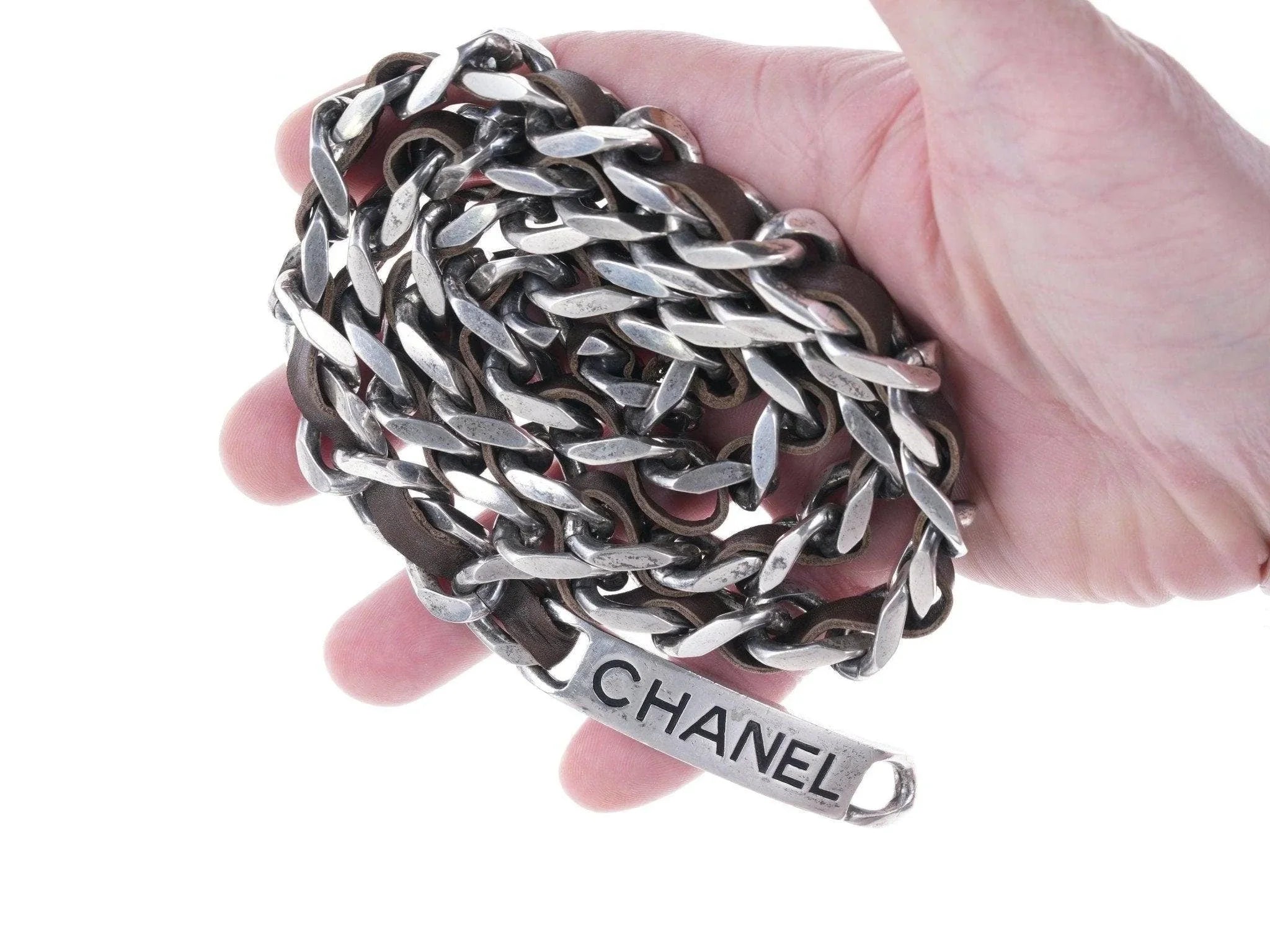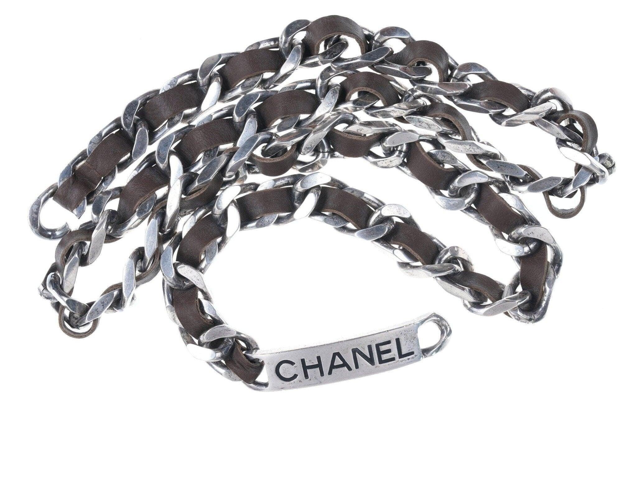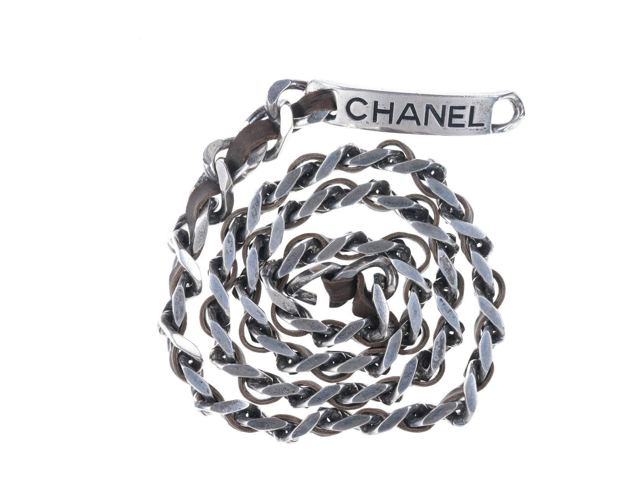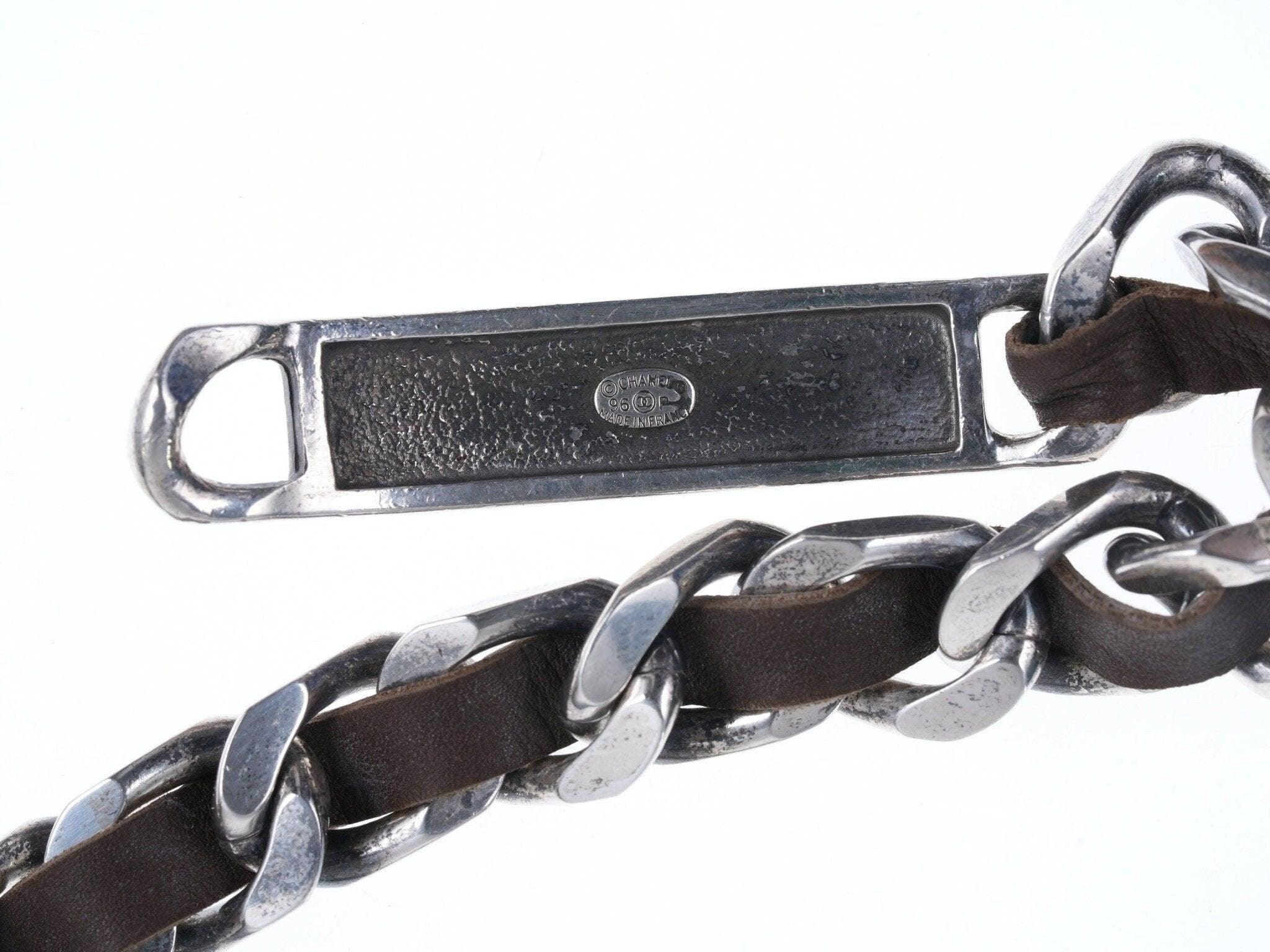 1996 Retro French Chanel belt Silver-tone with leather. From the spring 1996<br>collection, authentic 27 year old chanel belt. Some tarnish that will clean with<br>silver polish if felt necessary. Looks great, very cool retro guaranteed 100%<br>authentic Chanel belt estate fresh from a multi-million dollar clothing/jewelry<br>collection that I'm fortunate to have the opportunity to help liquidate. 34"<br>long, 18mm wide carefully cleaned by me, ready to wear as a belt or a necklace.<br><br>anderasbag