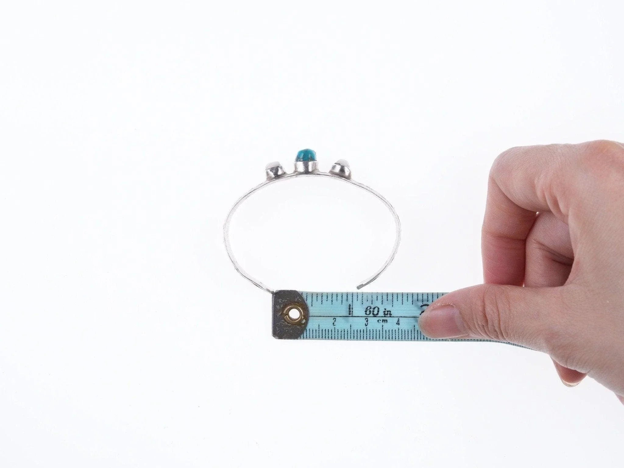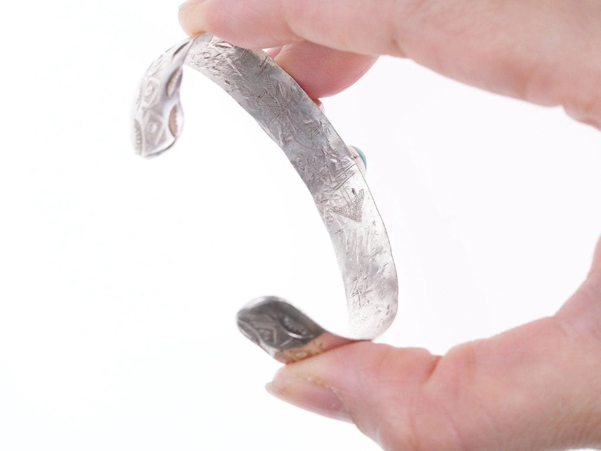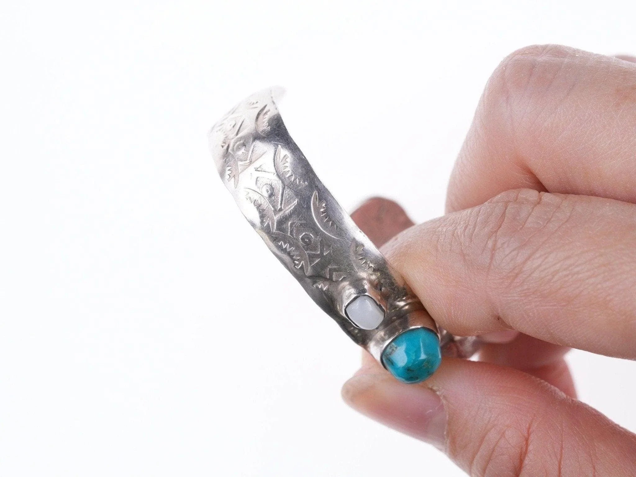 5 3/8" Navajo stamped silver - turquoise and mother of pearl bracelet. For a<br>very small wrist, no issues.<br><br>All precious metals are tested and guaranteed, any Native American jewelry<br>referred to as Silver or Sterling is guaranteed to be a minimum of 90% (coin)<br>silver and possibly higher content. Anything marked is guaranteed to be what<br>it's marked, most bracelets are photographed on a 6" wrist (non hairy), rings<br>photographed on the appropriate sized finger when possible. With bracelets if<br>the measurement is not given in the description then inside circumference is<br>shown where the metal meets the number on the the cloth tape measure.