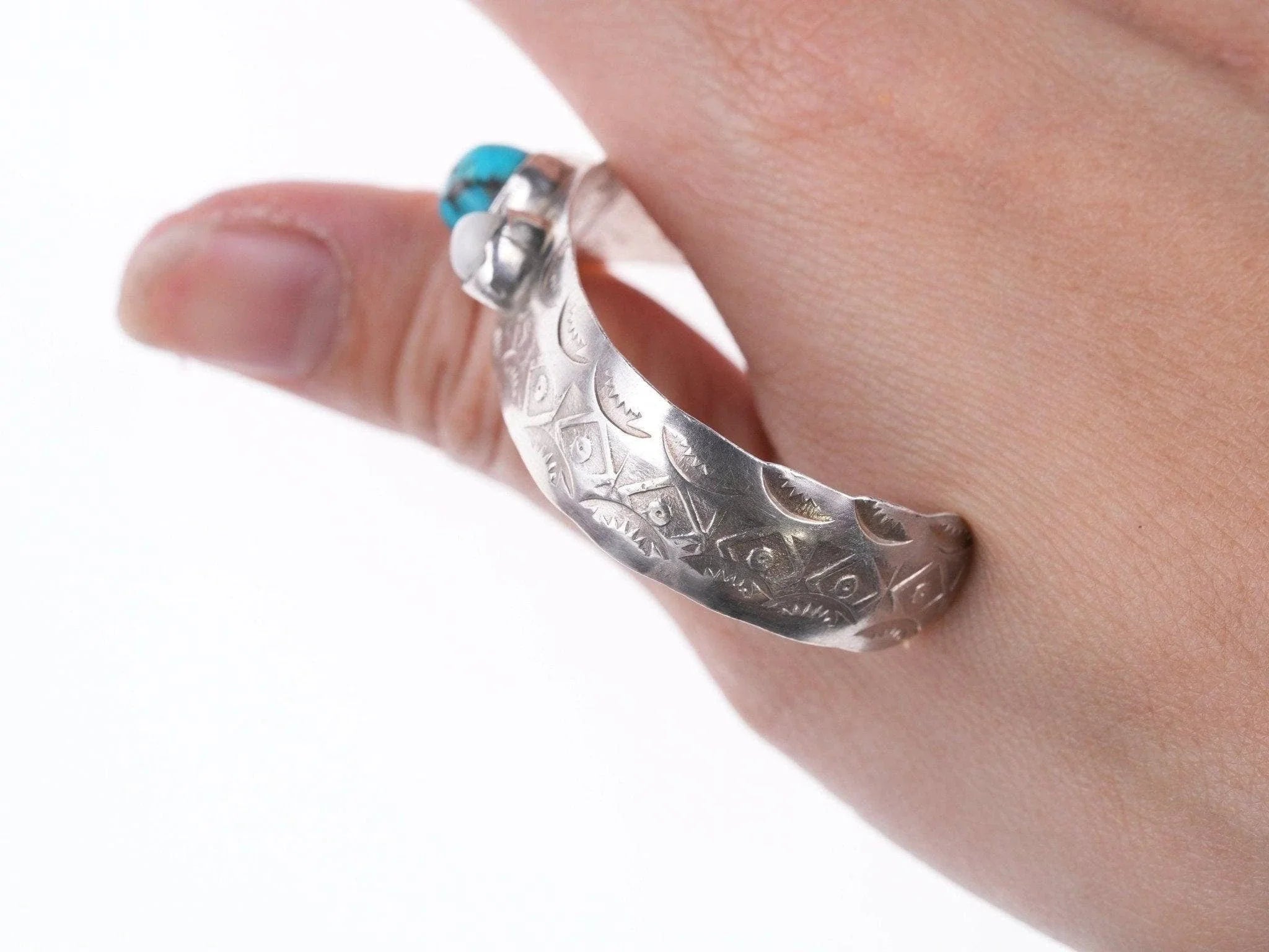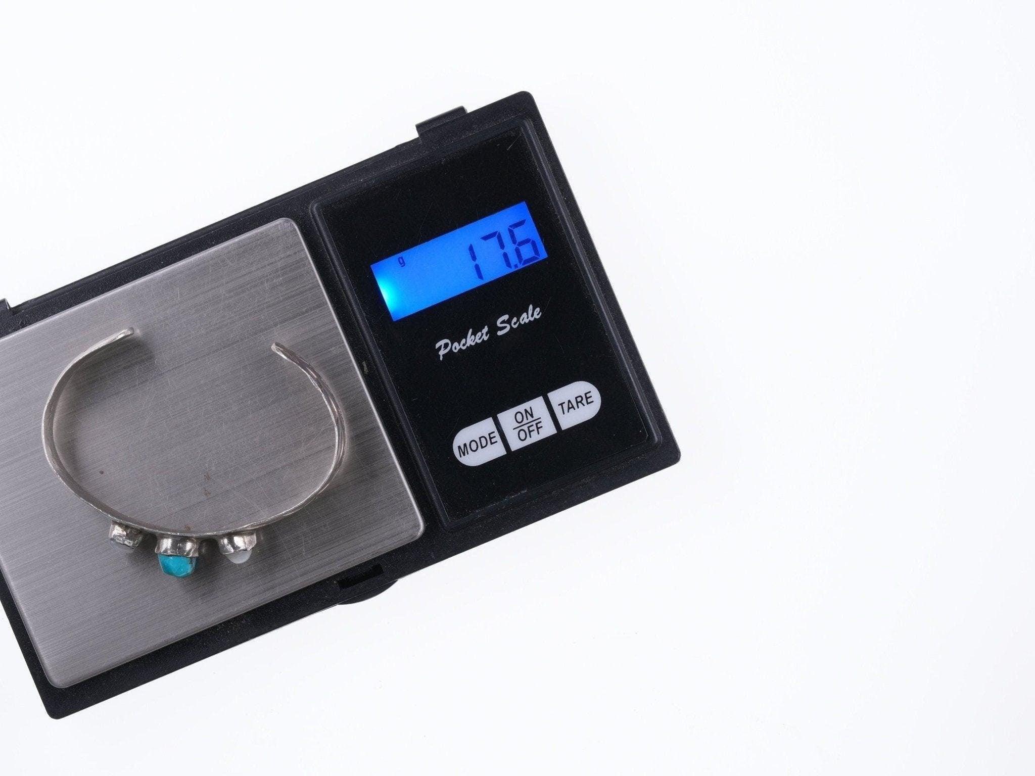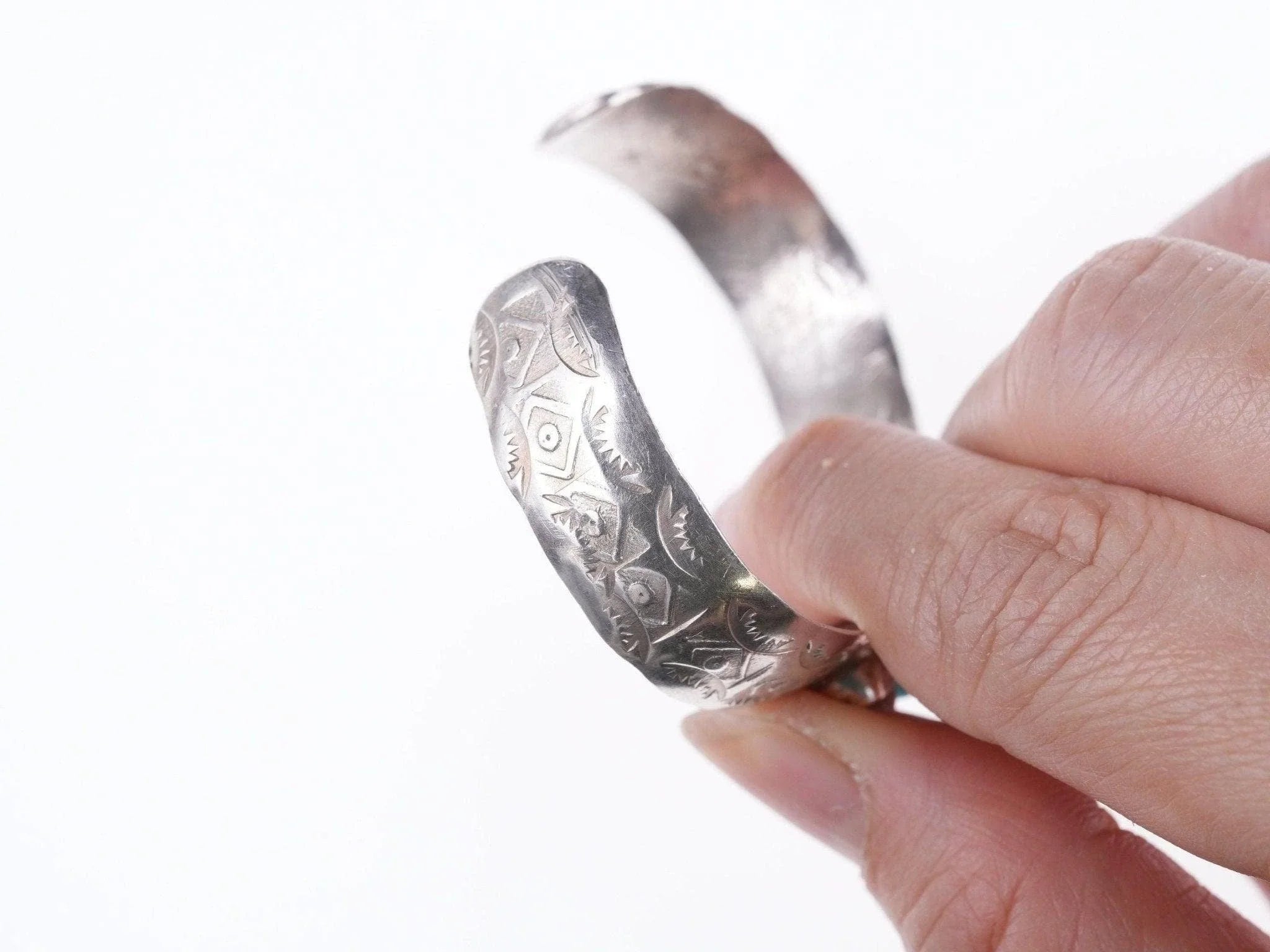 5 3/8" Navajo stamped silver - turquoise and mother of pearl bracelet. For a<br>very small wrist, no issues.<br><br>All precious metals are tested and guaranteed, any Native American jewelry<br>referred to as Silver or Sterling is guaranteed to be a minimum of 90% (coin)<br>silver and possibly higher content. Anything marked is guaranteed to be what<br>it's marked, most bracelets are photographed on a 6" wrist (non hairy), rings<br>photographed on the appropriate sized finger when possible. With bracelets if<br>the measurement is not given in the description then inside circumference is<br>shown where the metal meets the number on the the cloth tape measure.