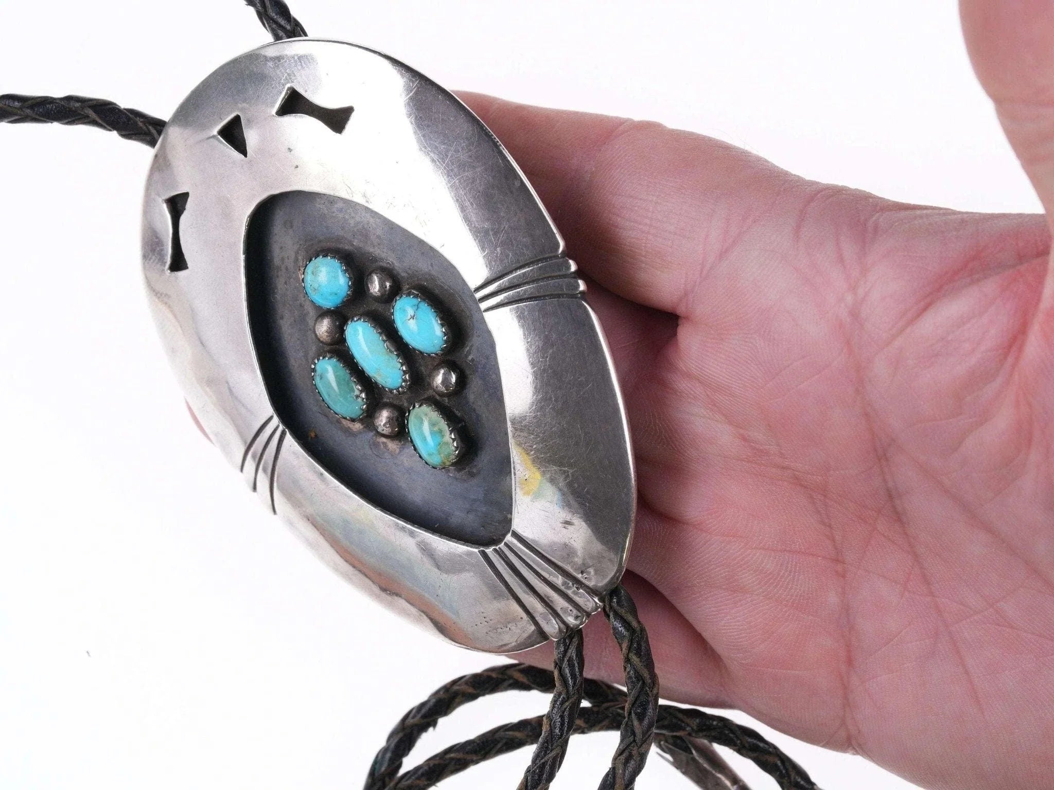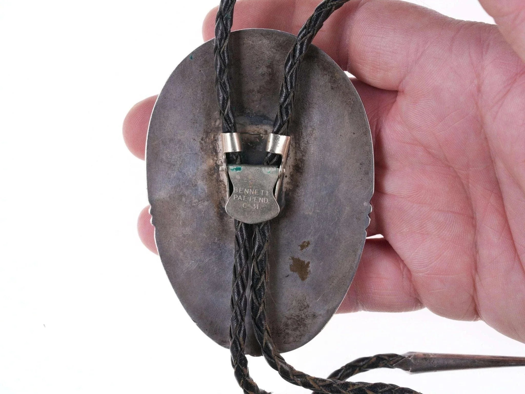 Large c1950's Navajo Sterling - Turquoise turquoise shadowbox bolo 40" long, 3<br>5/8" x 2.5" bolo slide 71.6 grams total<br><br>All precious metals are tested and guaranteed, any Native American jewelry<br>referred to as Silver or Sterling is guaranteed to be a minimum of 90% (coin)<br>silver and possibly higher content. Anything marked is guaranteed to be what<br>it's marked, most bracelets are photographed on a 6" wrist, rings photographed<br>on the appropriate sized finger when possible. With bracelets if the measurement<br>is not given in the description then inside circumference is shown where the<br>metal meets the number on the the cloth tape measure.