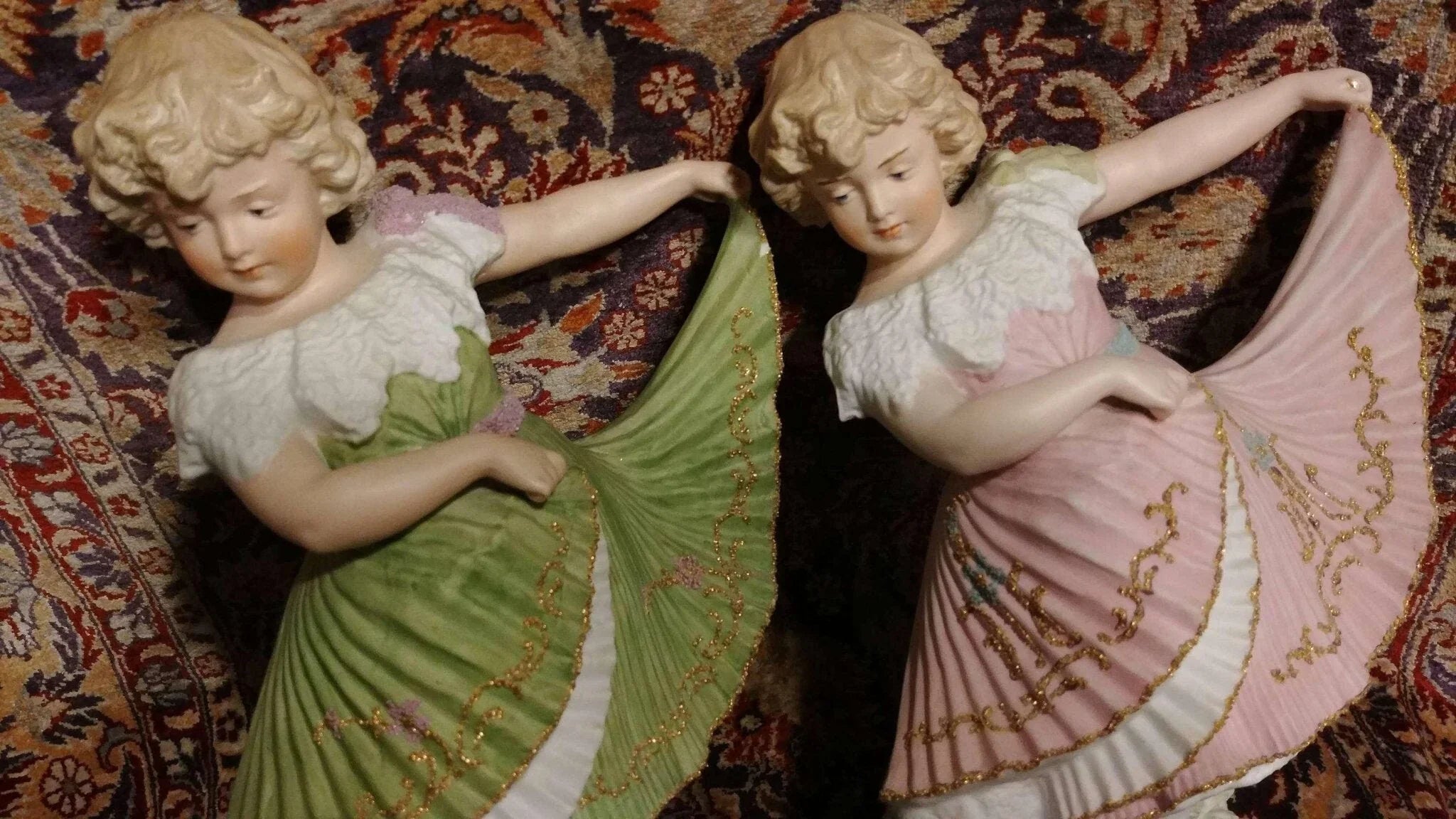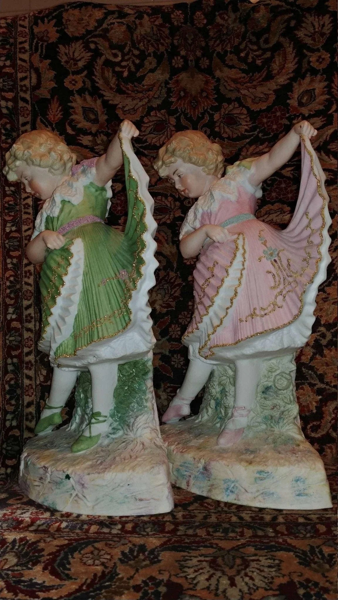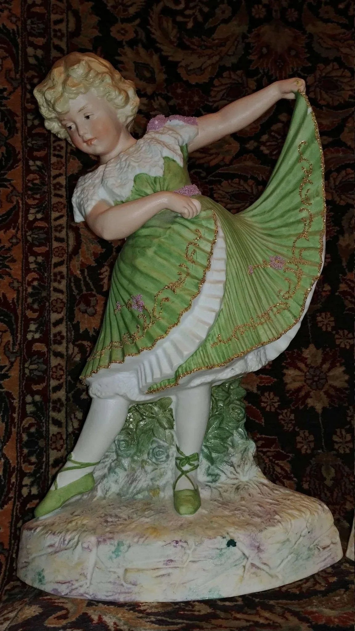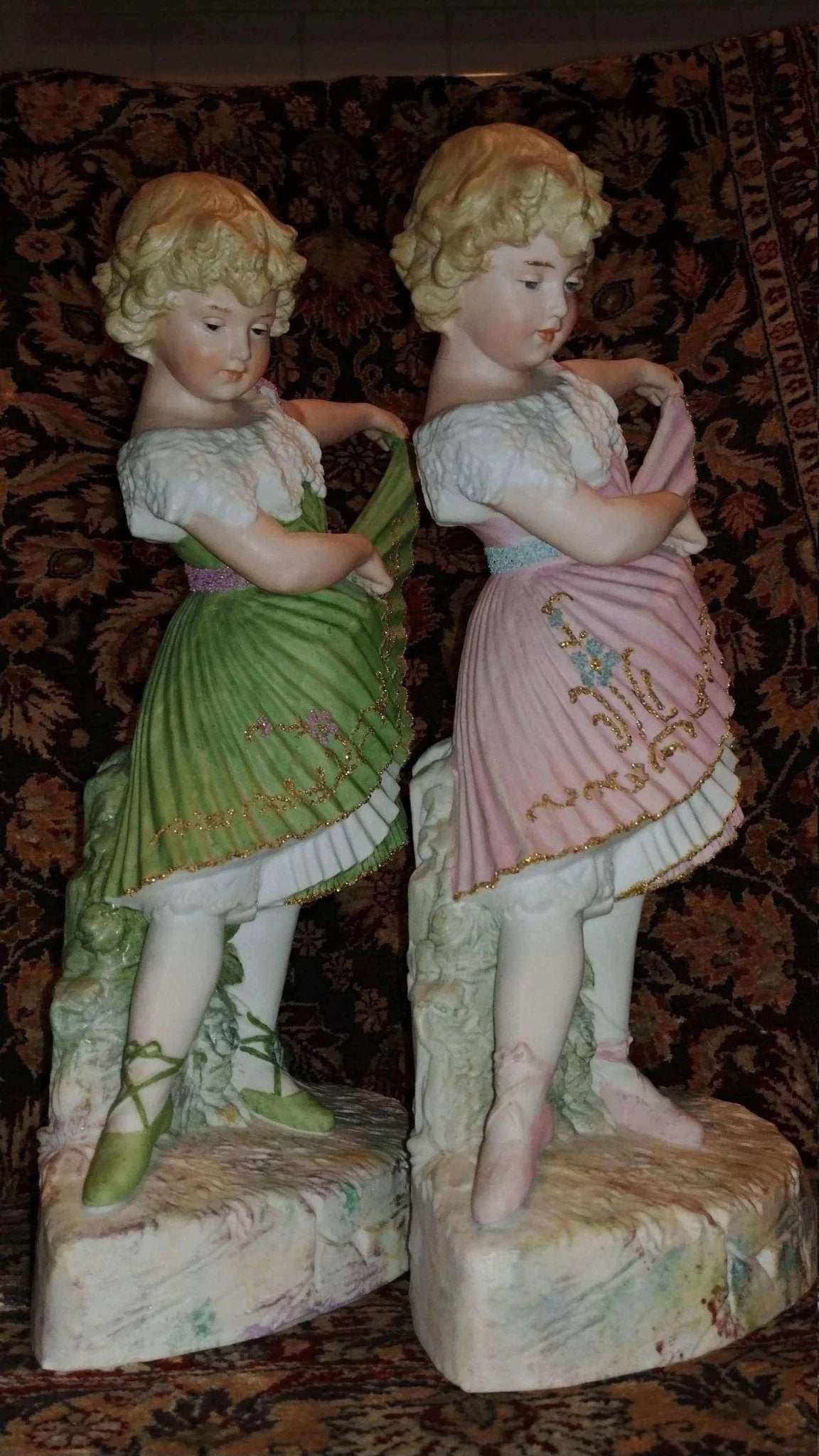Both signed Heubach, they measure 13" tall x 8" wide. The green dress one has a<br>very small chip on her dress at the top right close to her hand and one more on<br>the base left corner, also a factory firing flaw below the mark, no other damage<br>whatsoever. The one with the pink dress has a very small chip below the mark on<br>the base with no other damage whatsoever. They're both guaranteed Victorian<br>c.1890. They were together in the estate so I'd like to keep them together, but<br>if you're only interested in one I'd consider an offer.