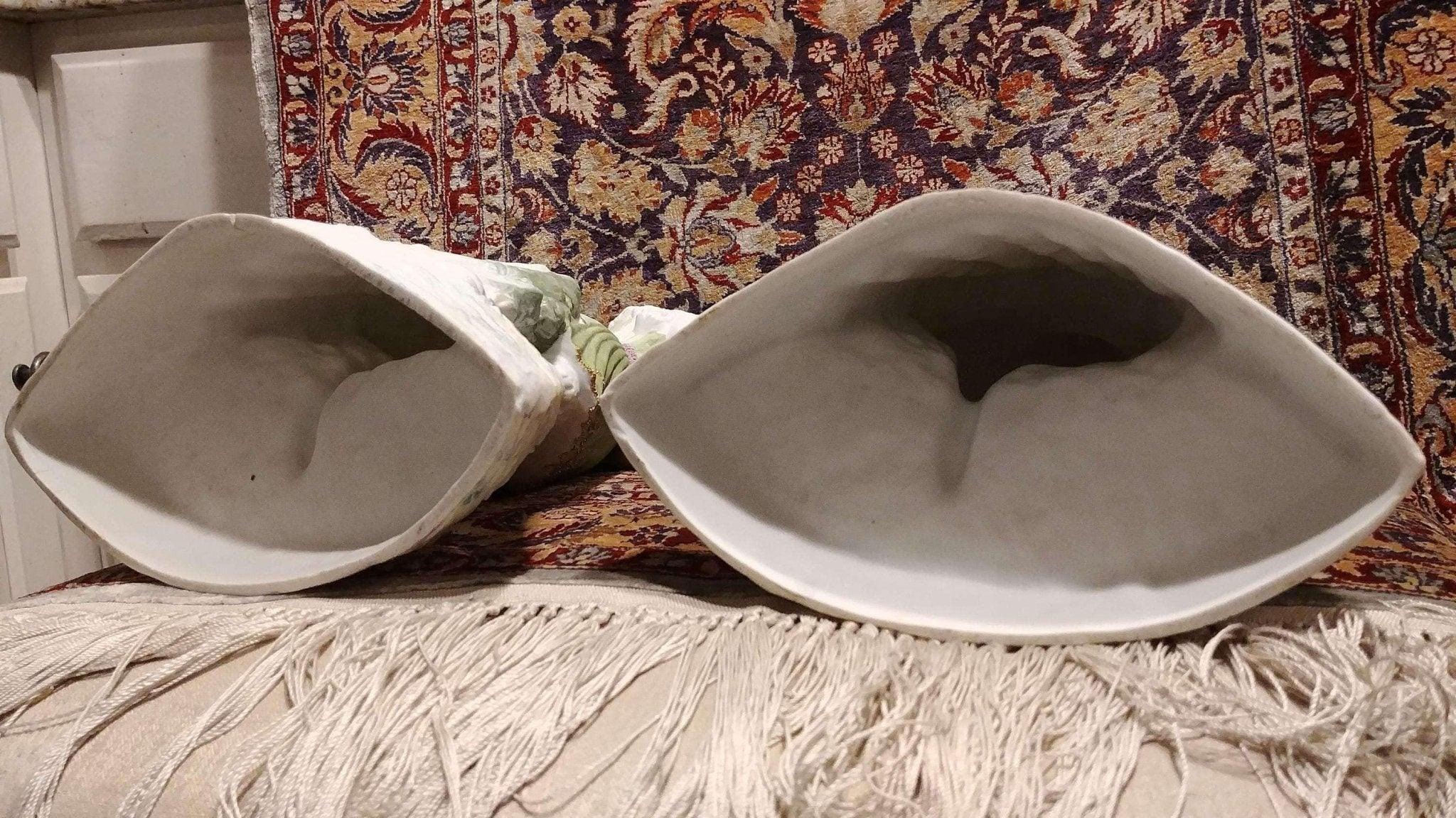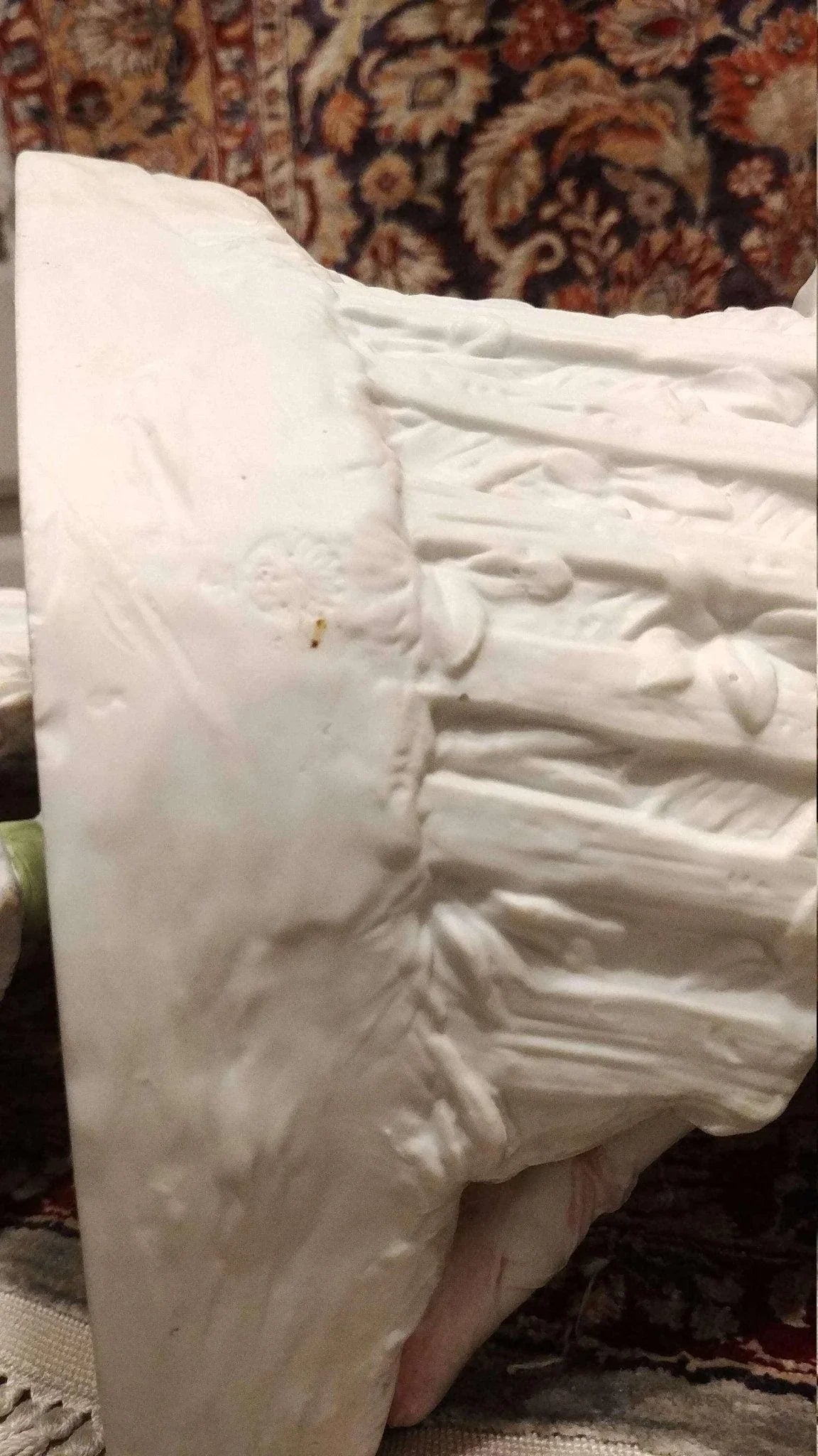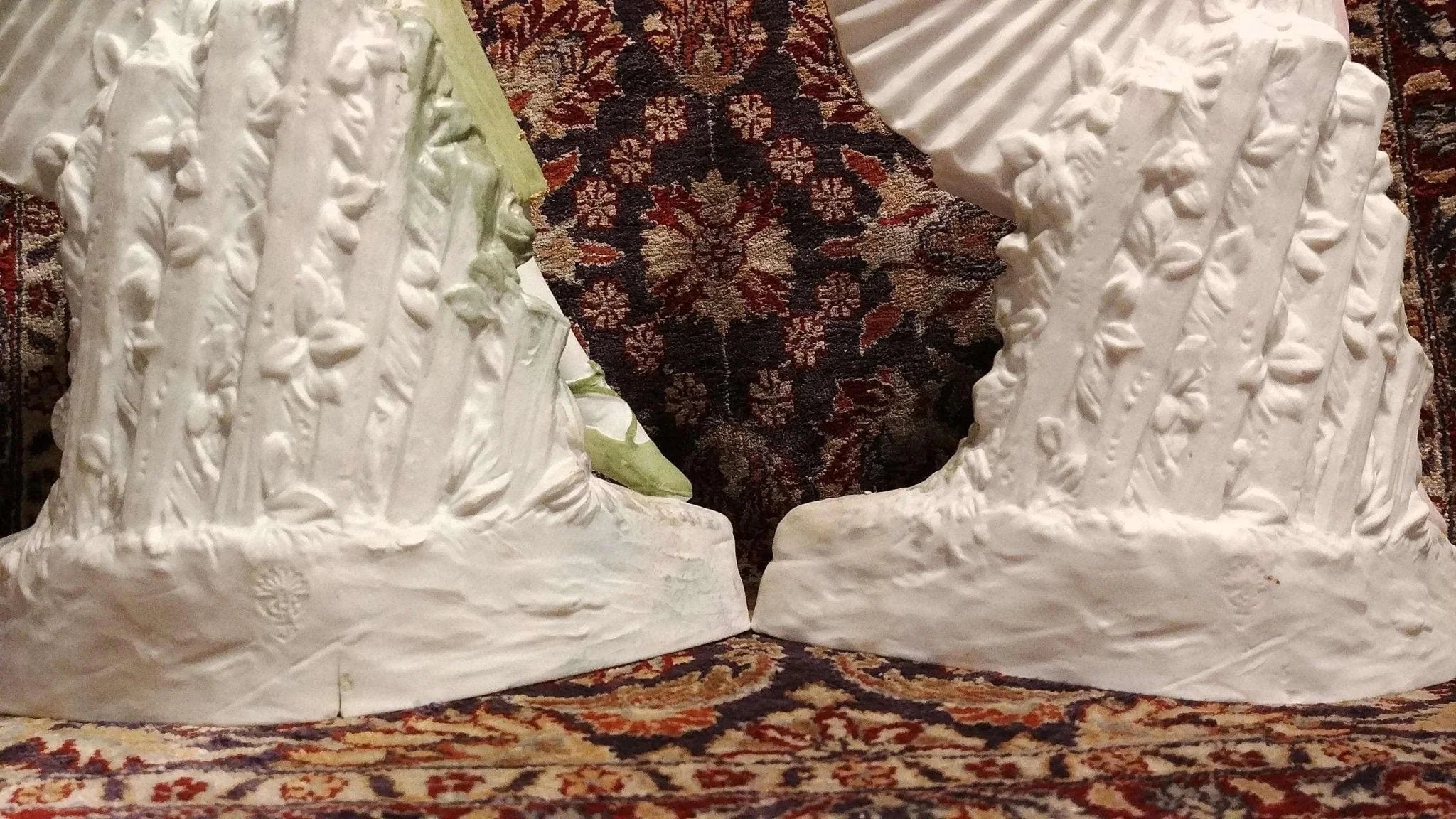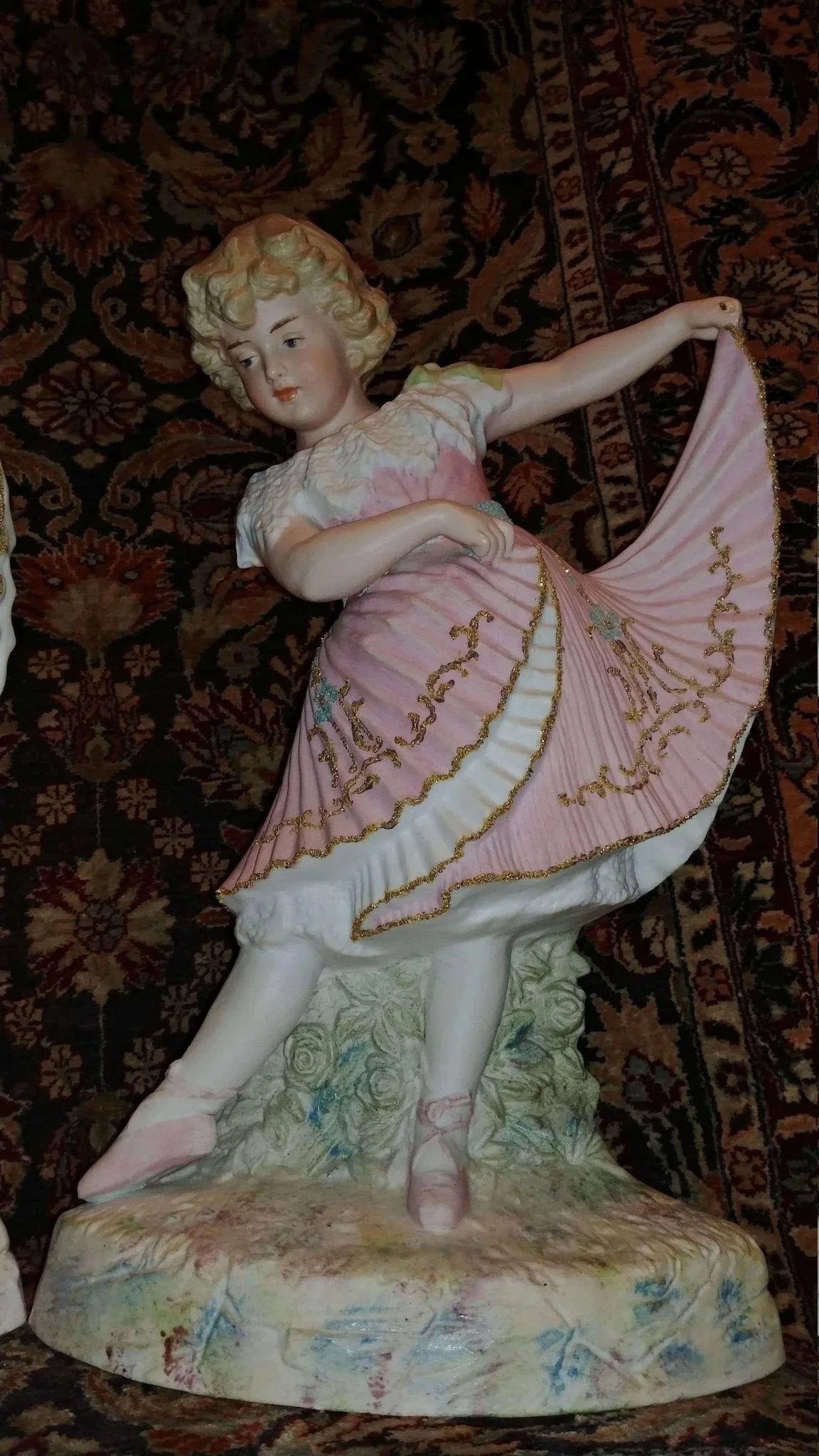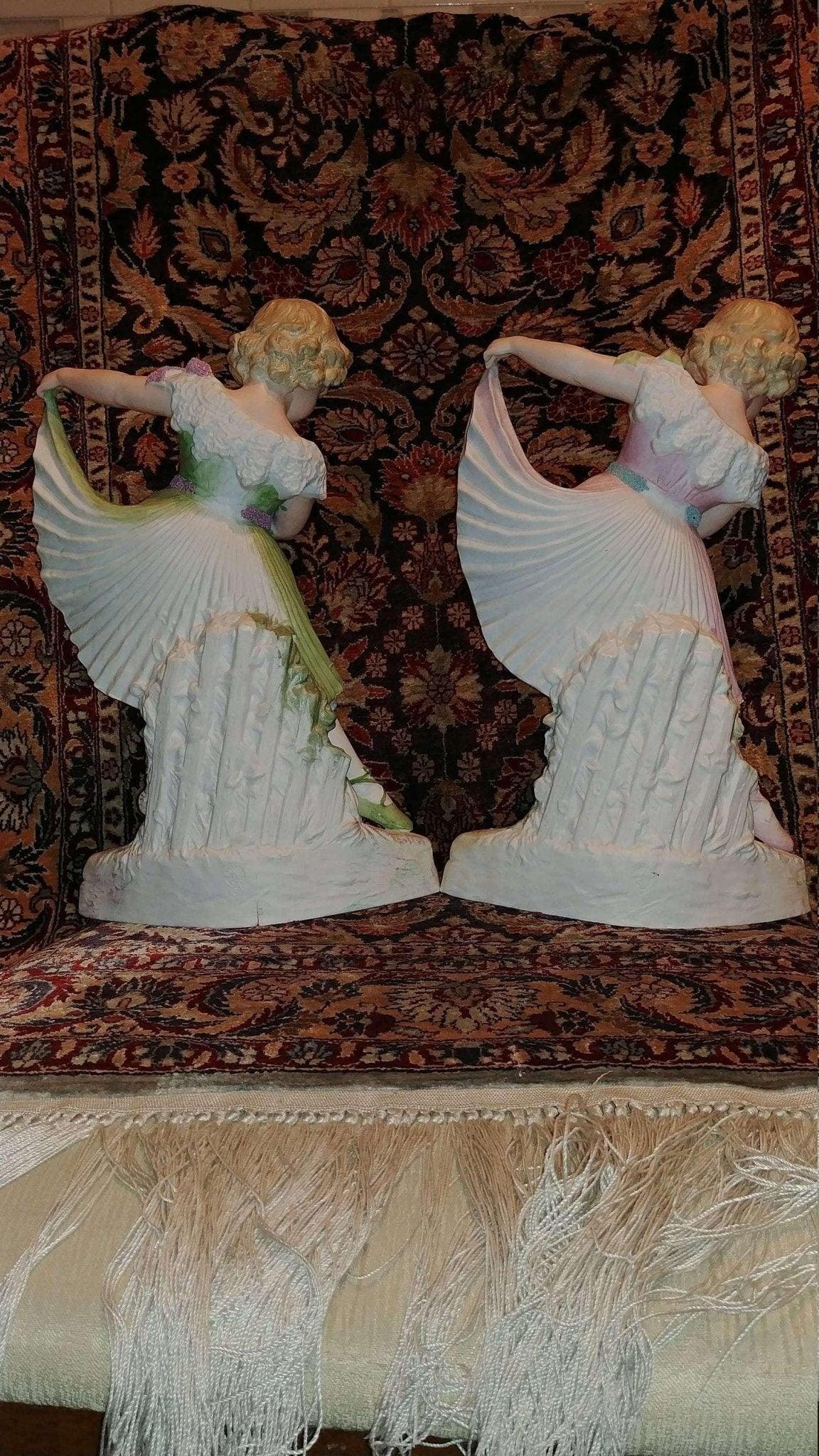 Both signed Heubach, they measure 13" tall x 8" wide. The green dress one has a<br>very small chip on her dress at the top right close to her hand and one more on<br>the base left corner, also a factory firing flaw below the mark, no other damage<br>whatsoever. The one with the pink dress has a very small chip below the mark on<br>the base with no other damage whatsoever. They're both guaranteed Victorian<br>c.1890. They were together in the estate so I'd like to keep them together, but<br>if you're only interested in one I'd consider an offer.