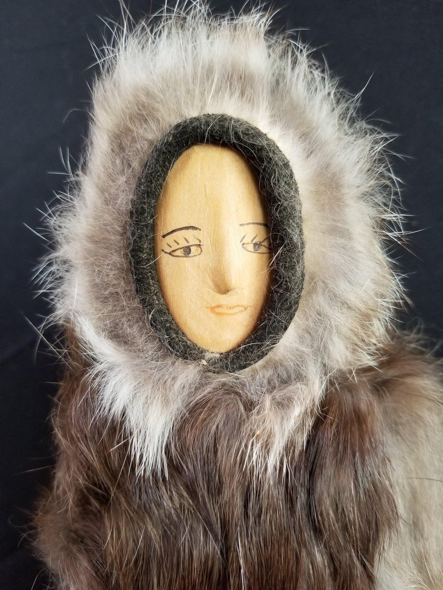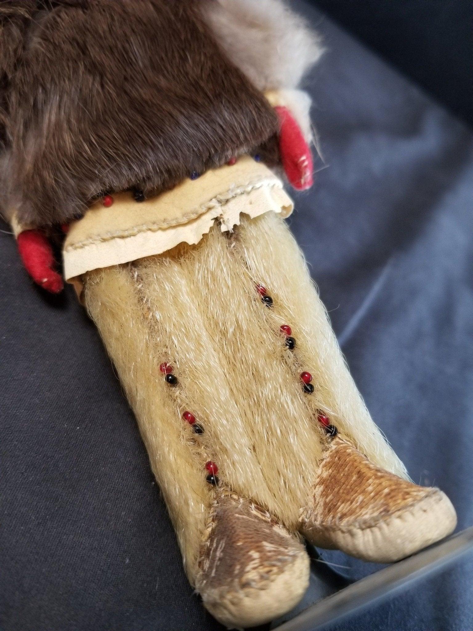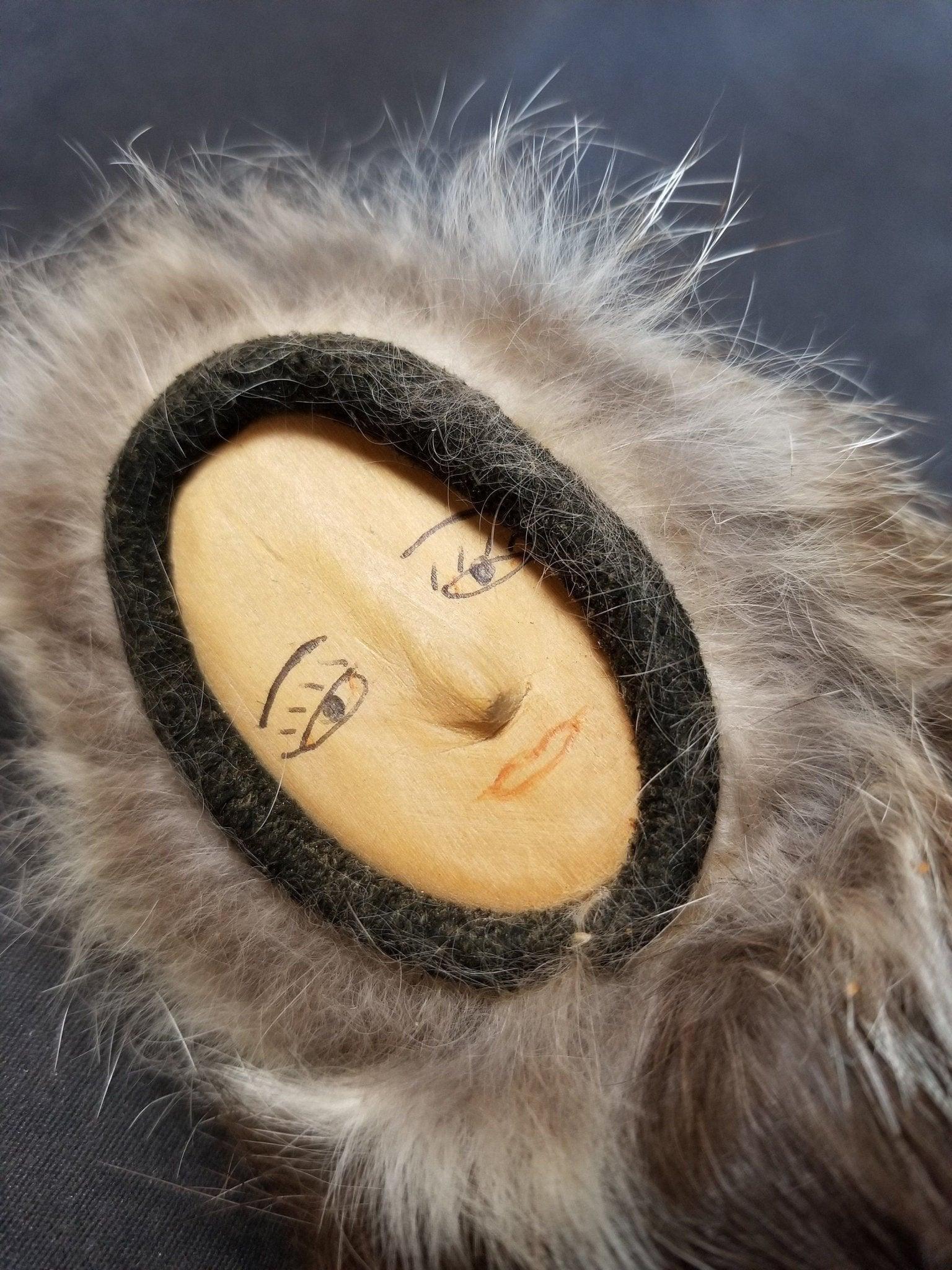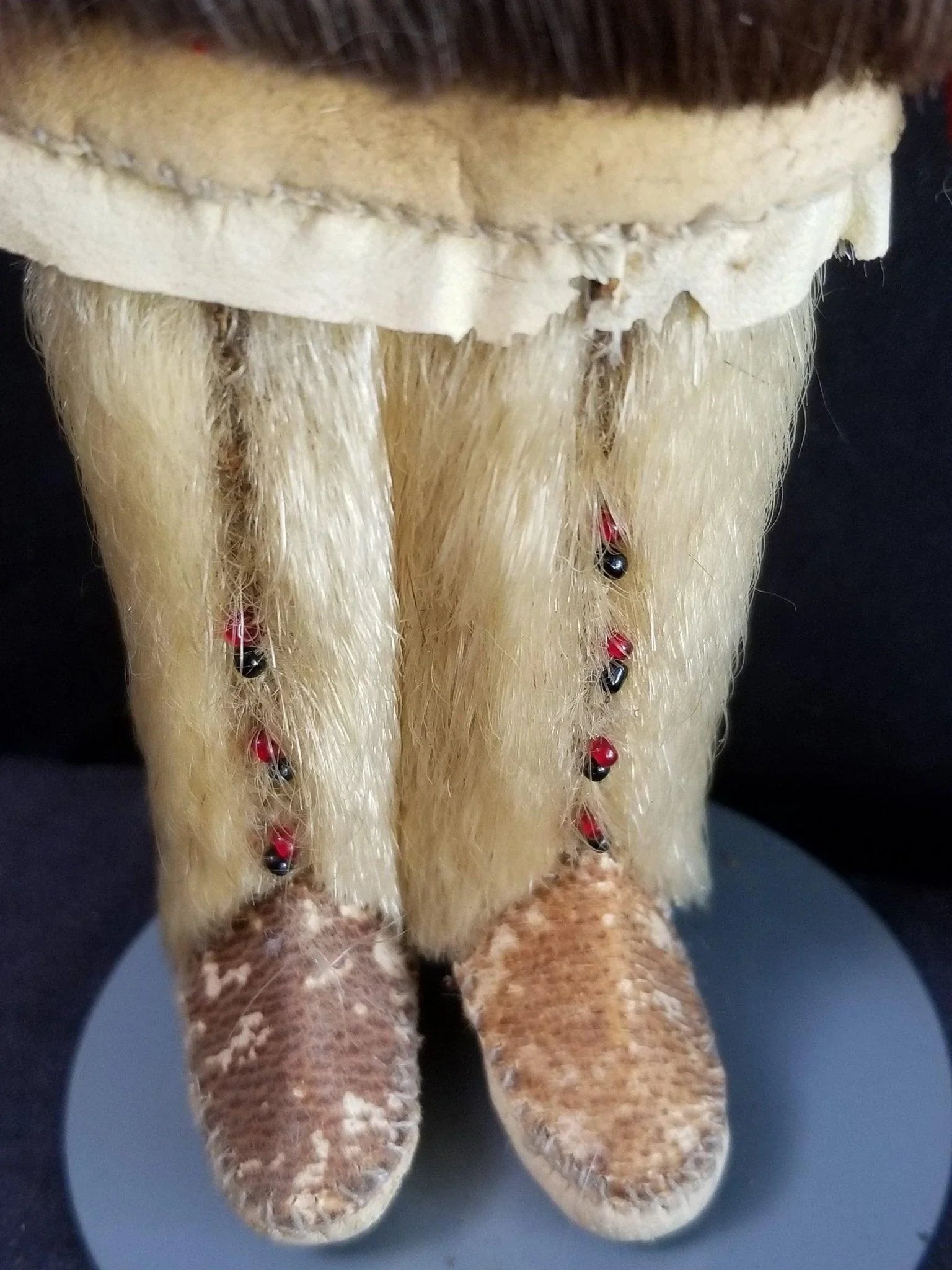 1940's Eskimo Doll Carved Wood Fur Coat glass Beads hair pants leather moccasins