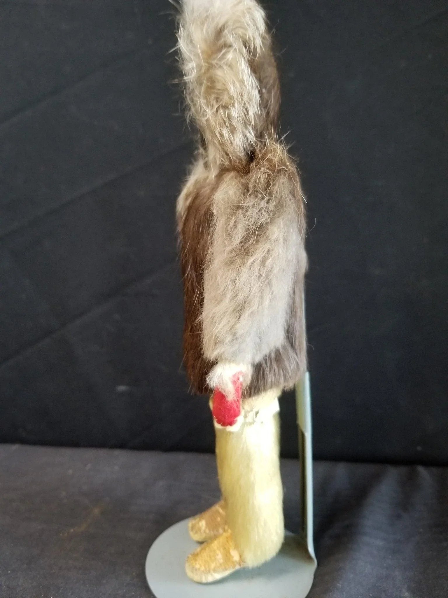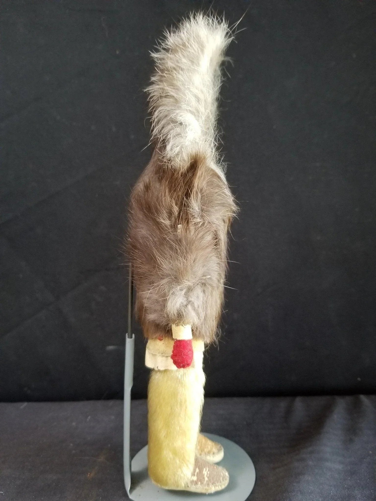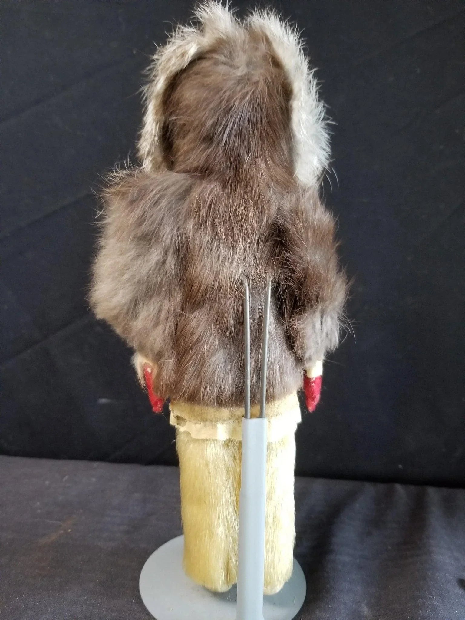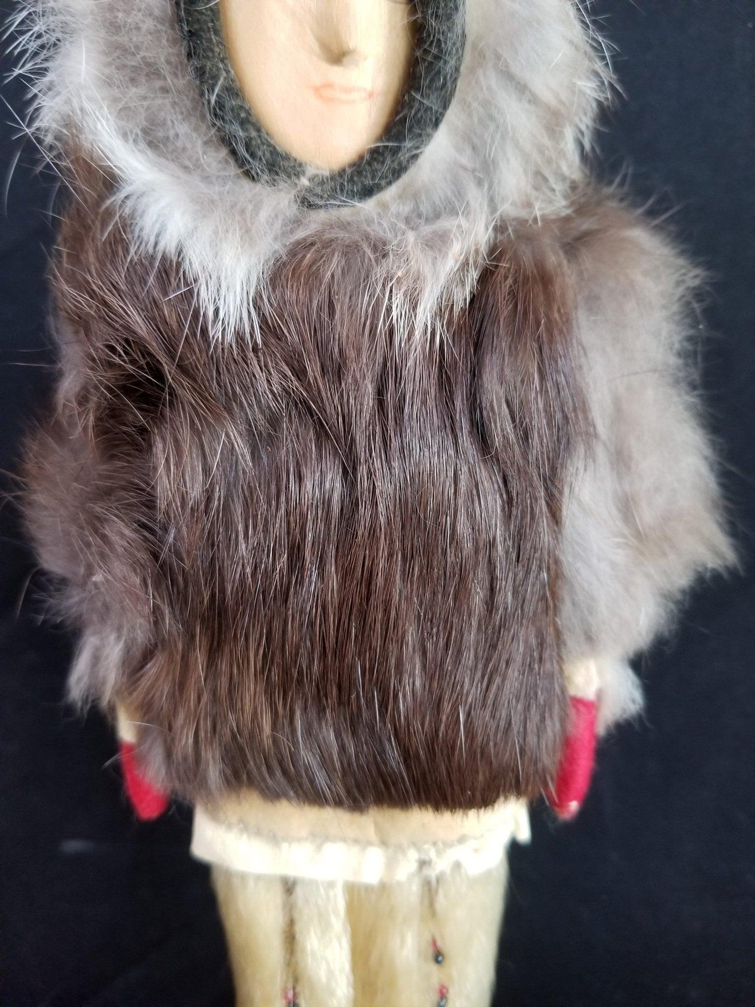 1940's Eskimo Doll Carved Wood Fur Coat glass Beads hair pants leather moccasins 9" all hand made. Hand carved. I believe the whole body is wood. Very good quality old doll. I'll include the stand