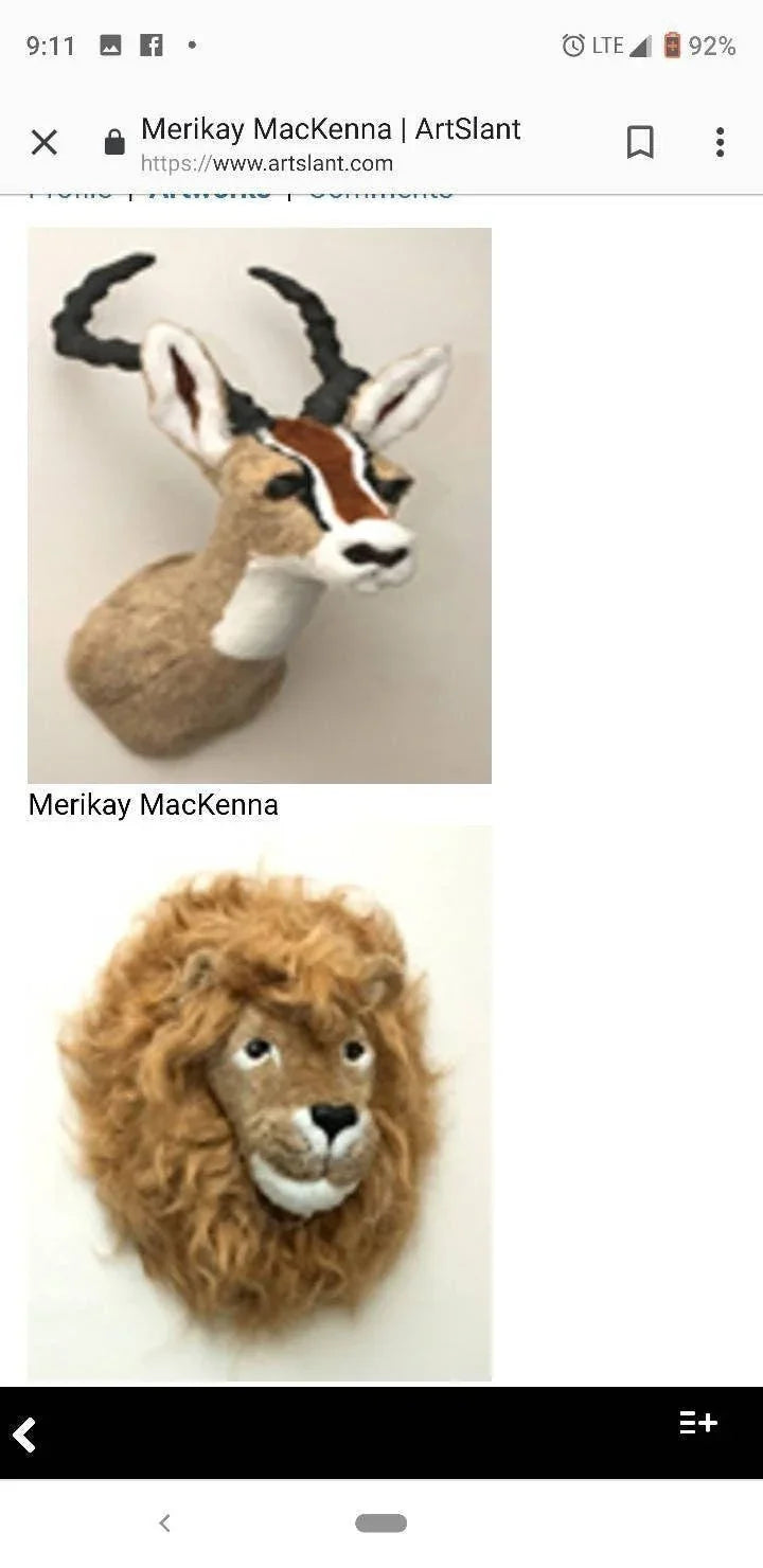 1970's Merikay Mackenna Guilt Free Animal Trophy Lion Head Taxidermy 18" Listed<br>San Francisco Artist. The last picture shows what her 2005 version of the lion<br>head looked like. As you can see there was great care put into the older<br>version, her older pieces rarely come to the open market.<br><br>MacKenna has published several books, won numerous awards and her work is<br>represented in many public and private collections throughout America. She has<br>shown her work in several gallery exhibitions.