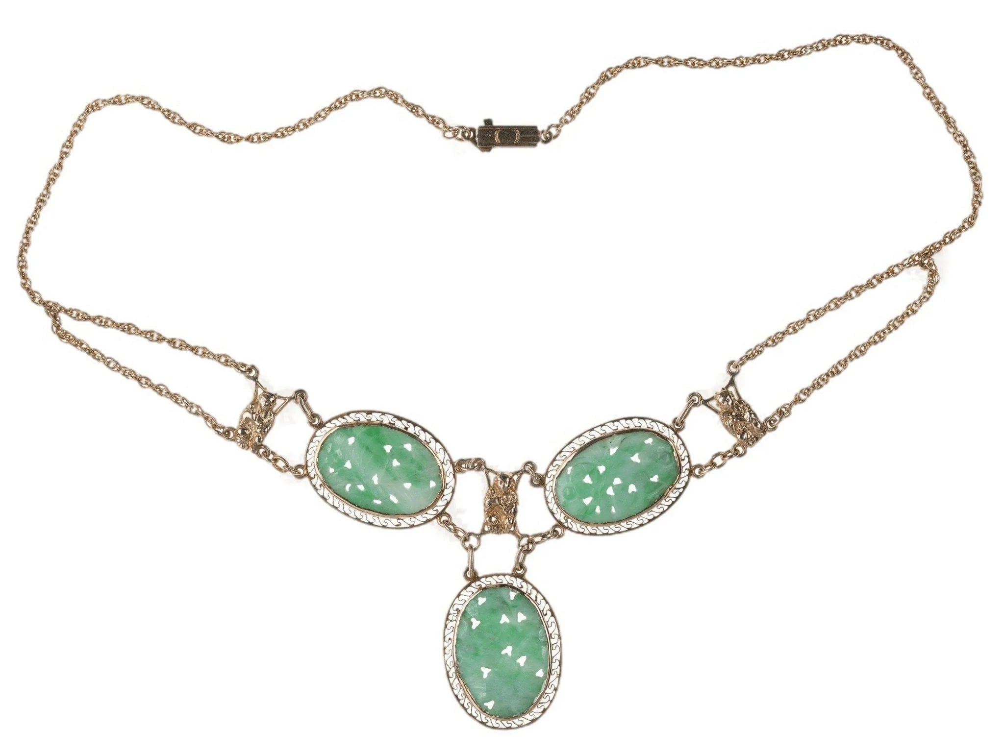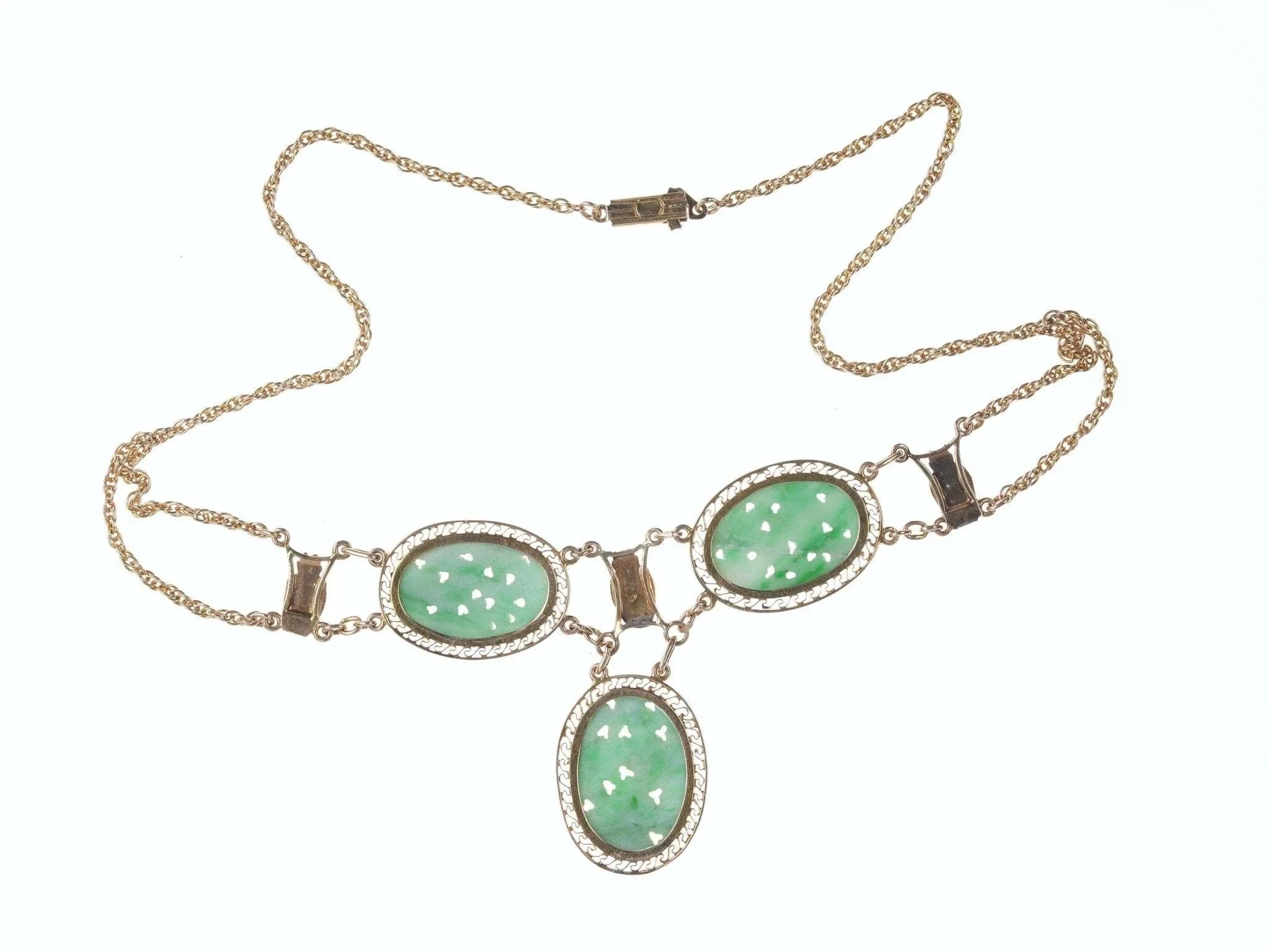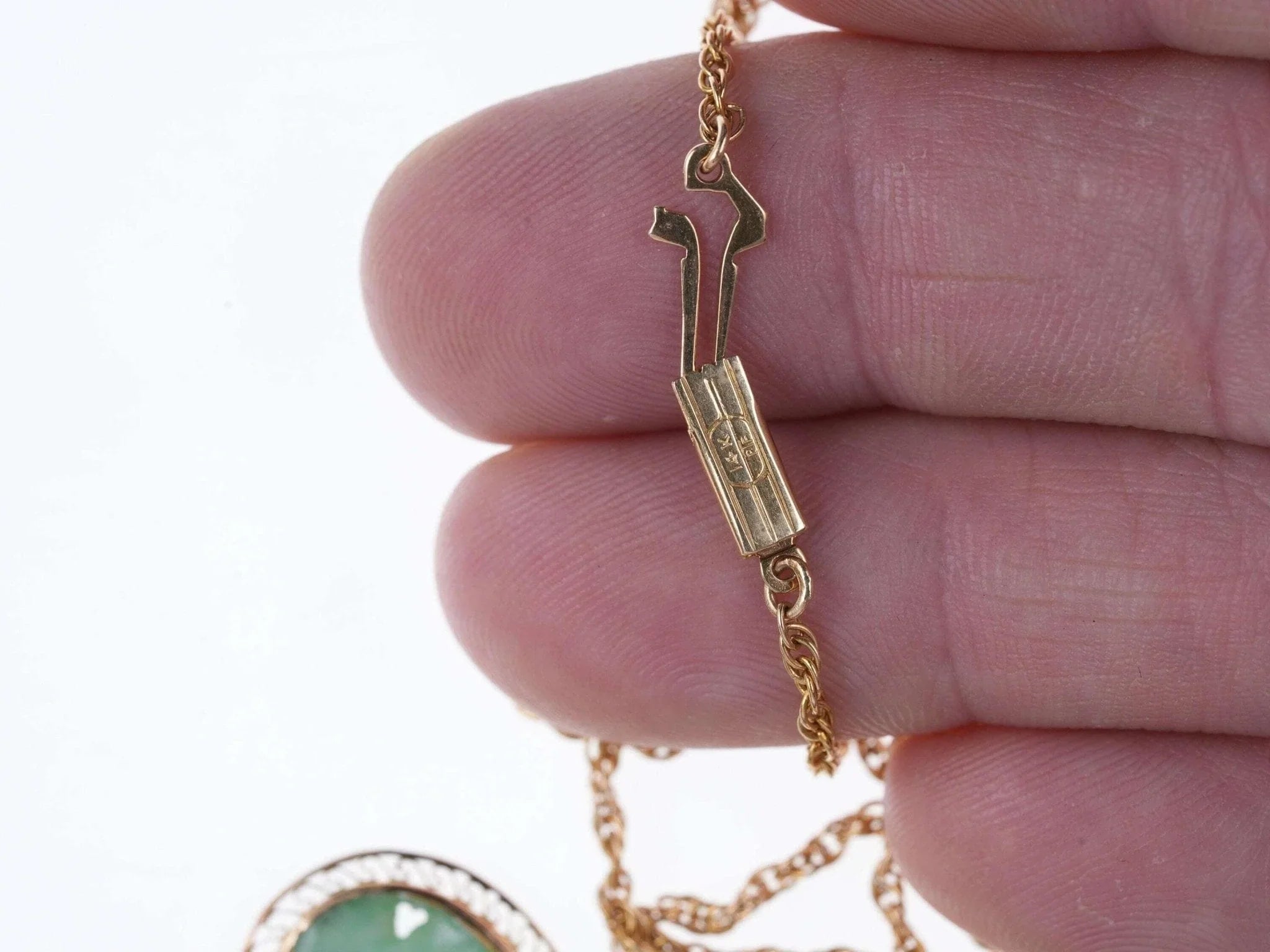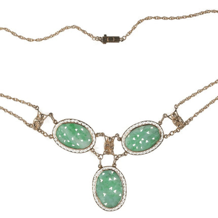 c1920's 14k/Jade Art Deco Period Necklace. Great necklace from the second<br>quarter of the 20th century with no issues. 16" long 15.5 grams, Marked and<br>tested 14k gold. Manufacturer/gold mark shown in last pic. I have seen this mark<br>on other Chinese exported jewelry from the period but I never tried to figure<br>out who it was.