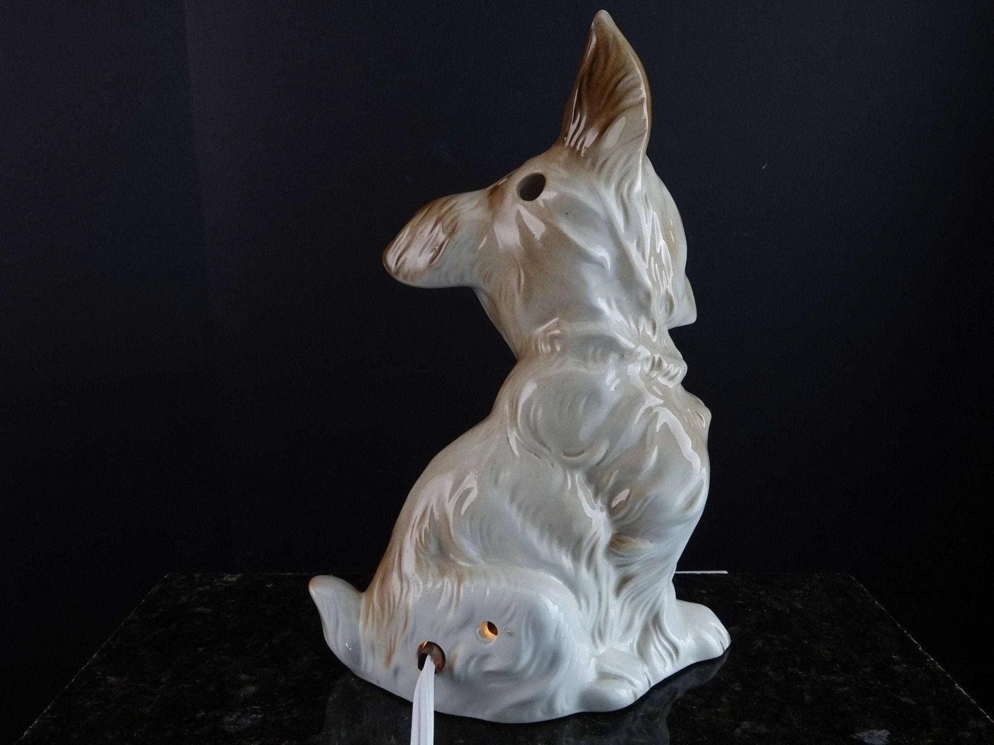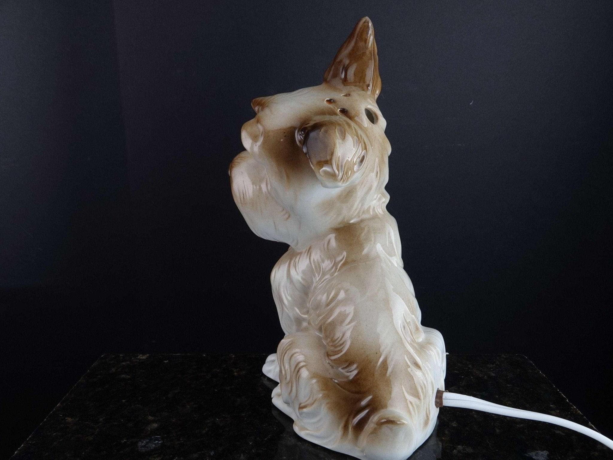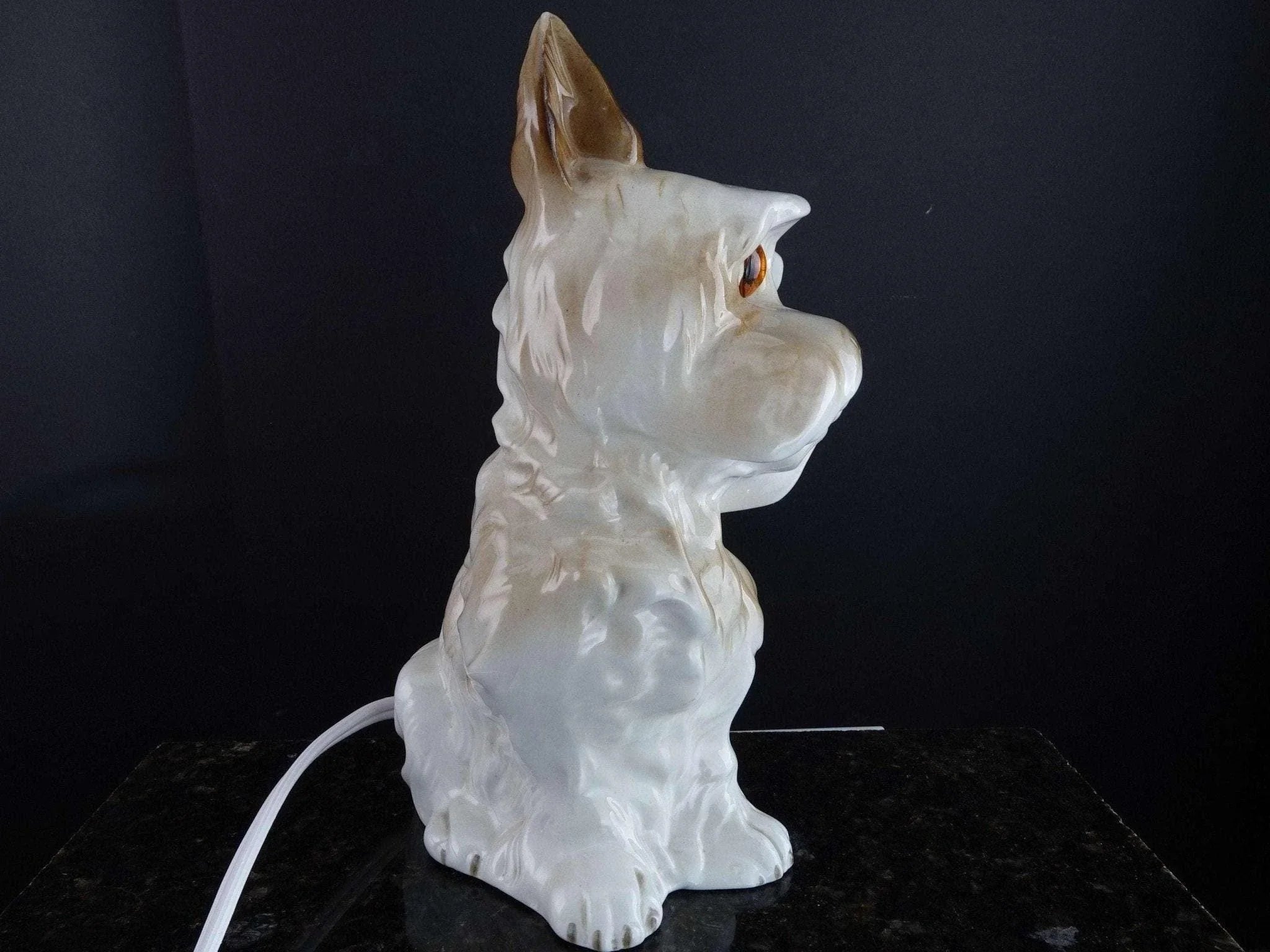 c1930 Karl Schiedig German Porcelain Scottie Dog Perfume Lamp with glass eyes 9"<br>tall with no cracks, chips, or restorations. The old cord was totally<br>deteriorated, I tried to save it but lost it before I got a chance to list this.<br>I put this new one on it, it's safe as I'm a former electrician and the switch<br>works. But I would put an led bulb in the socket as the current bulb does get<br>hot which I believe these were originally meant to do but led just makes more<br>sense these days.<br>TW5