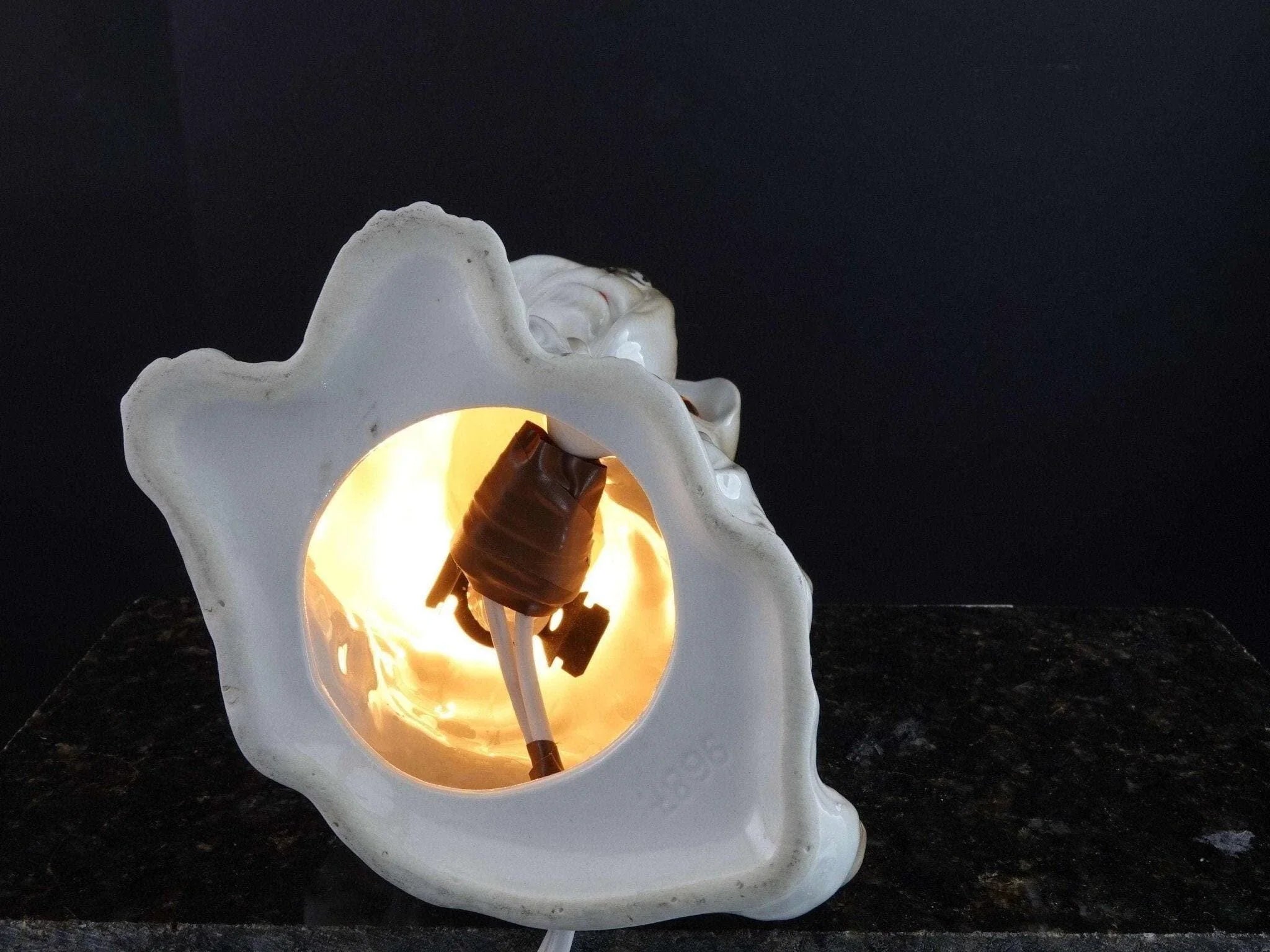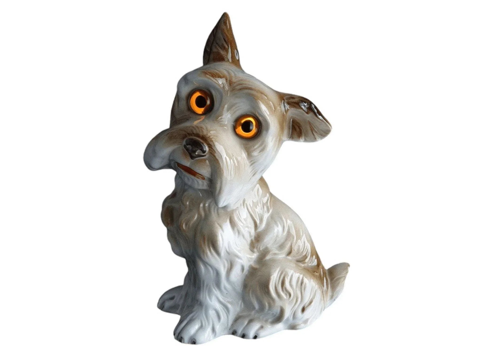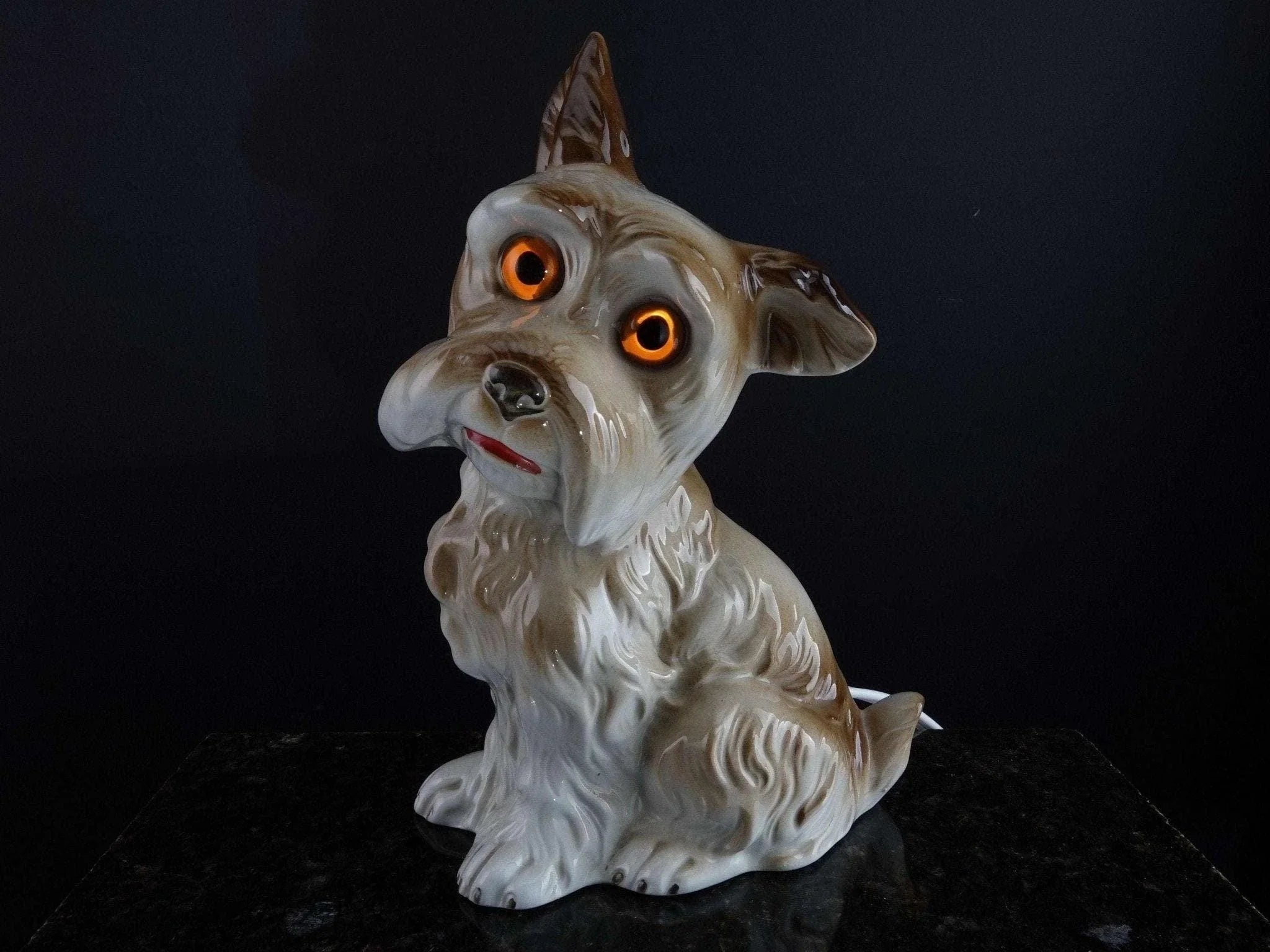 c1930 Karl Schiedig German Porcelain Scottie Dog Perfume Lamp with glass eyes 9"<br>tall with no cracks, chips, or restorations. The old cord was totally<br>deteriorated, I tried to save it but lost it before I got a chance to list this.<br>I put this new one on it, it's safe as I'm a former electrician and the switch<br>works. But I would put an led bulb in the socket as the current bulb does get<br>hot which I believe these were originally meant to do but led just makes more<br>sense these days.<br>TW5