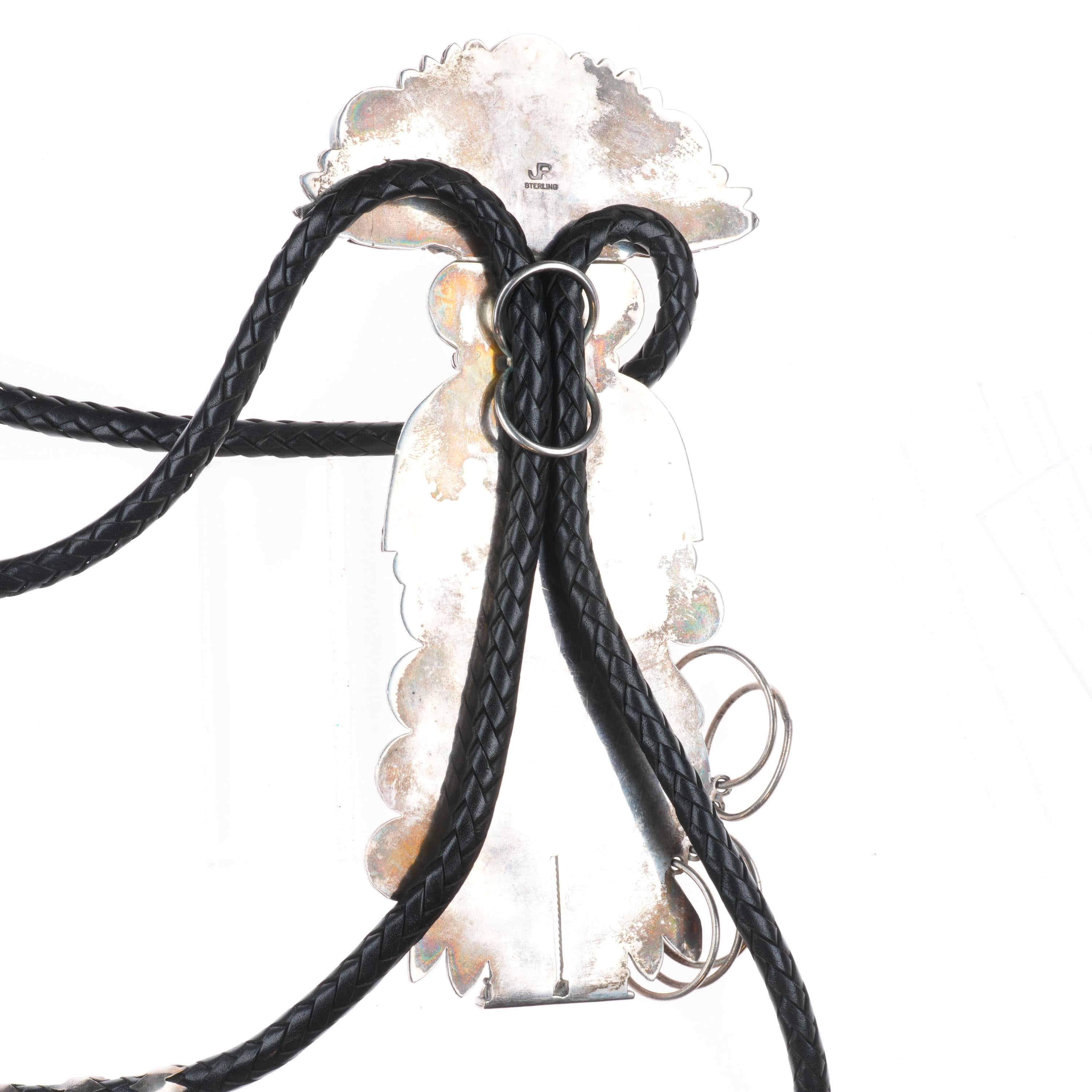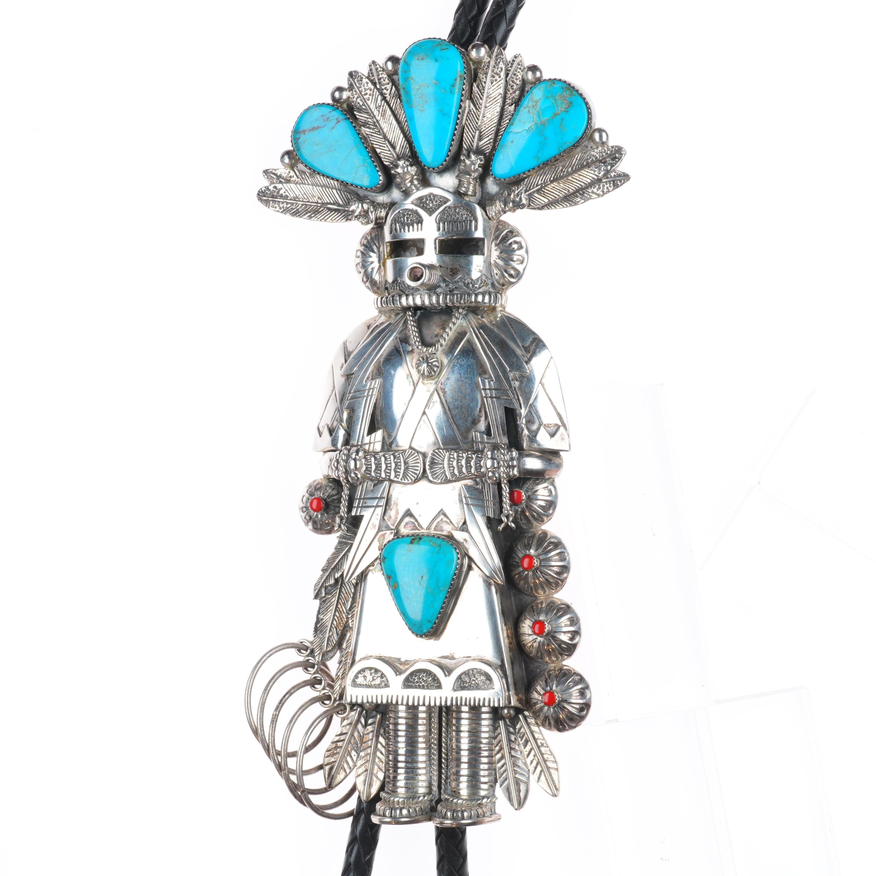 Huge Jerry Roan Navajo sterling silver turquoise/coral Kachina bolo tie