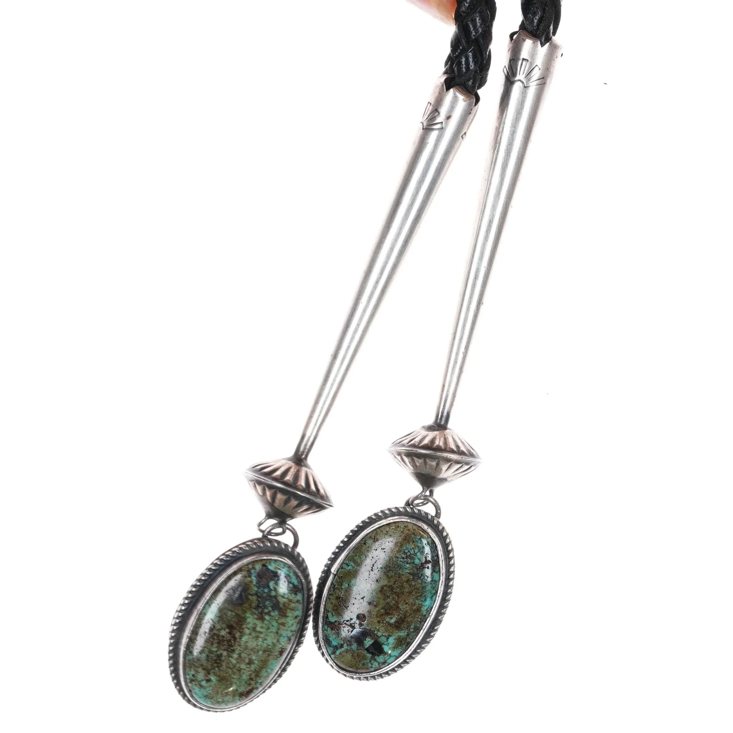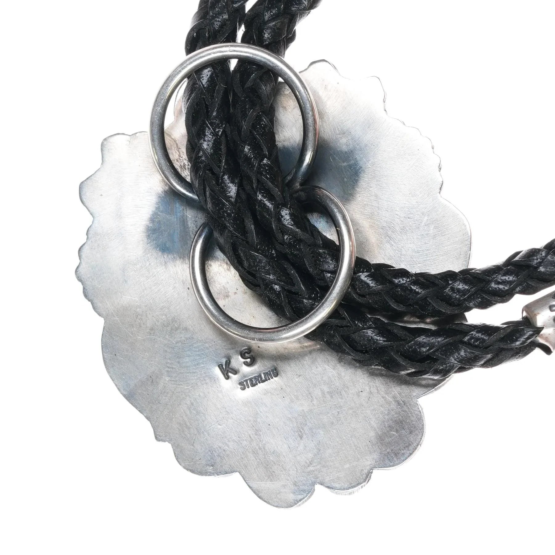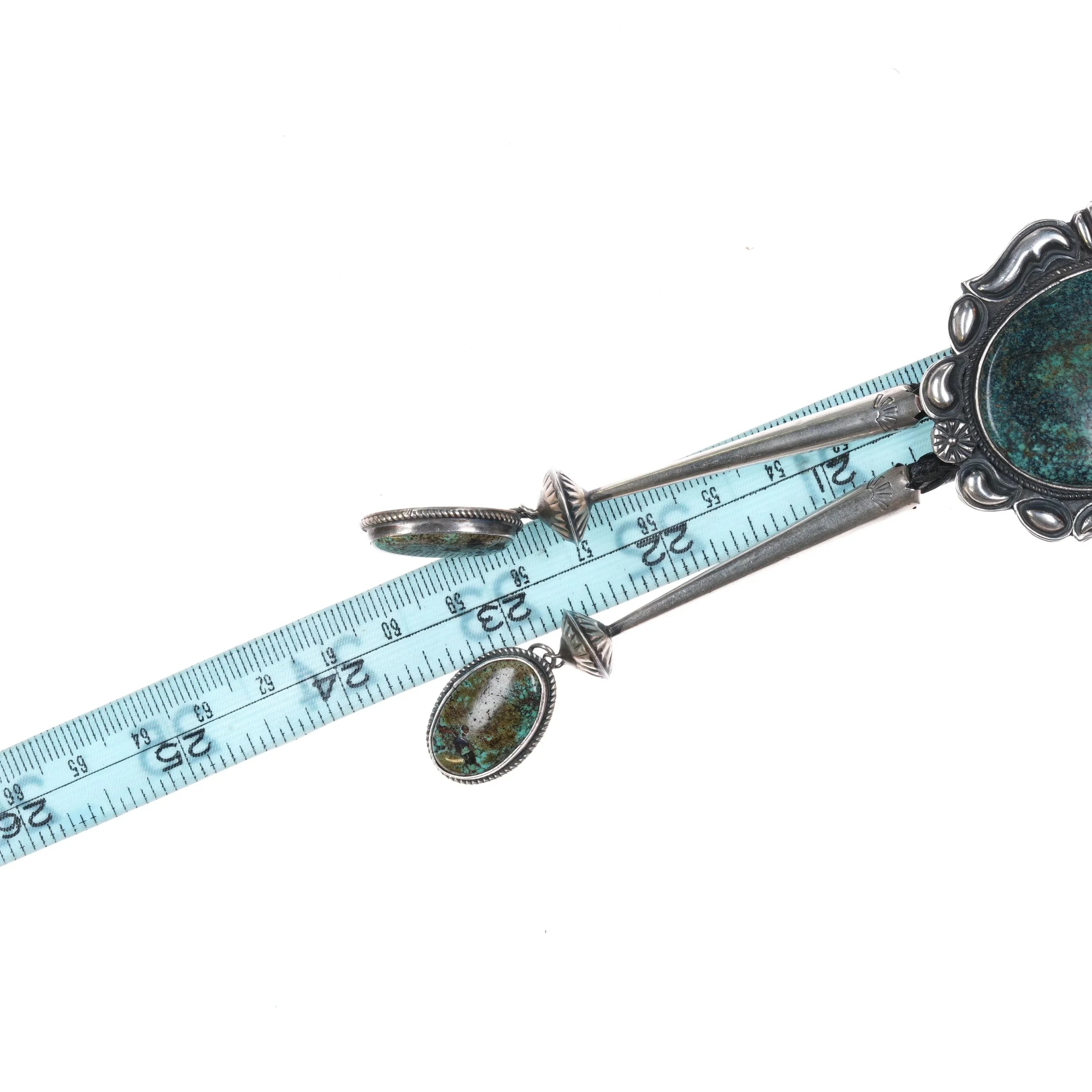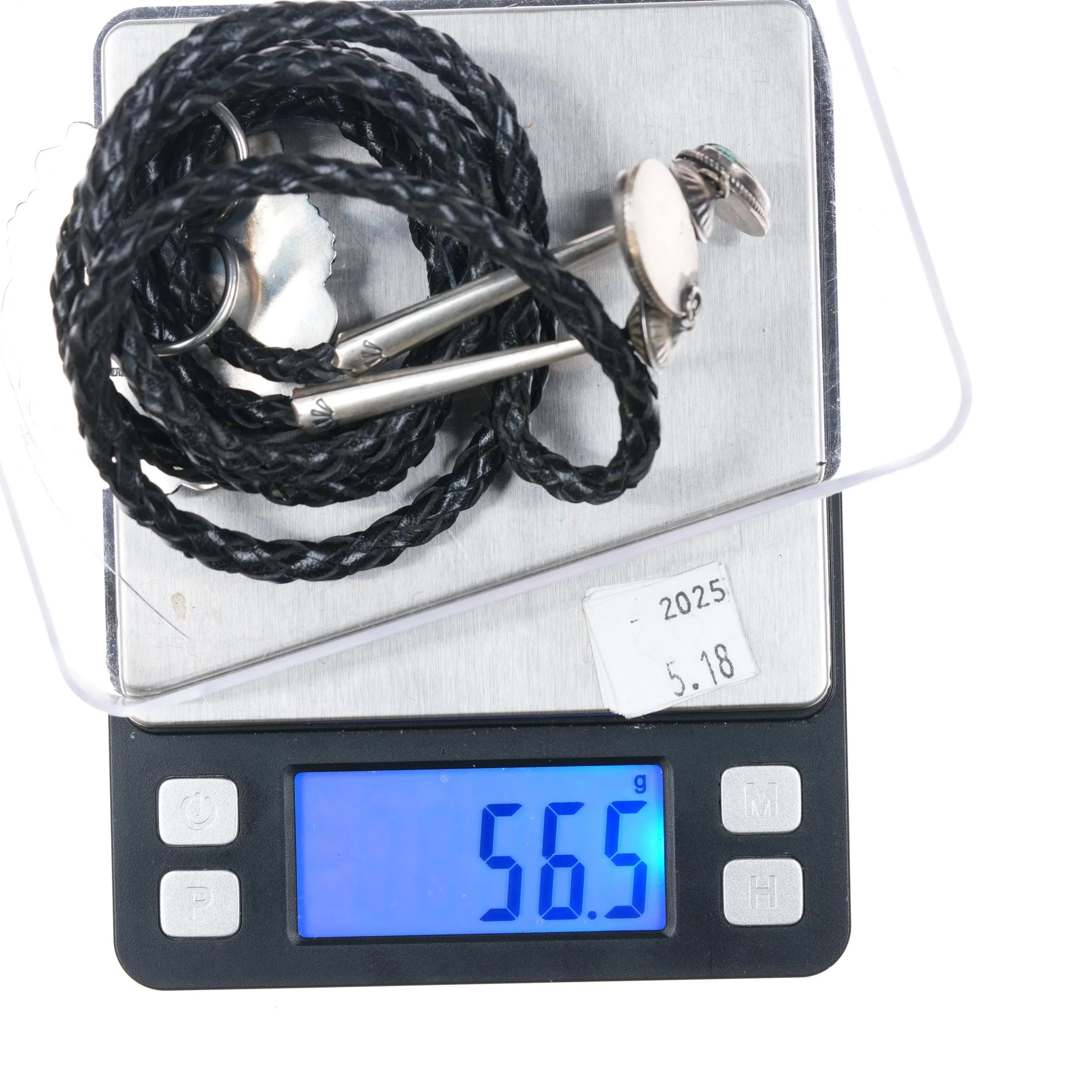 Kirk Smith Navajo Sterlng silver and turquoise bolo tie with fancy tips. Solid sterling silver (tested) with no issues. Weight and measurements in pictures. Overall good condition, tested sterling, marked as shown. 47" long.