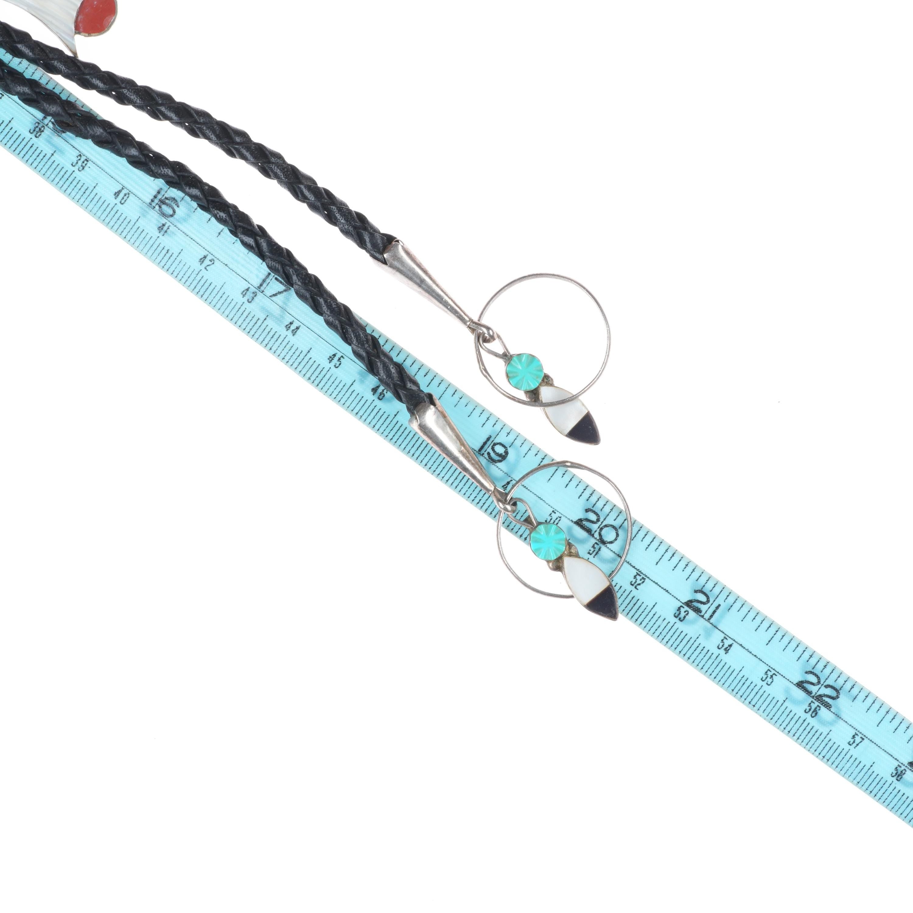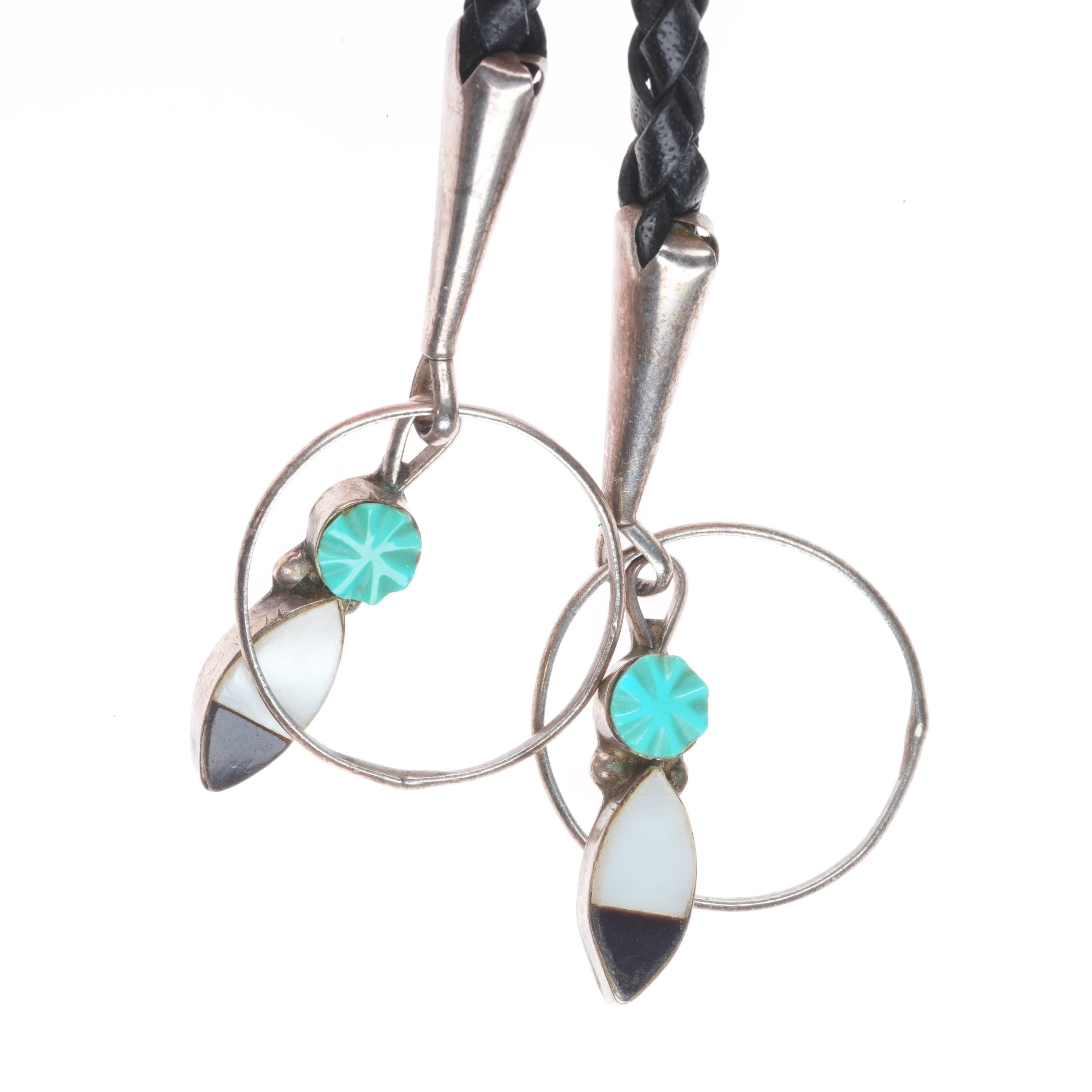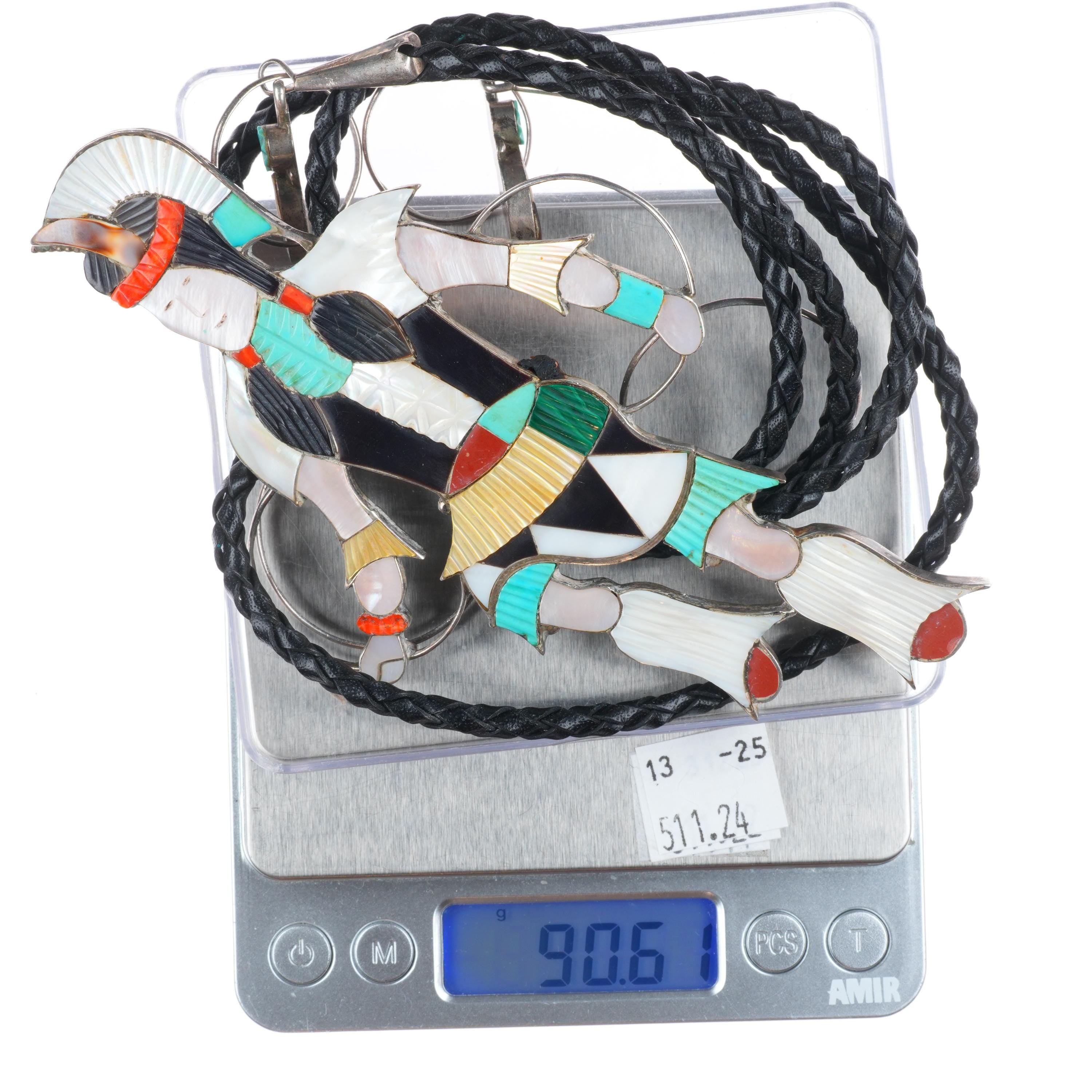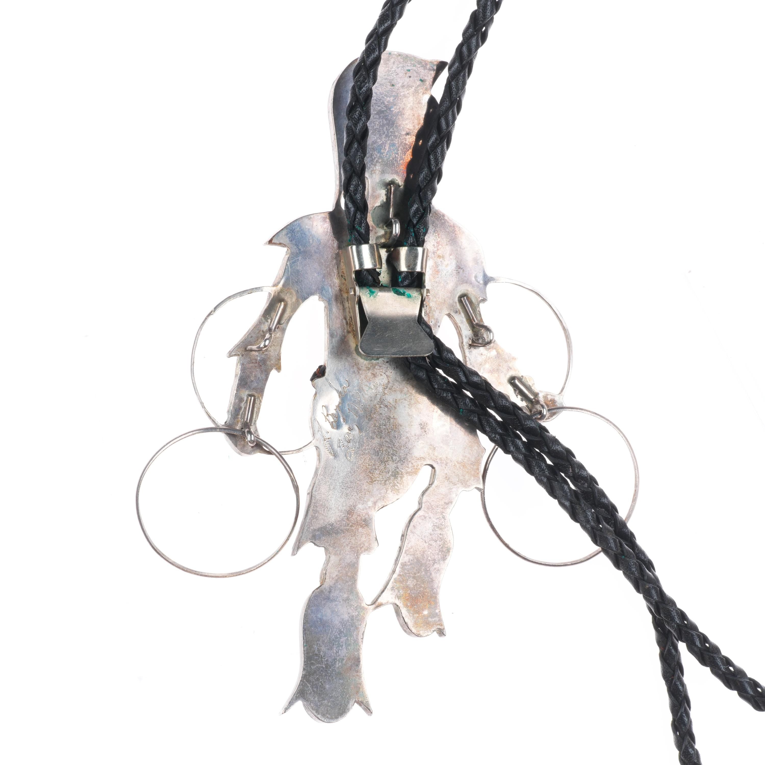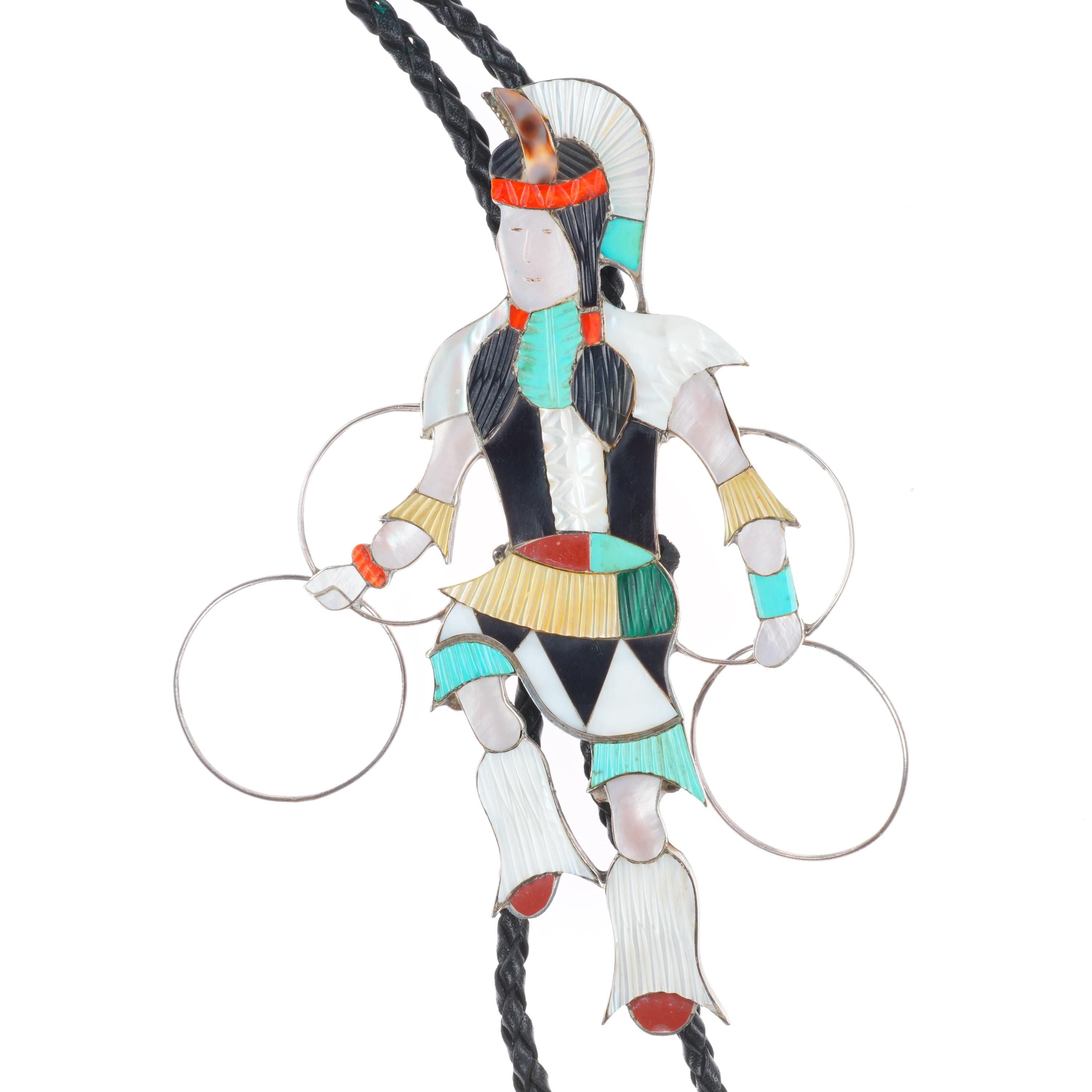 Large Jonathan Beyuka Zuni sterling silver carved stone Hoop Dancer bolo tie. Tested and guaranteed solid sterling silver slide and tips. Weight and measurements in pictures. Circa last quarter of the 20th century.