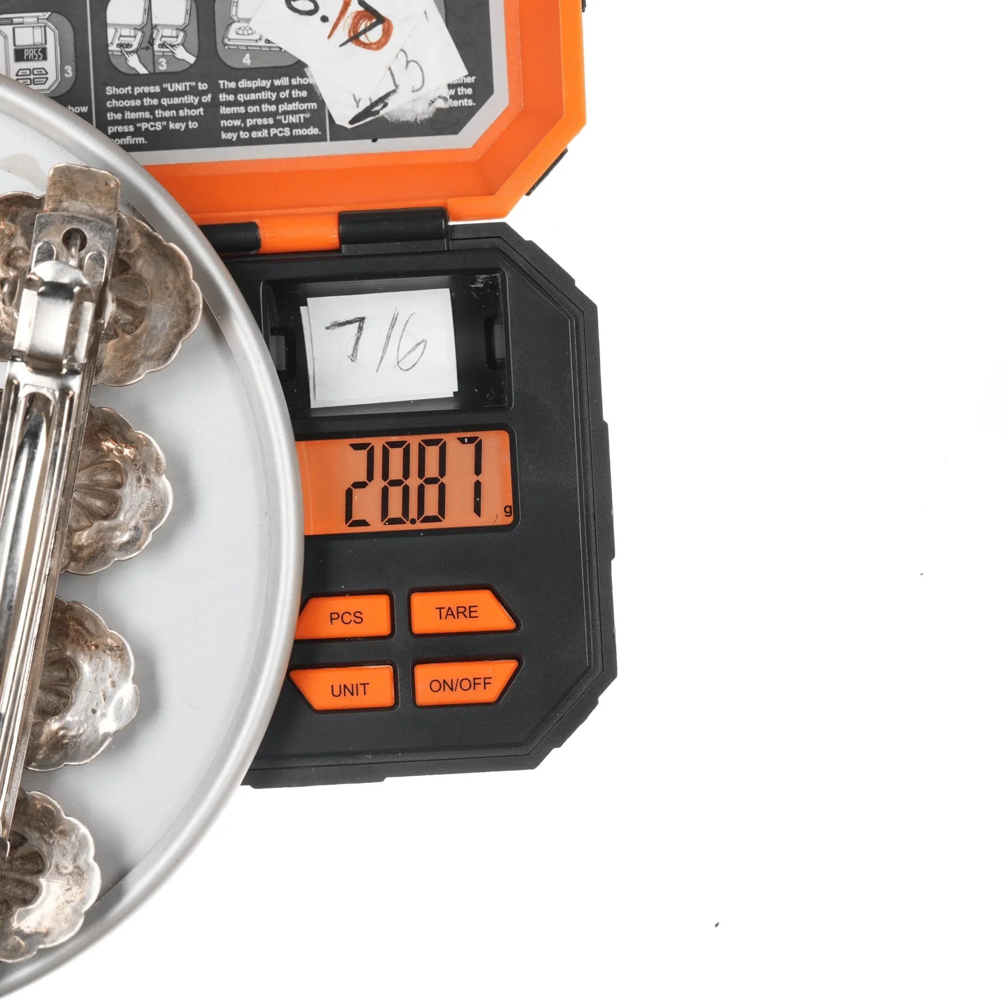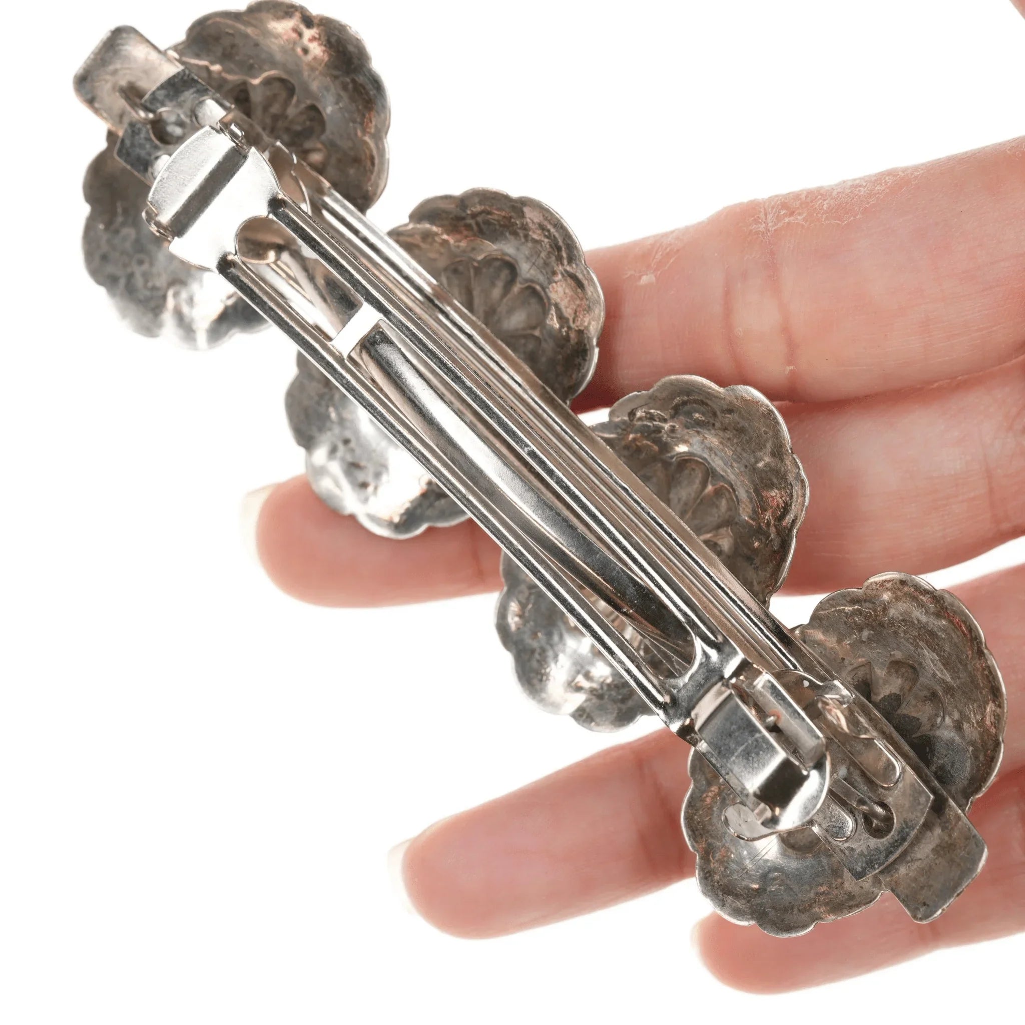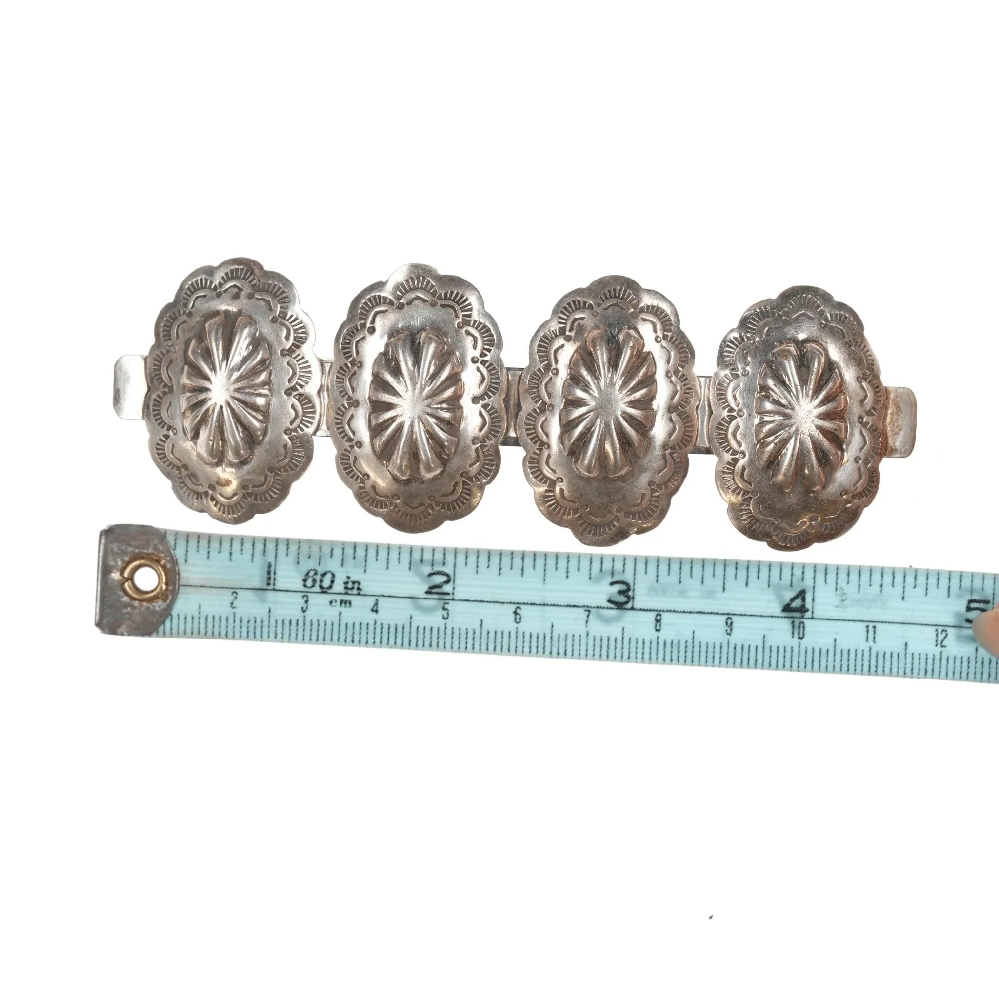 Large Navajo sterling concho style barette. Appears unworn, circa 1980's. Front plate is sterling with steel clip mechanism.