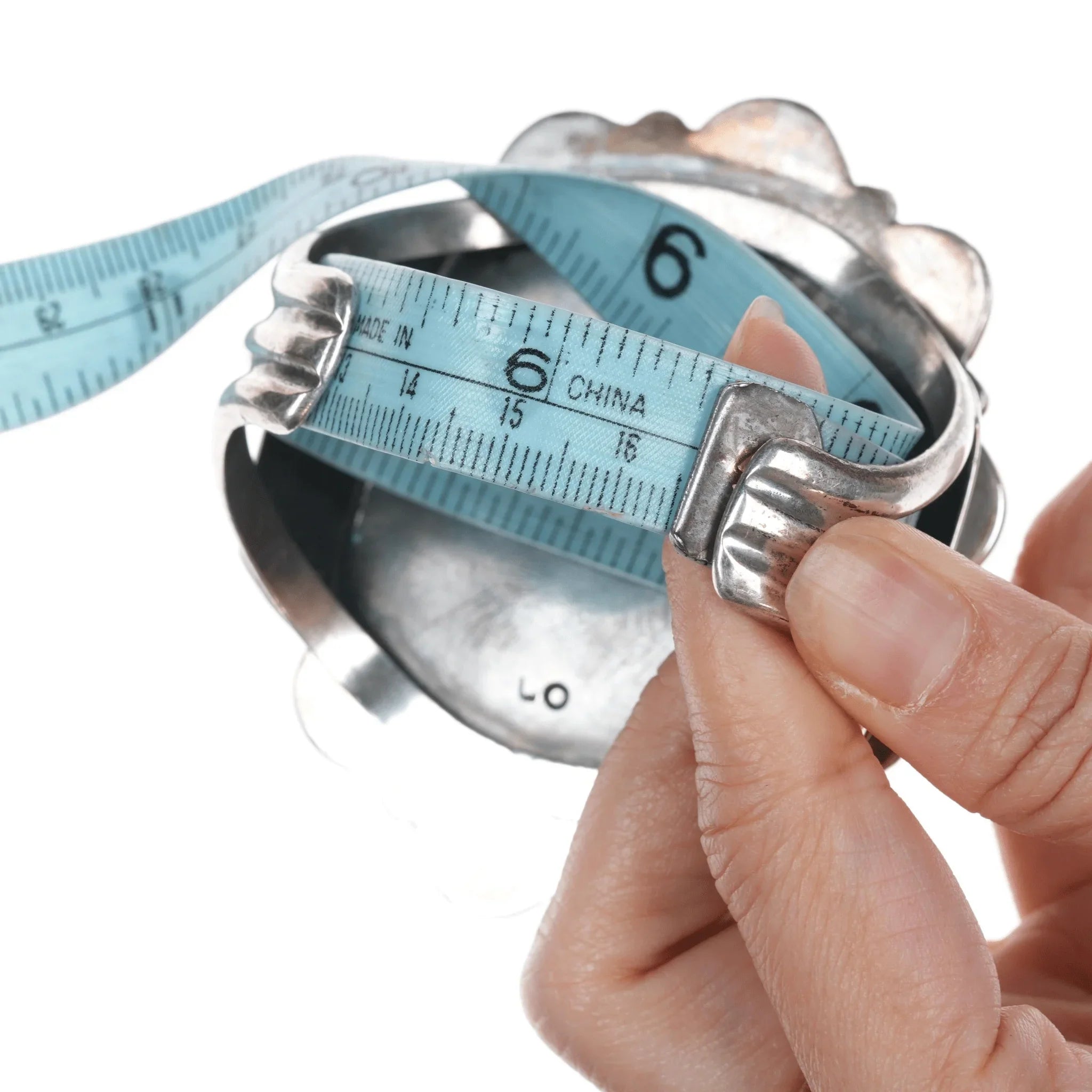 All precious metals are tested and guaranteed, any Native American jewelry<br>referred to as Silver or Sterling is guaranteed to be a minimum of 90% (coin)<br>silver and possibly higher content. Anything marked is guaranteed to be what<br>it's marked, most bracelets are photographed on a 6" wrist (non hairy), rings<br>photographed on the appropriate sized finger when possible. With bracelets if<br>the measurement is not given in the description then inside circumference is<br>shown where the metal meets the number on the the cloth tape measure.