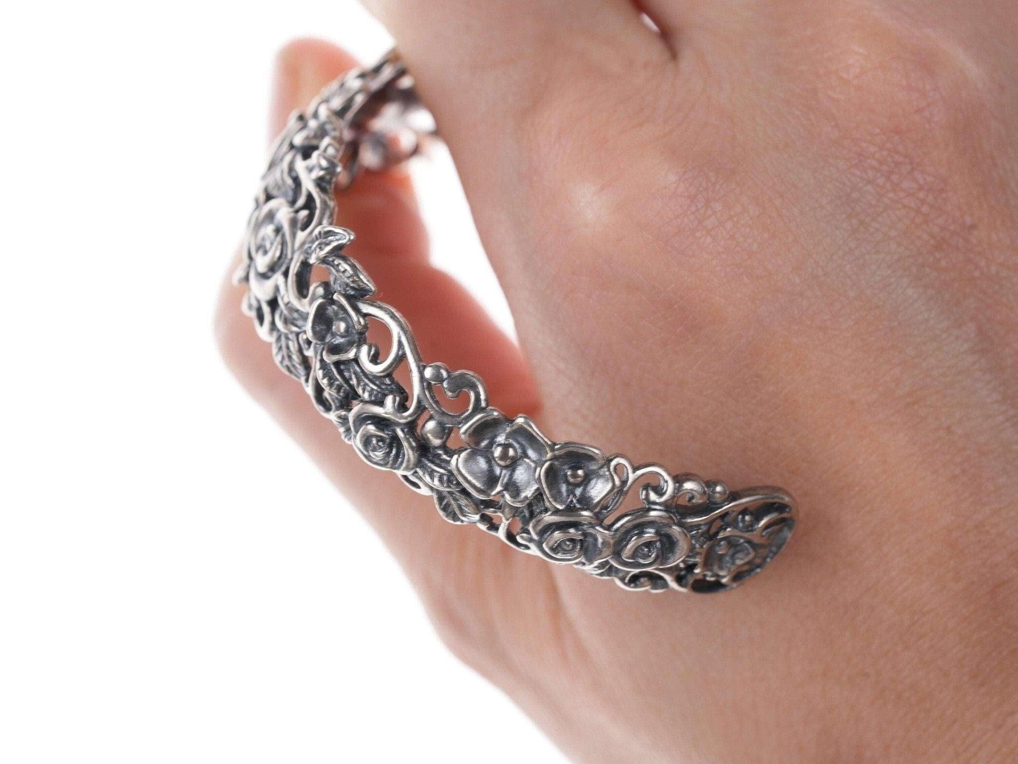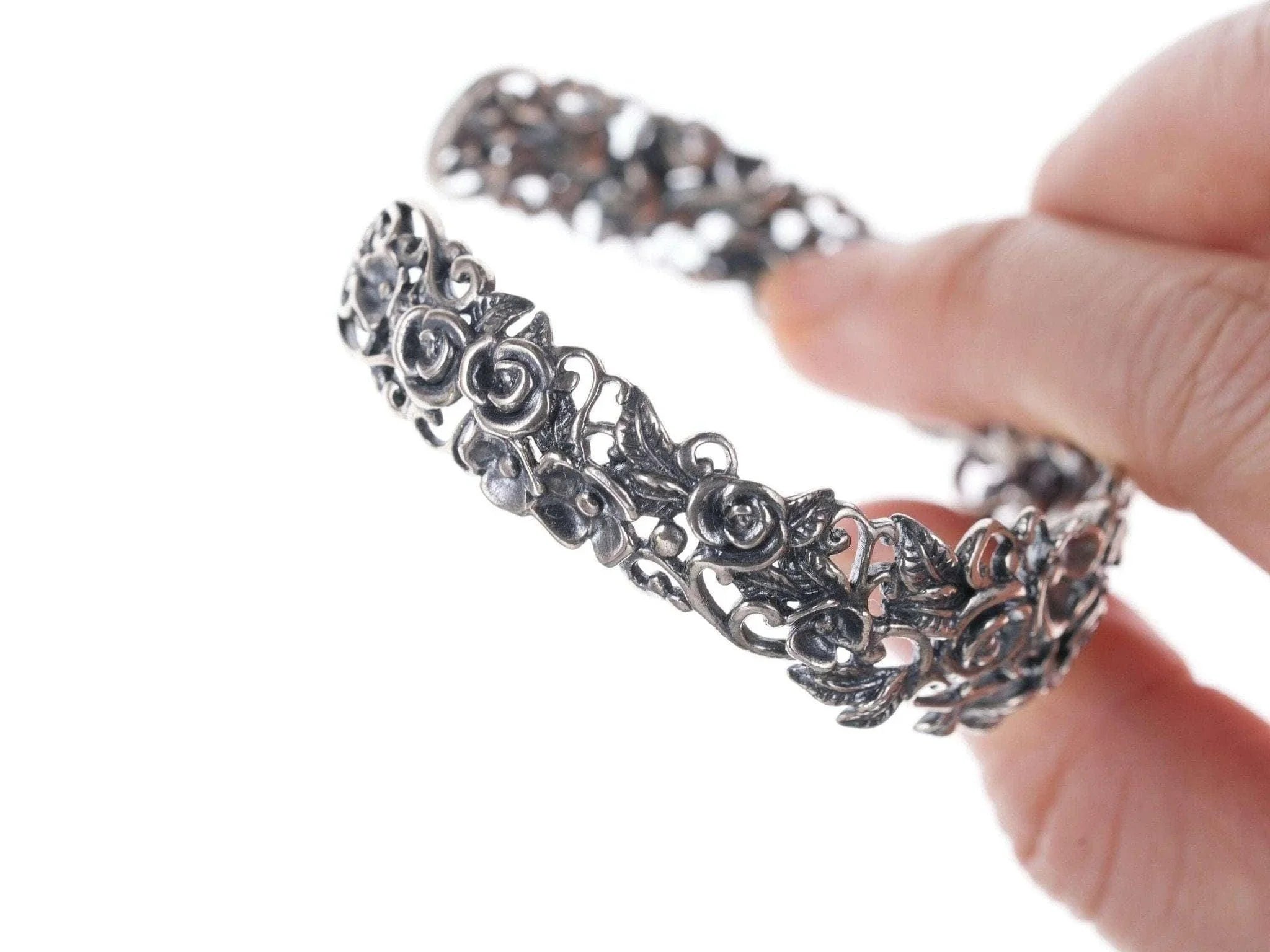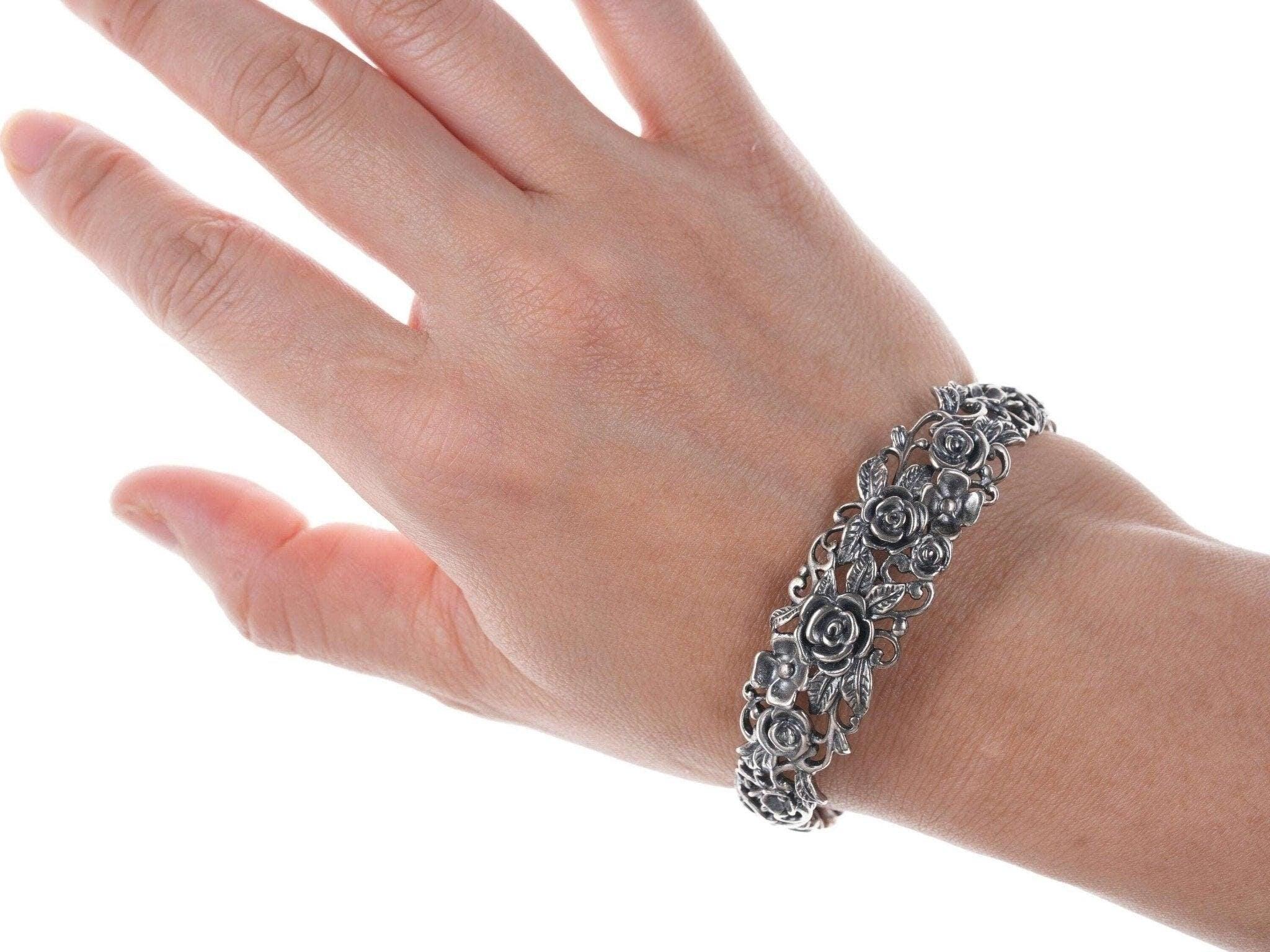 6.5" Retro Israel Sterling silver rose filigree cuff bracelet