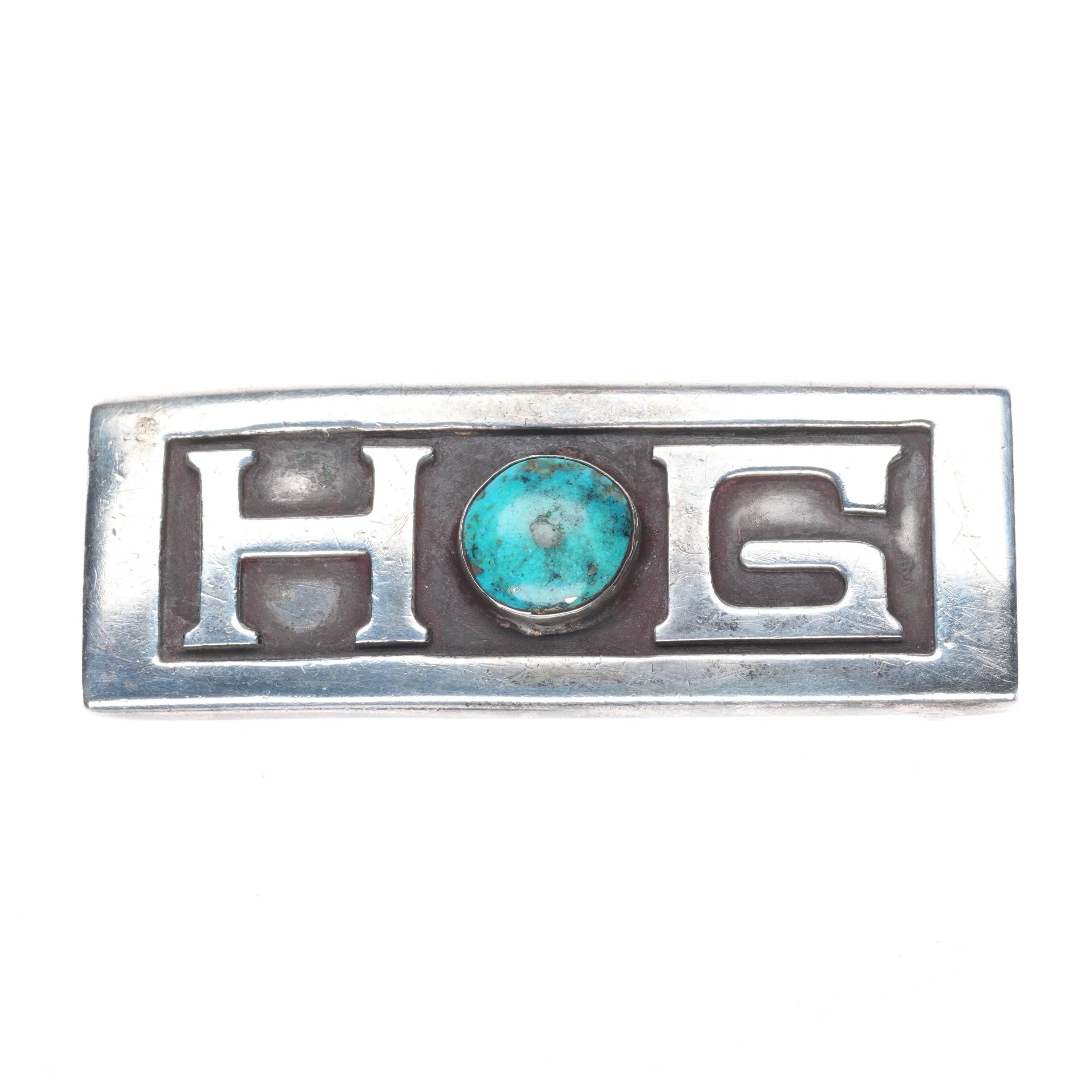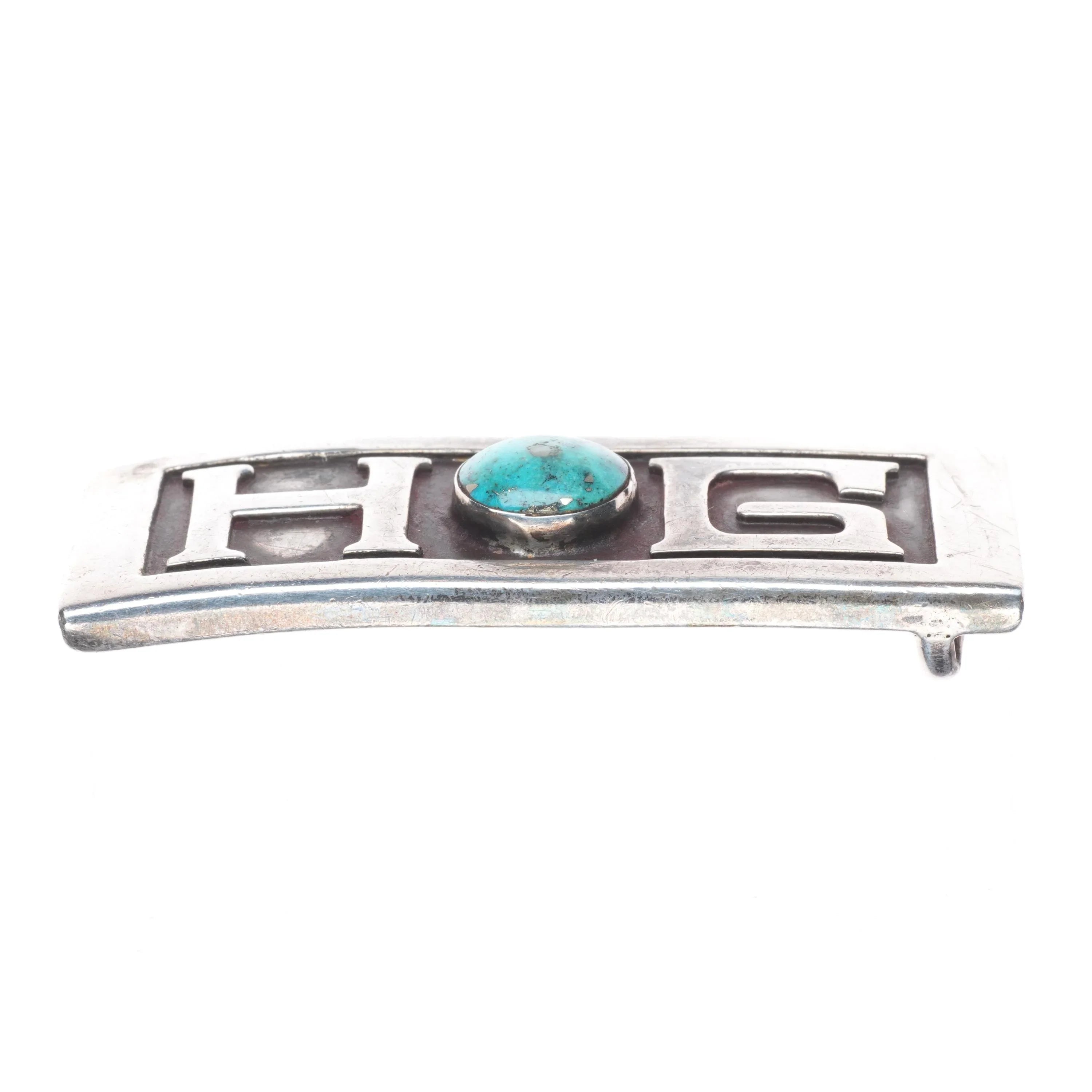 Riveras Southwestern Modernist sterling silver HOG Harley turquoise belt buckle. Tested and guaranteed solid sterling silver, fits up to a 1" wide belt. Weight and measurements in pictures, circa third quarter of the 20th century.