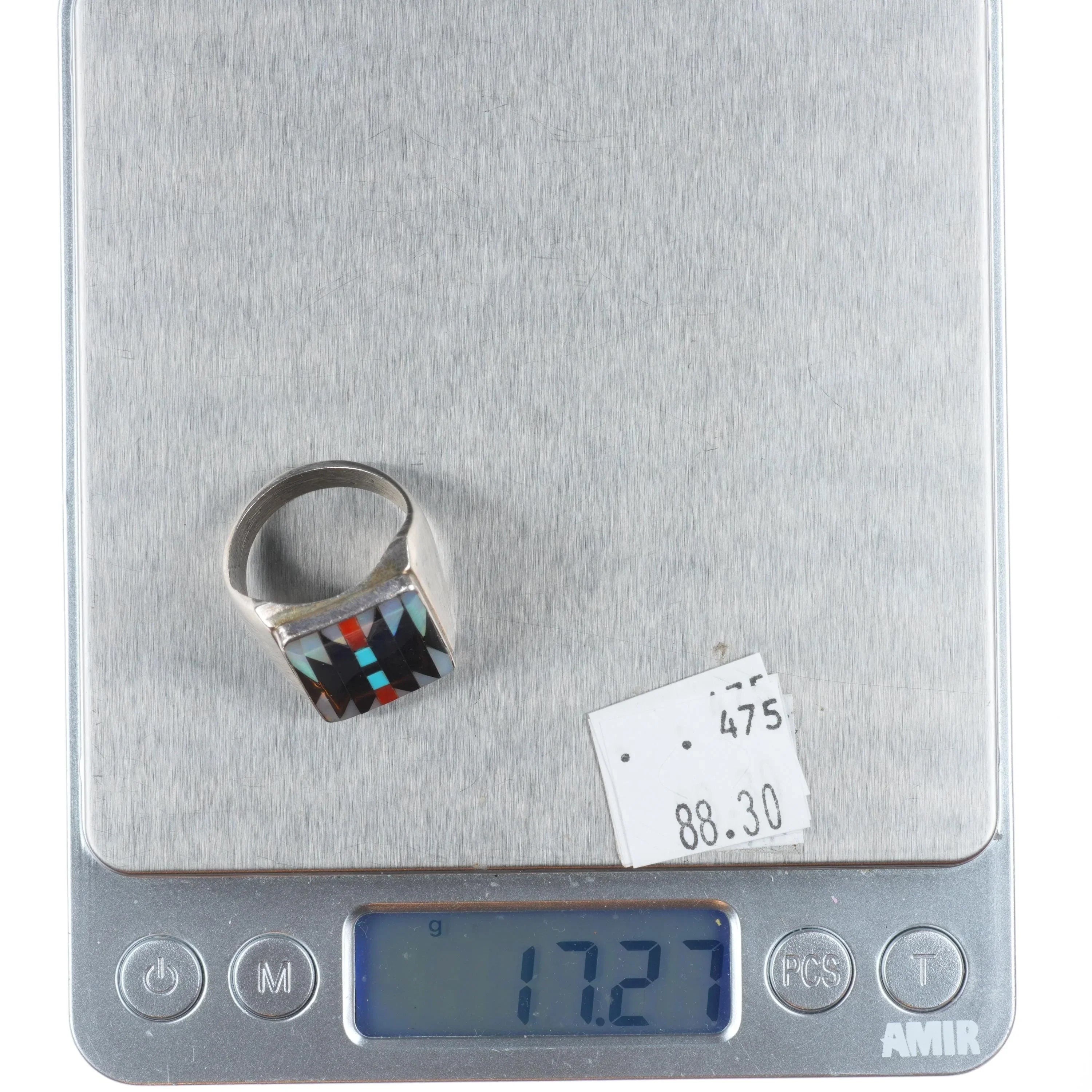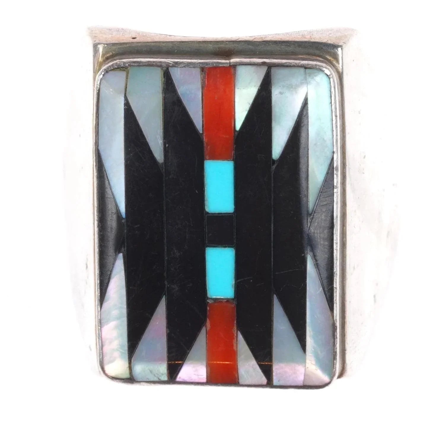 sz10 Dishta Zuni sterling silver Navajo rug pattern intarsia inlay ring. Tested and guaranteed solid sterling silver with weight and measurements in pictures. Nice ring from the last quarter of the 20th century. expected wear with no damage.