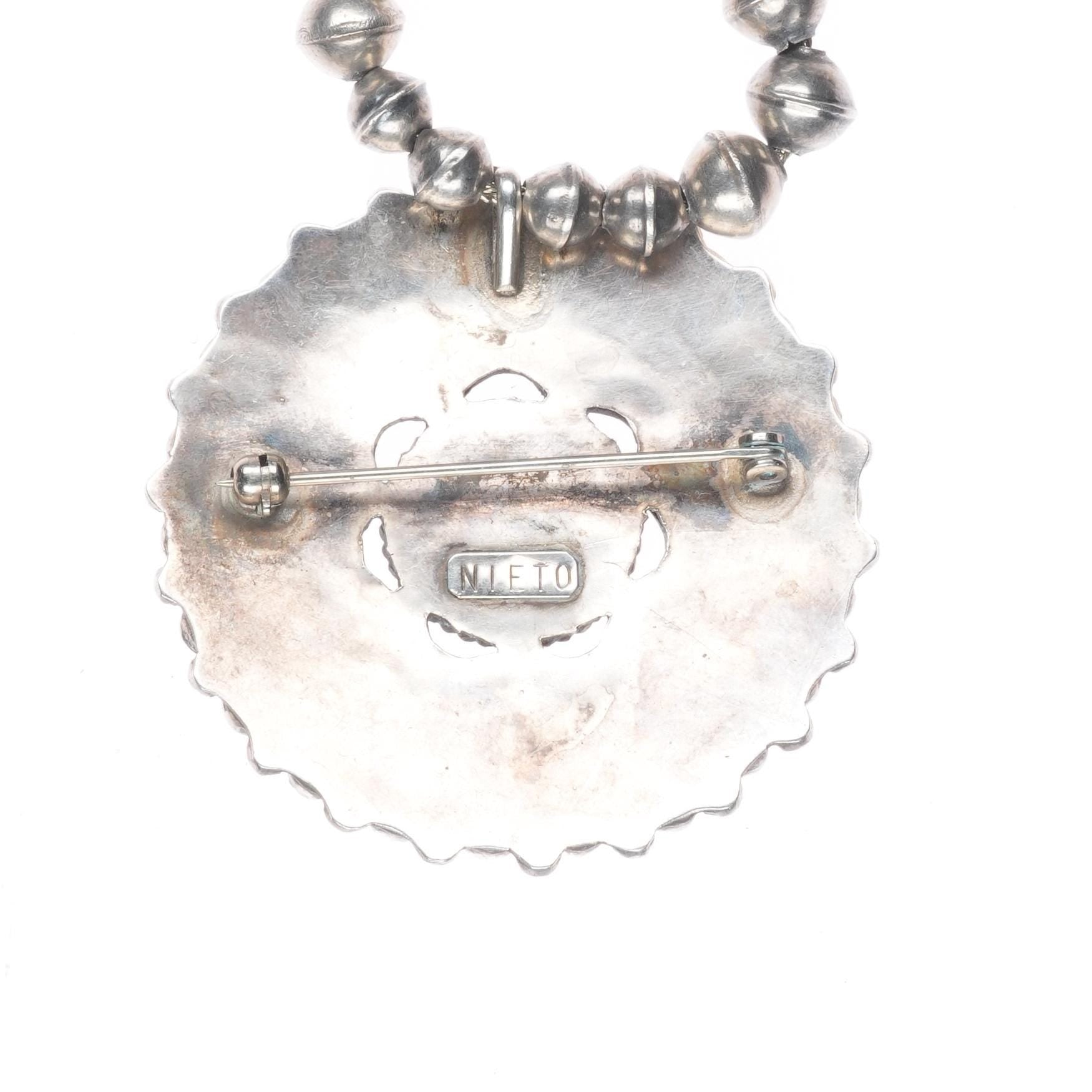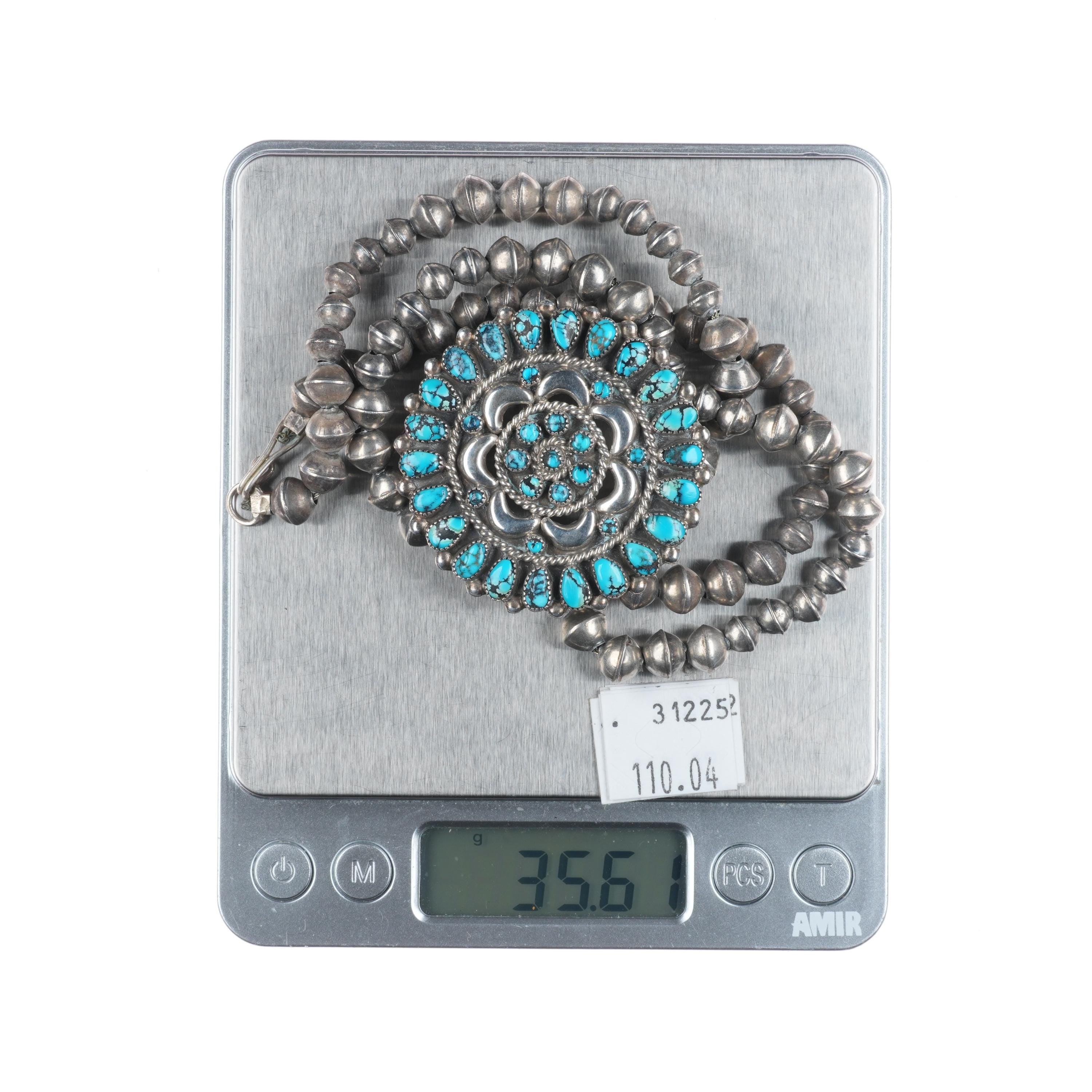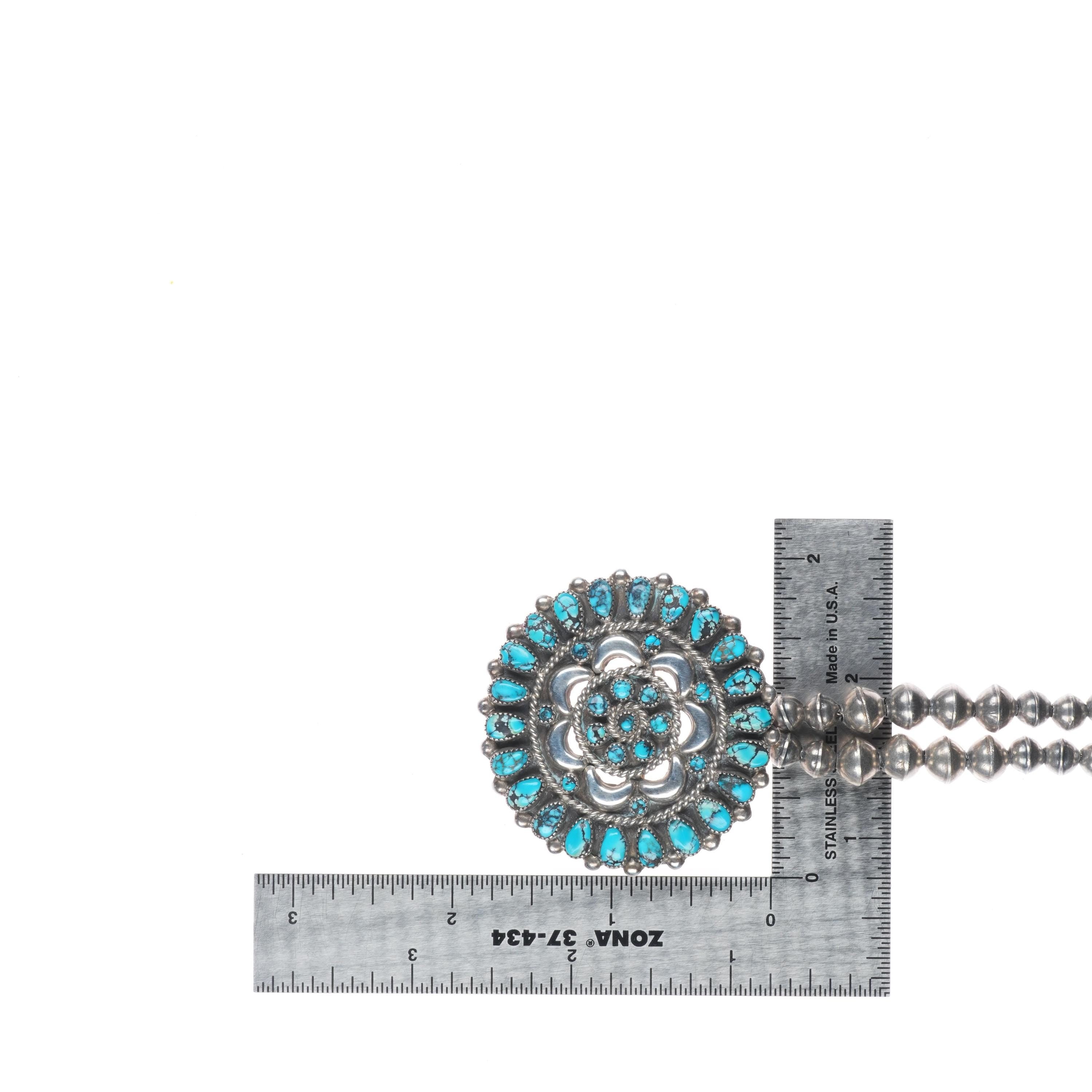 Vintage Nieto Zuni #8 spiderweb Turquoise cluster pendant/beaded necklace. Solid sterling silver tested and guaranteed with weight and measurements in the pictures. Circa third quarter of the 20th century. 22" long. No apparent markings.