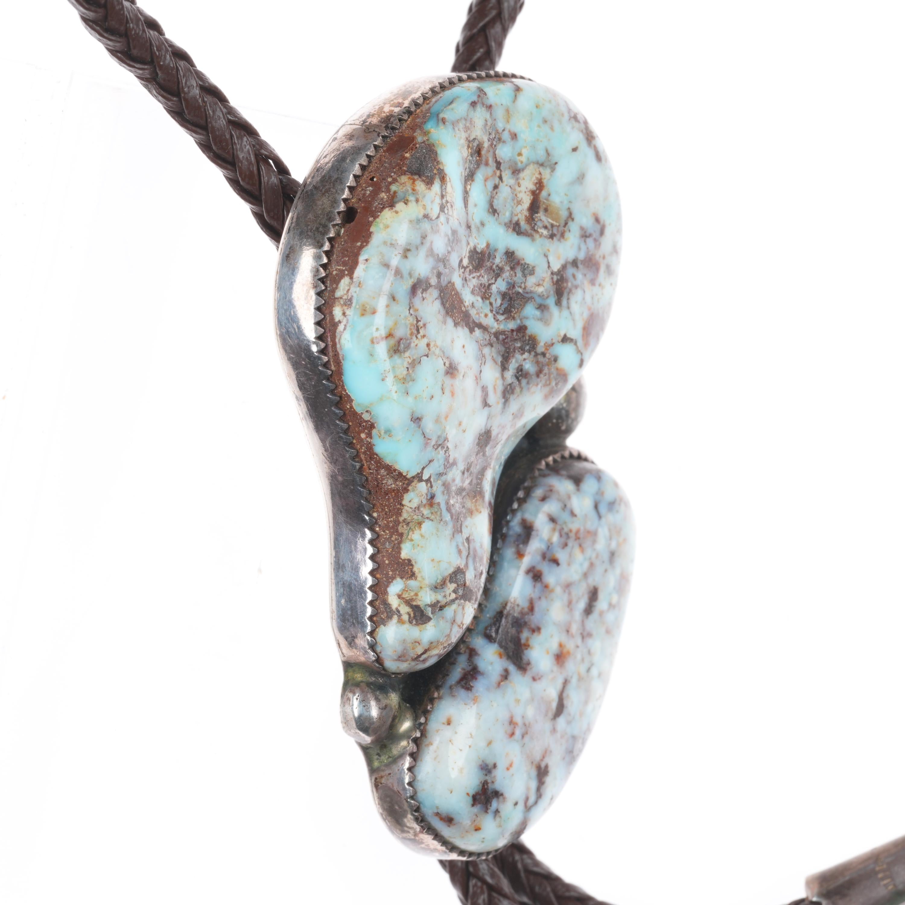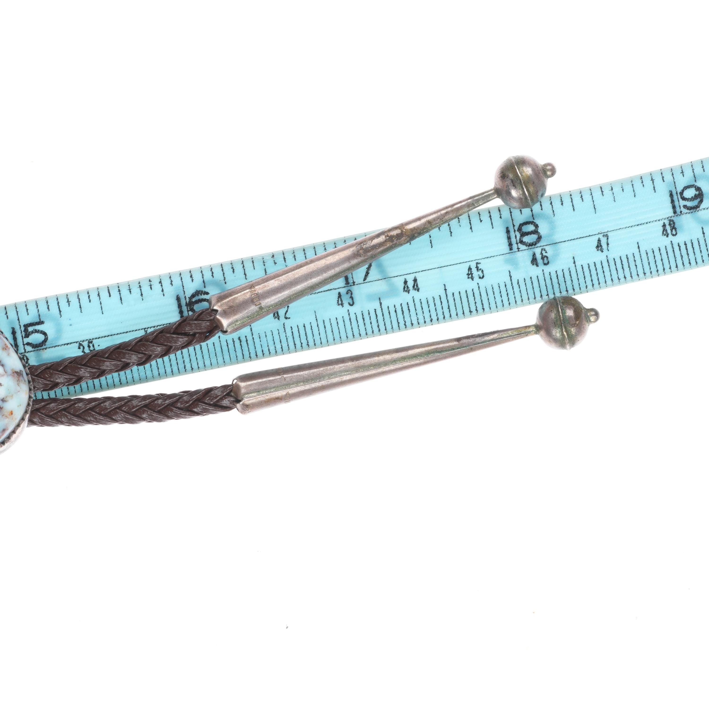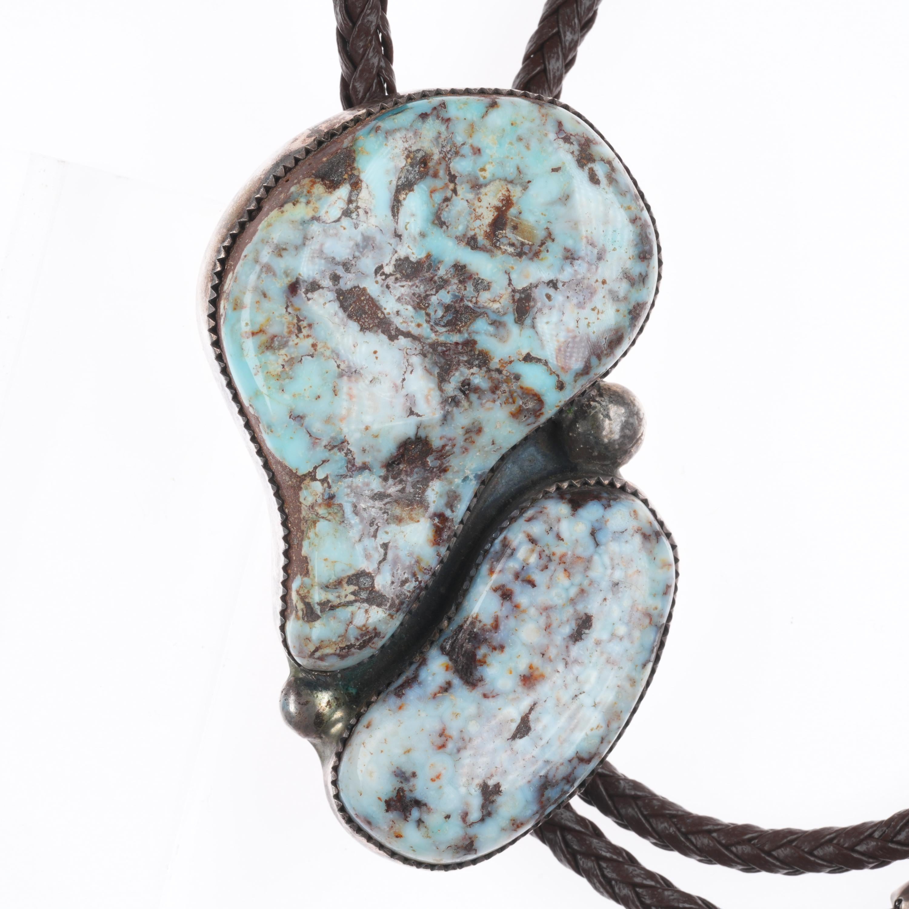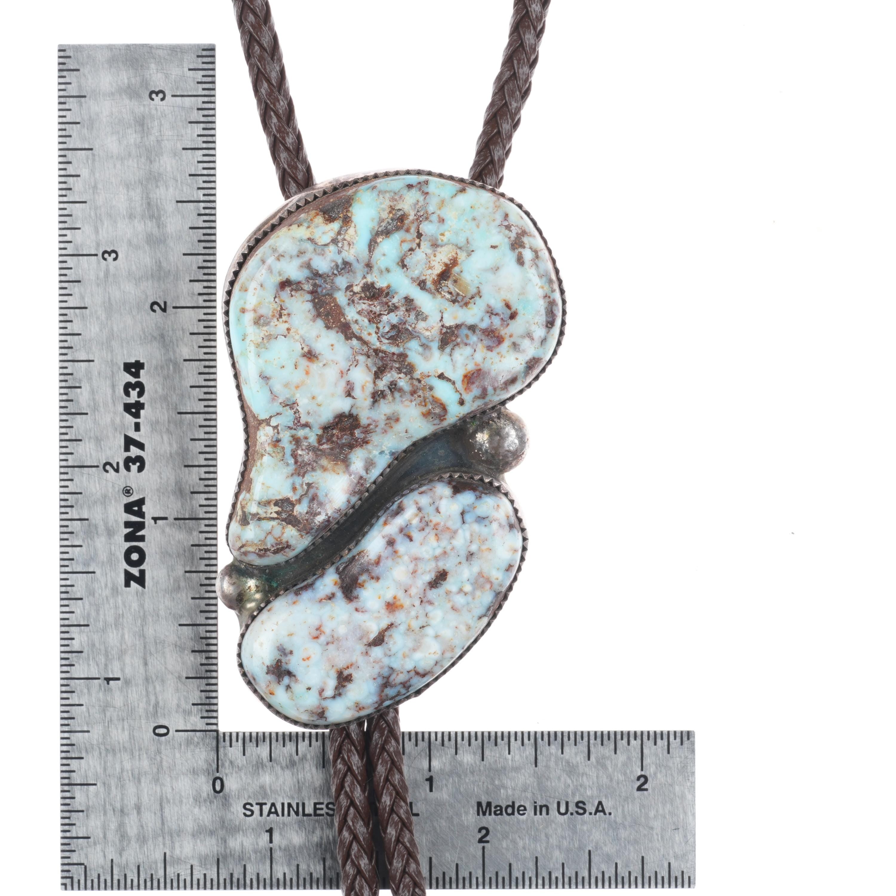Vintage Phil Zachary Dry Creek Turquoise southwestern sterling silver bolo tie. Tested and guaranteed solid sterling silver slide and tips. Weight and measurements in pictures. 37" long. Circa last quarter of the 20th century. Phil passed away in 2019, many dealers refer to him as Navajo but I don‘t believe he was. He was born in Albuquerque, NM and did work with and teach some Navajo jewelers.