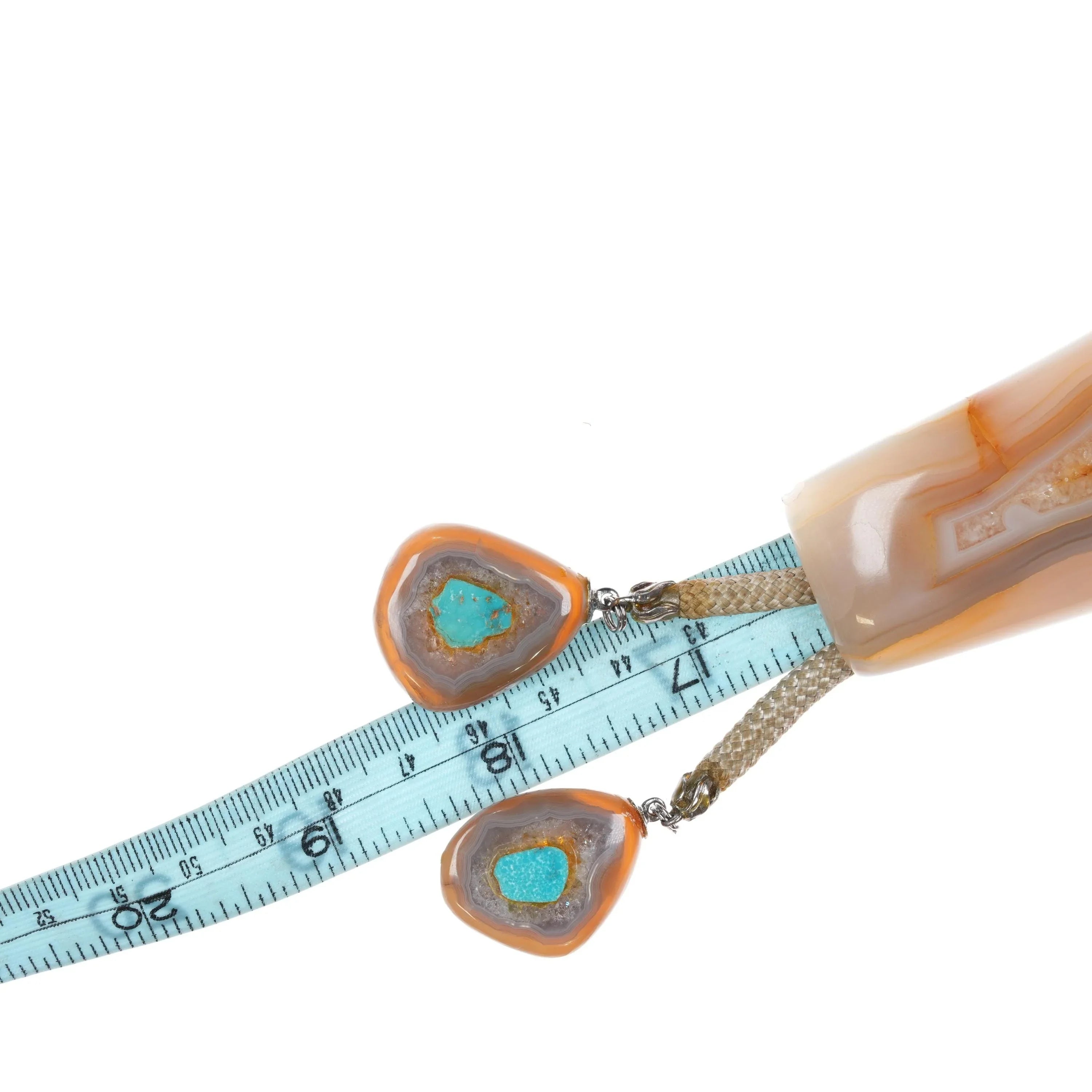 Vintage Turquoise inlaid agate southwestern stone bolo tie. Weight and measurements in pics. 37" long. Some small chips on back side of bolo, one a little larger center left when facing bolo, another bottom left that does extend to the front but is only visible under close examination