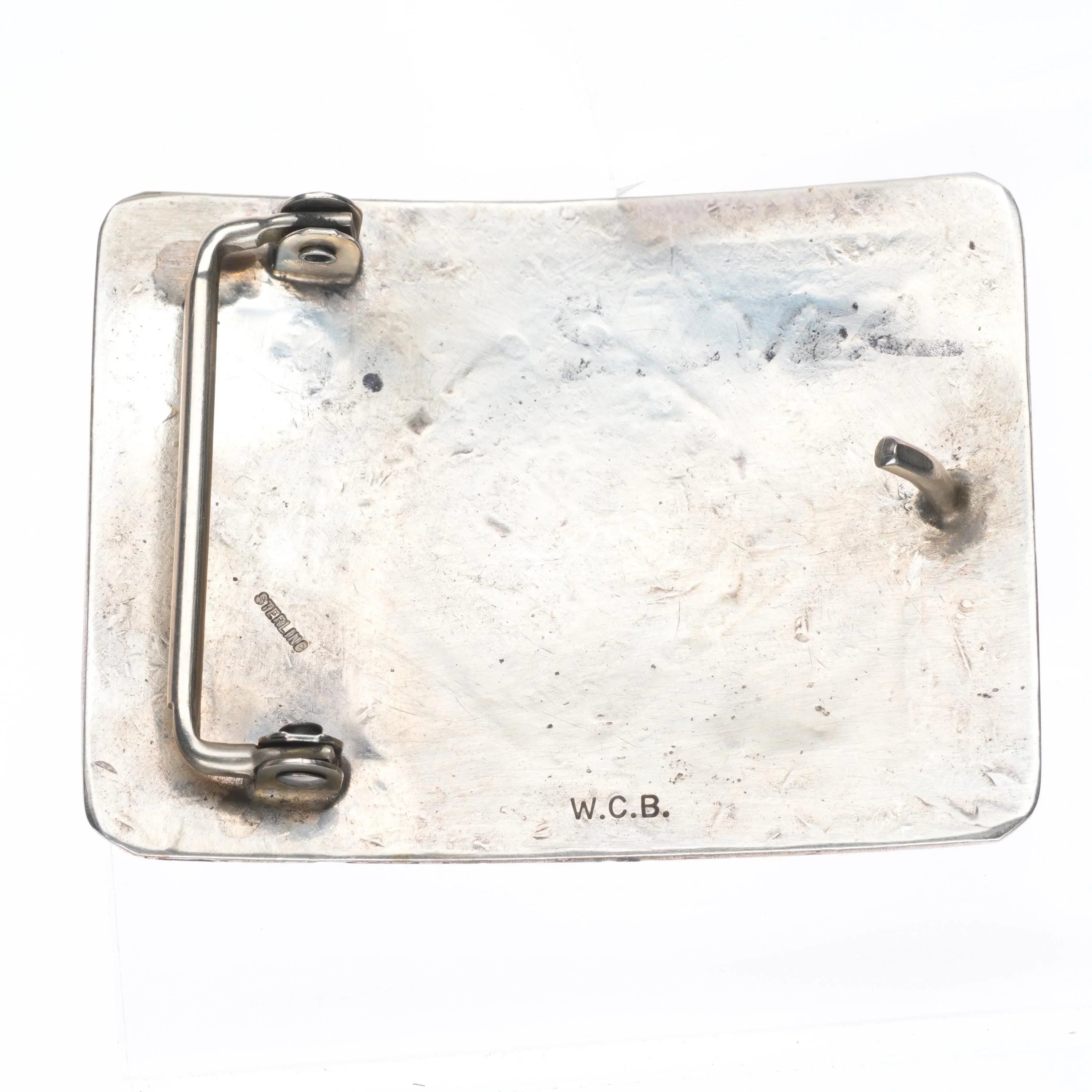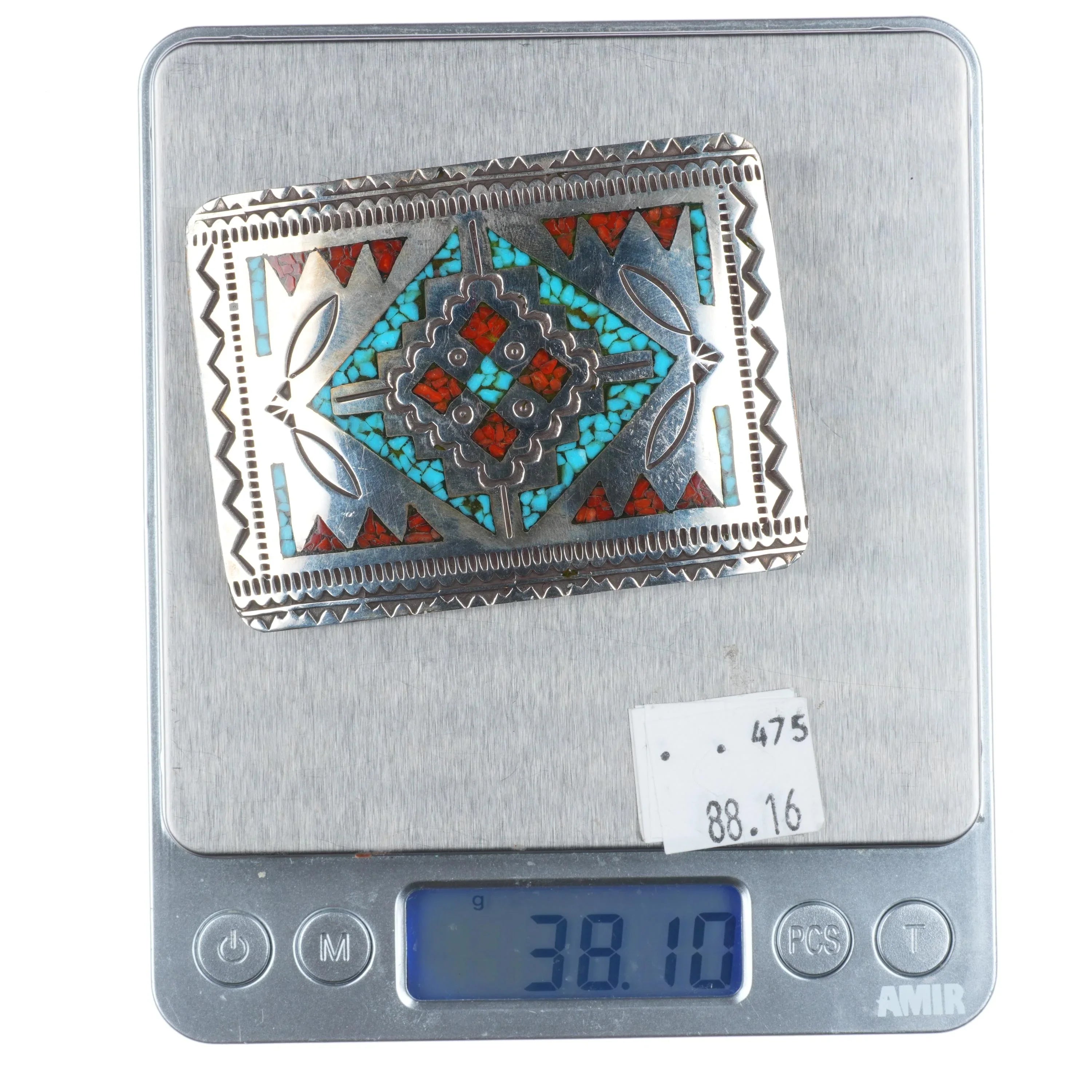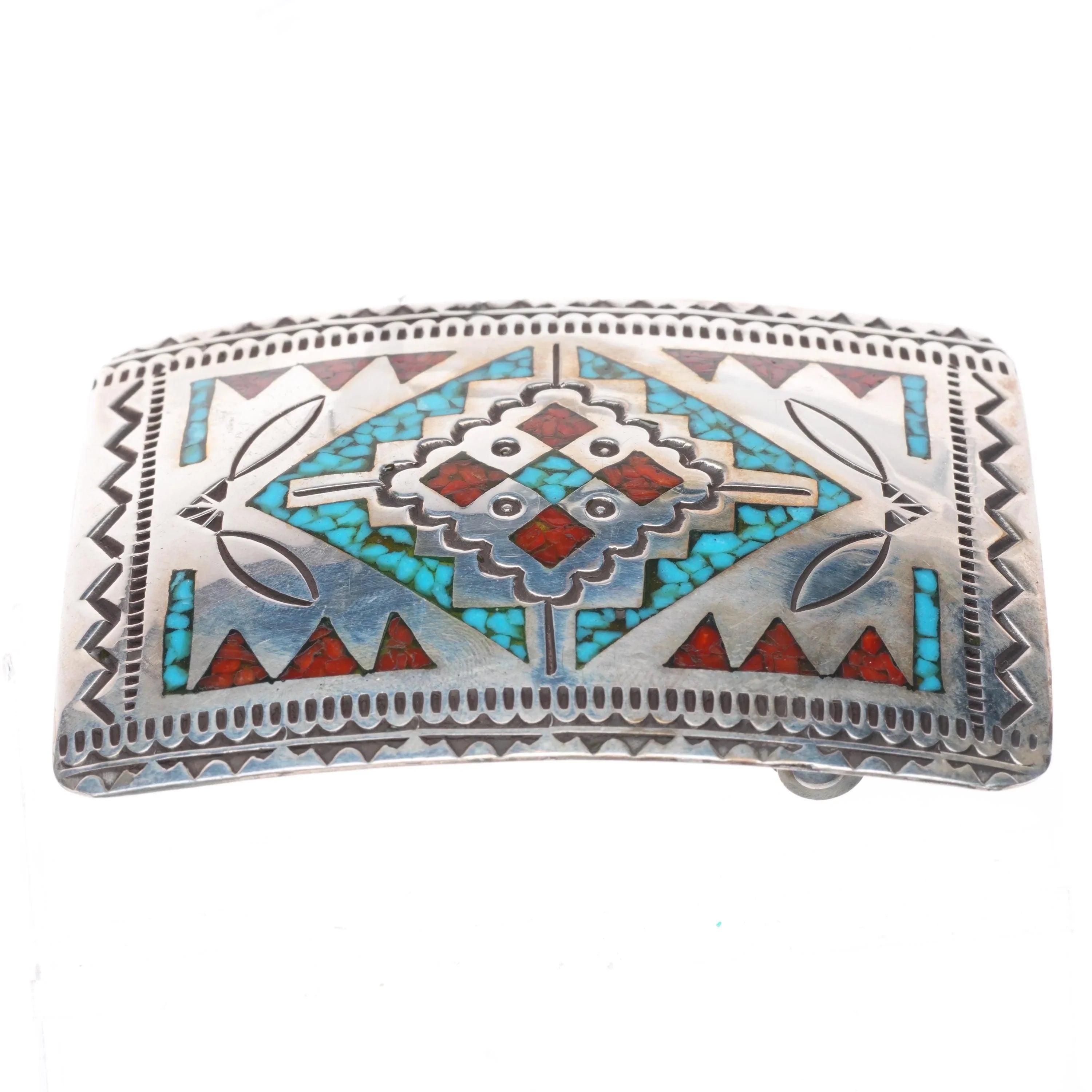 Vintage Wilson & Carolyn Begay Navajo sterling silver chip inlay belt buckle