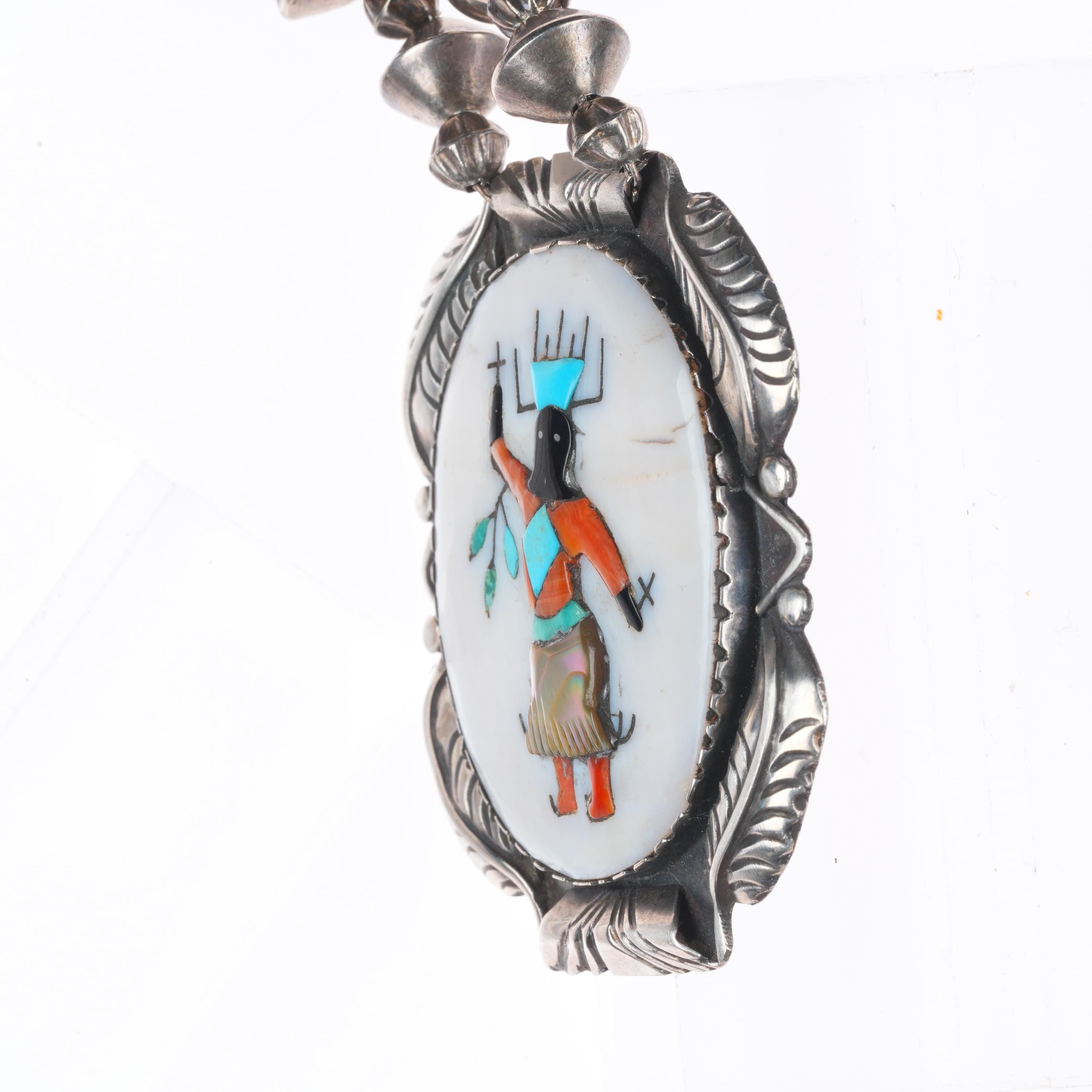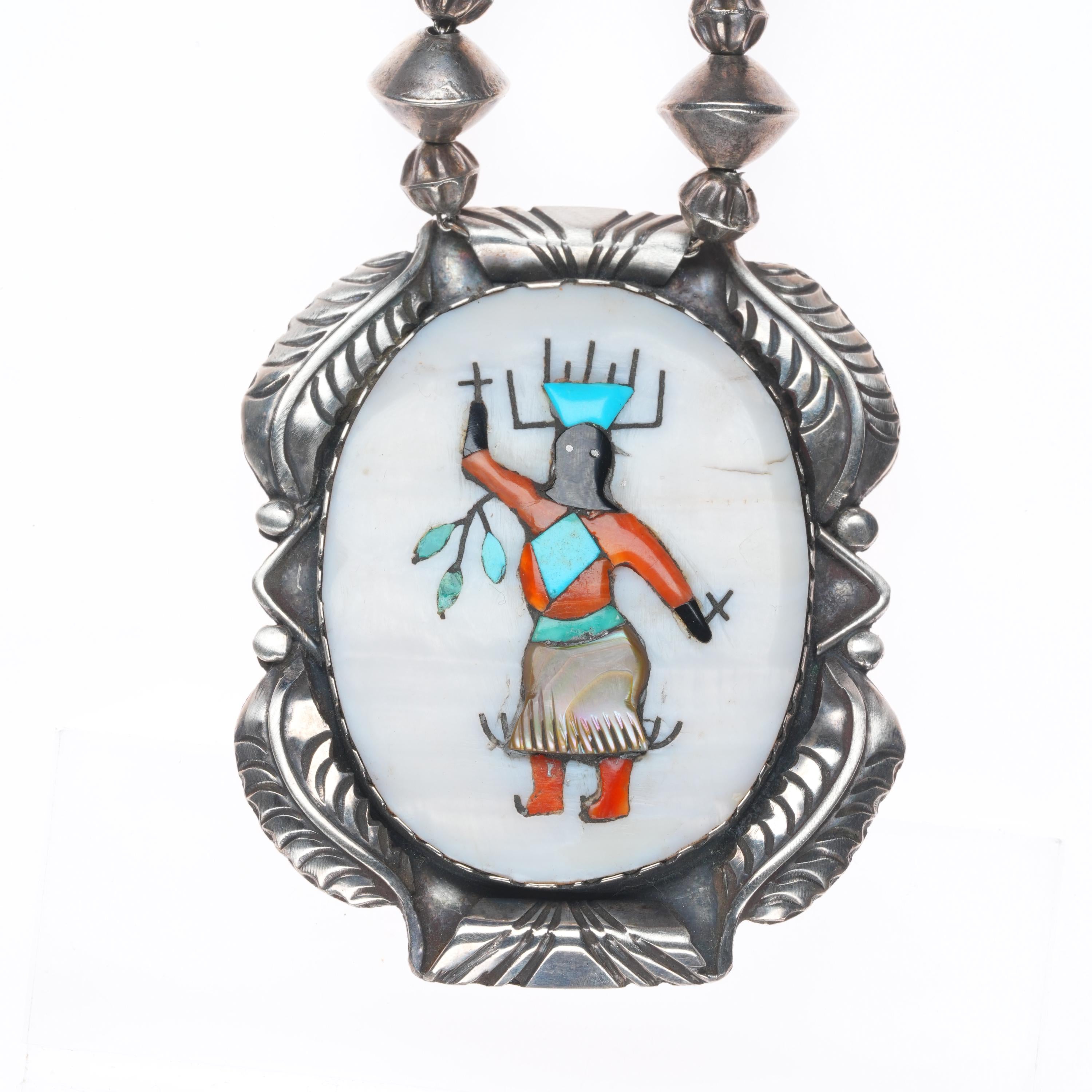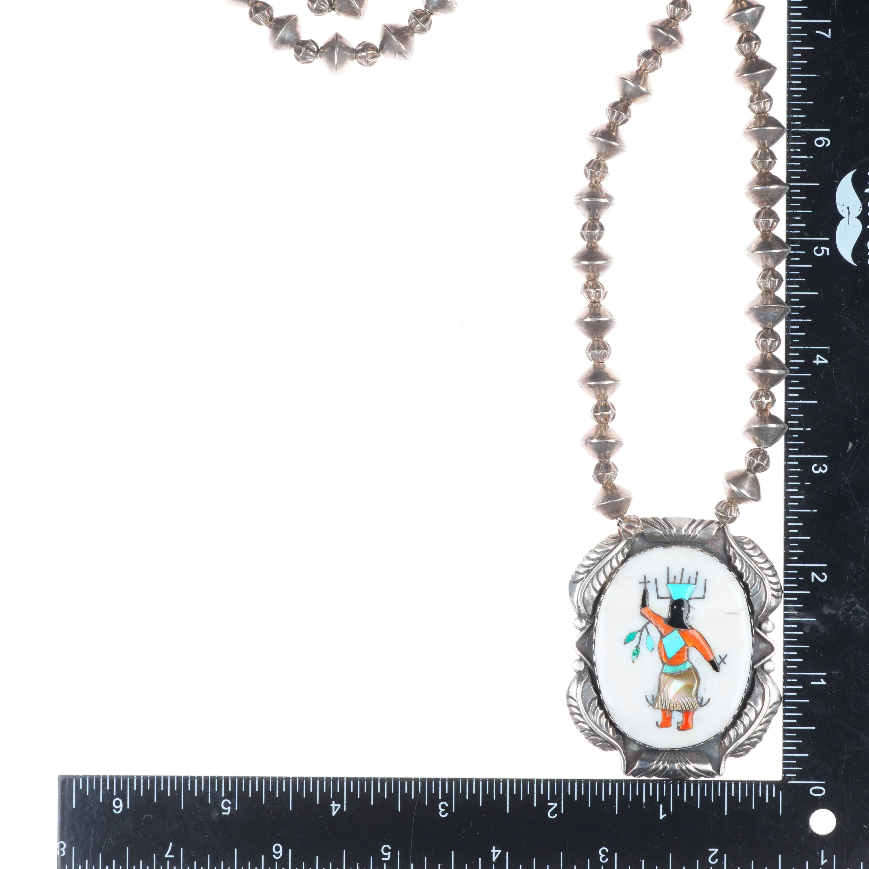 Vintage Zuni Ghan Dancer inlaid sterling silver pendant/beaded necklace. Selling the necklace shown in good condition with measurements in pictures. Tested and guaranteed solid sterling silver. Weight and measurements in pictures. Circa third quarter of the 20th century. 29" long.