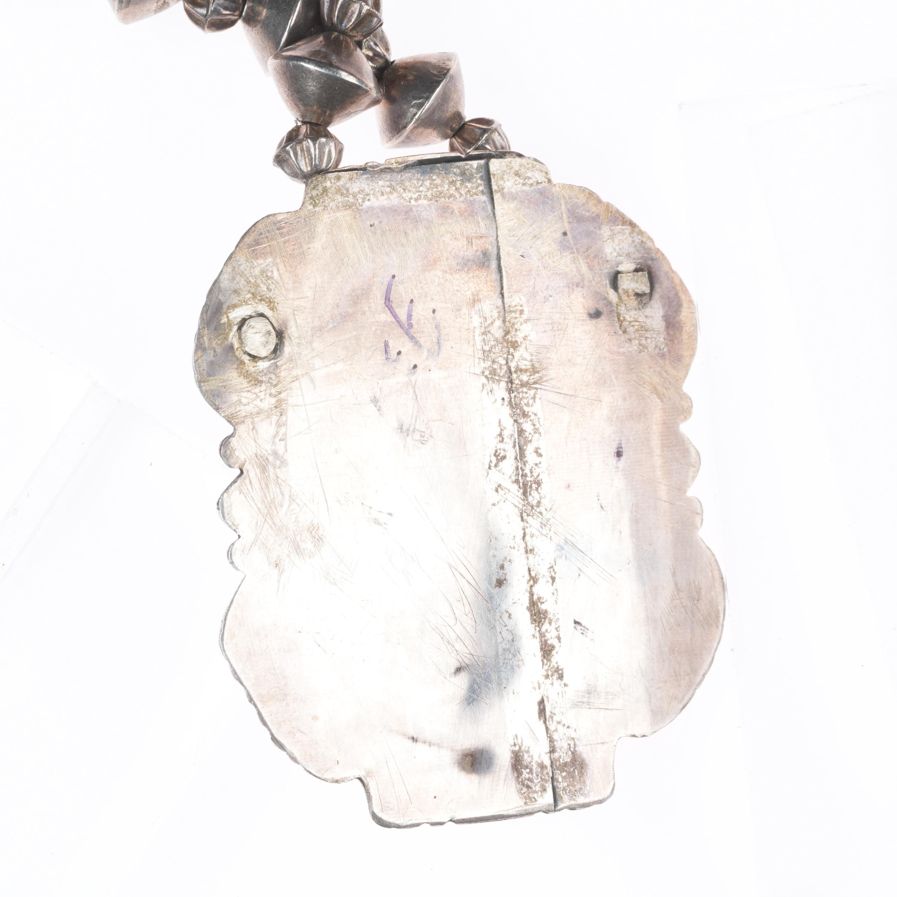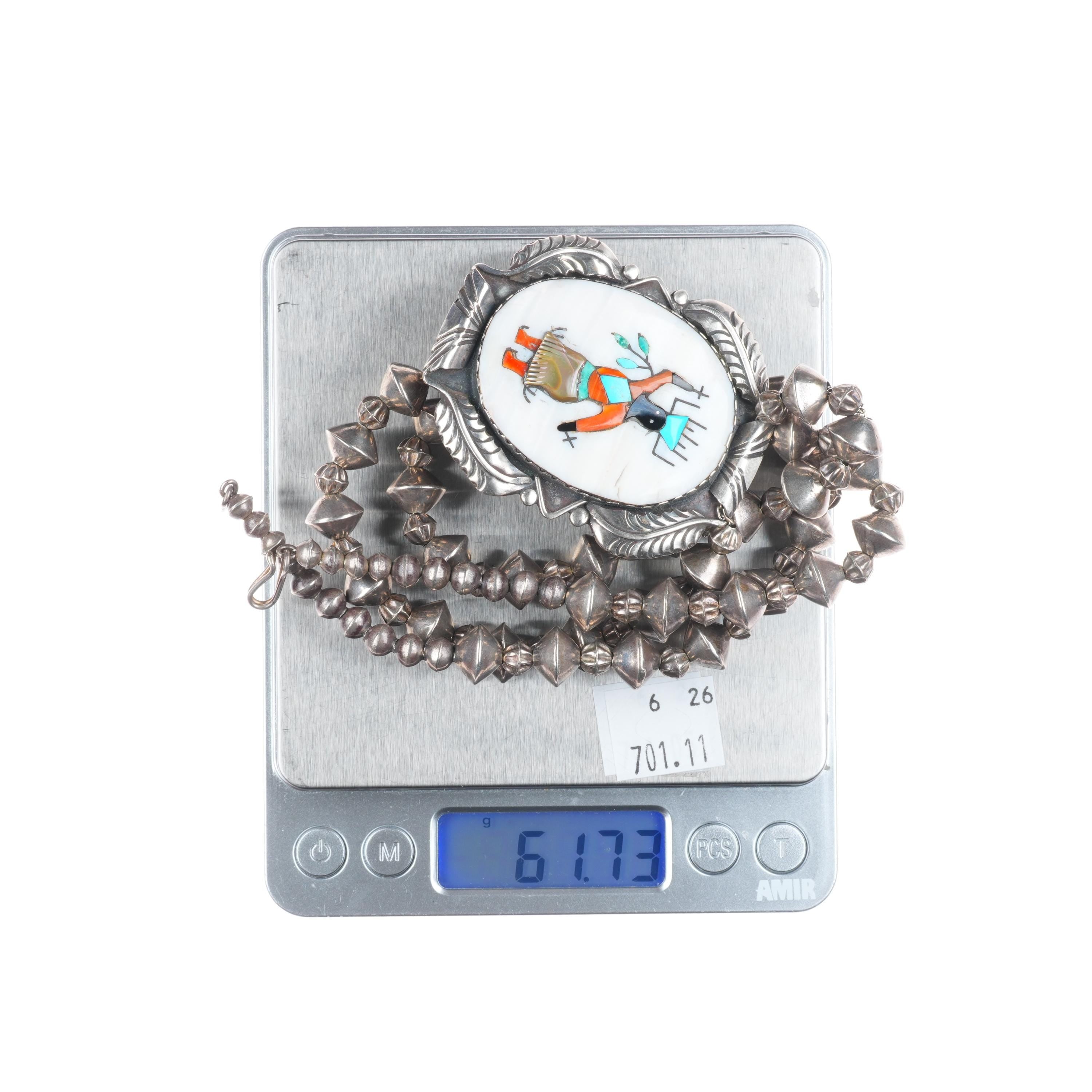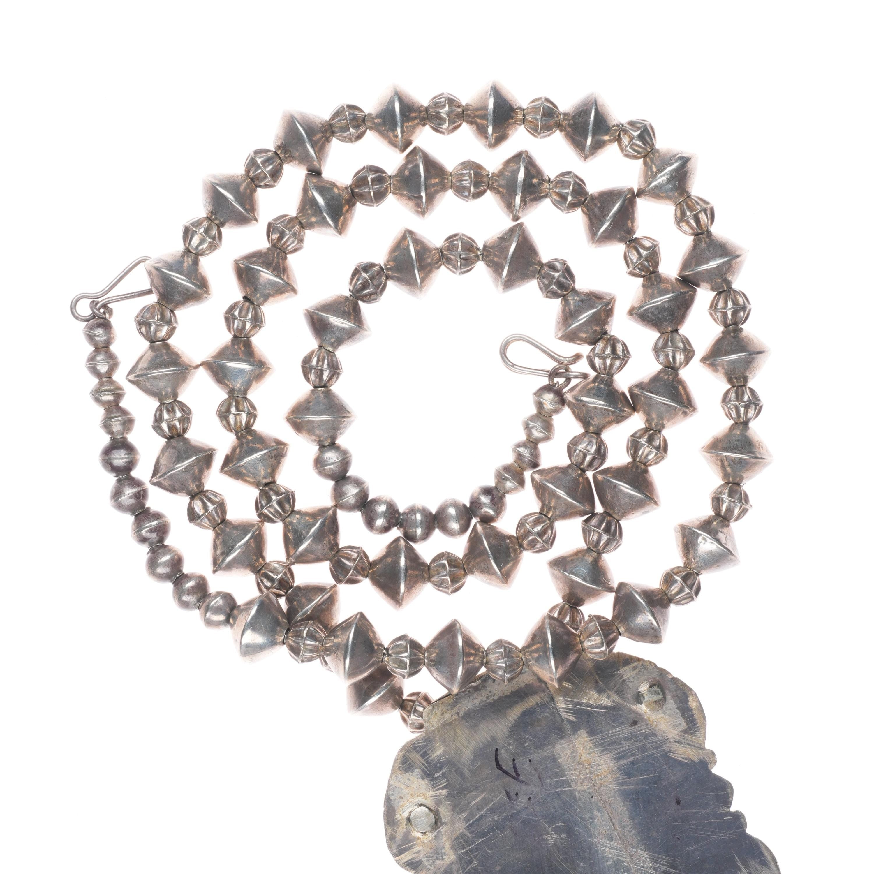 Vintage Zuni Ghan Dancer inlaid sterling silver pendant/beaded necklace. Selling the necklace shown in good condition with measurements in pictures. Tested and guaranteed solid sterling silver. Weight and measurements in pictures. Circa third quarter of the 20th century. 29" long.