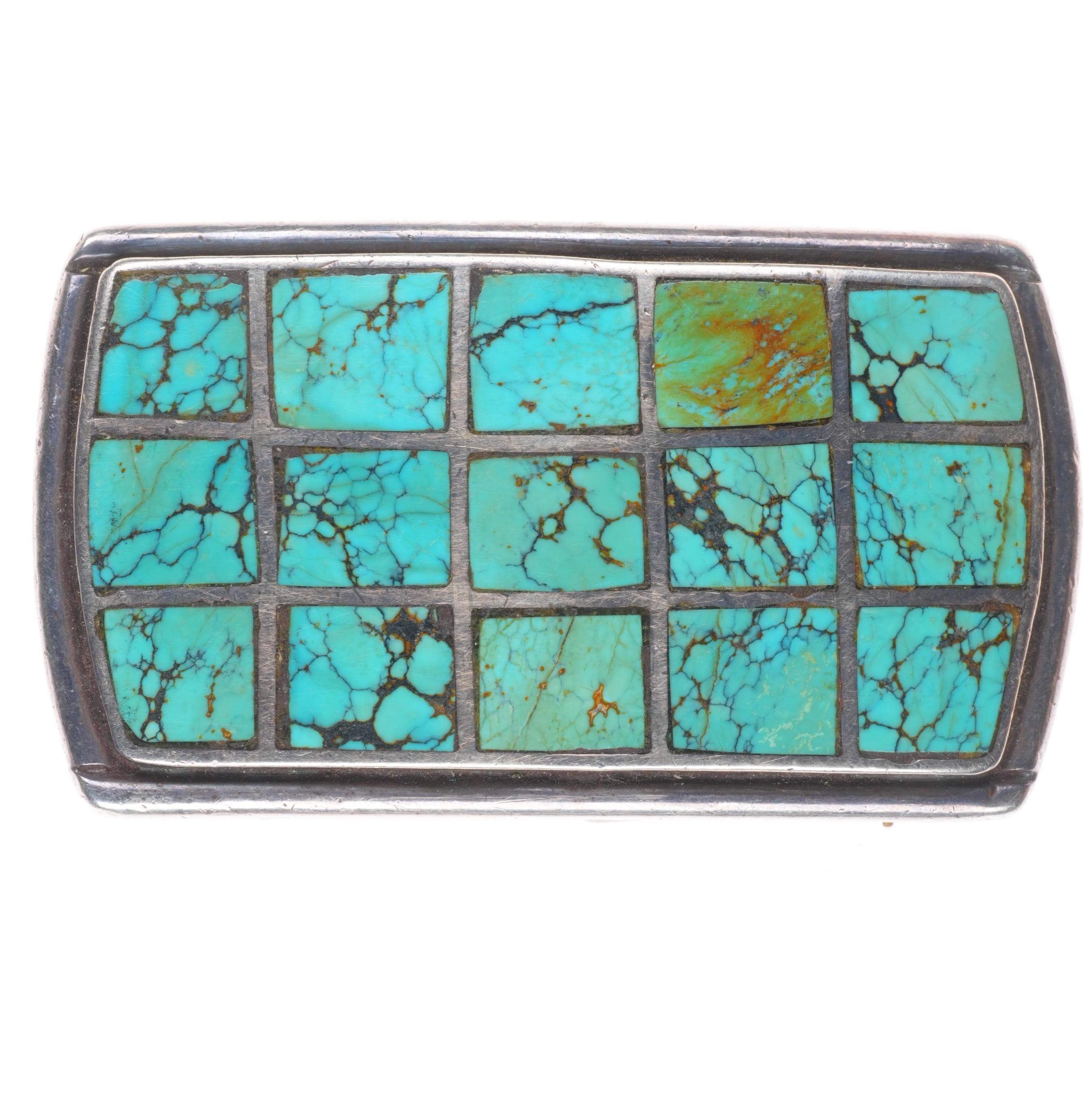 1.25" Vintage Navajo sterling silver turquoise channel inlay belt buckle