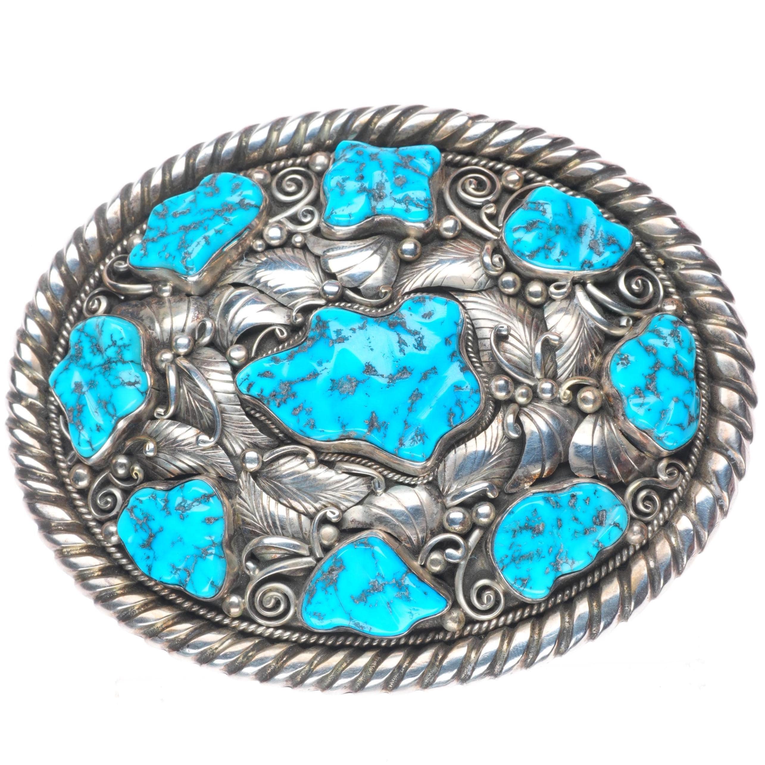 1.5" Gary Reeves Navajo sterling silver carved turquoise nugget belt buckle. Solid sterling silver (tested) with weight and measurements in pictures.. Buckle fits a 1.5" belt. Circa third quarter of the 20th century.