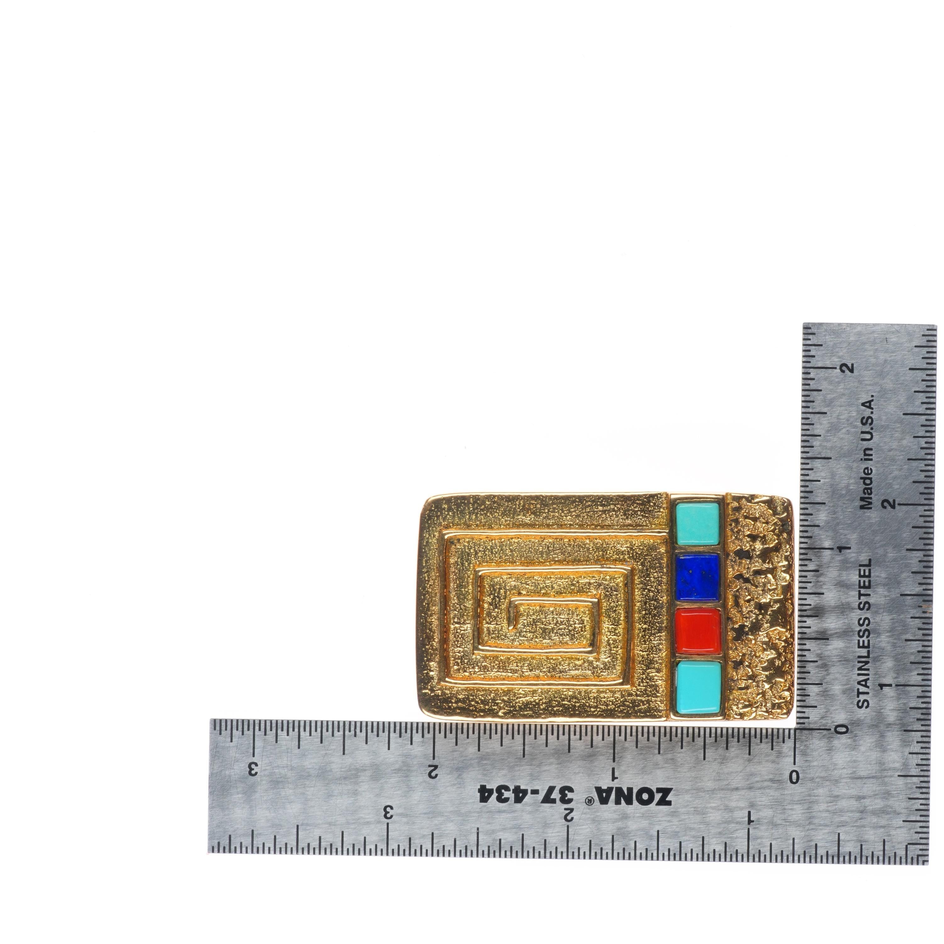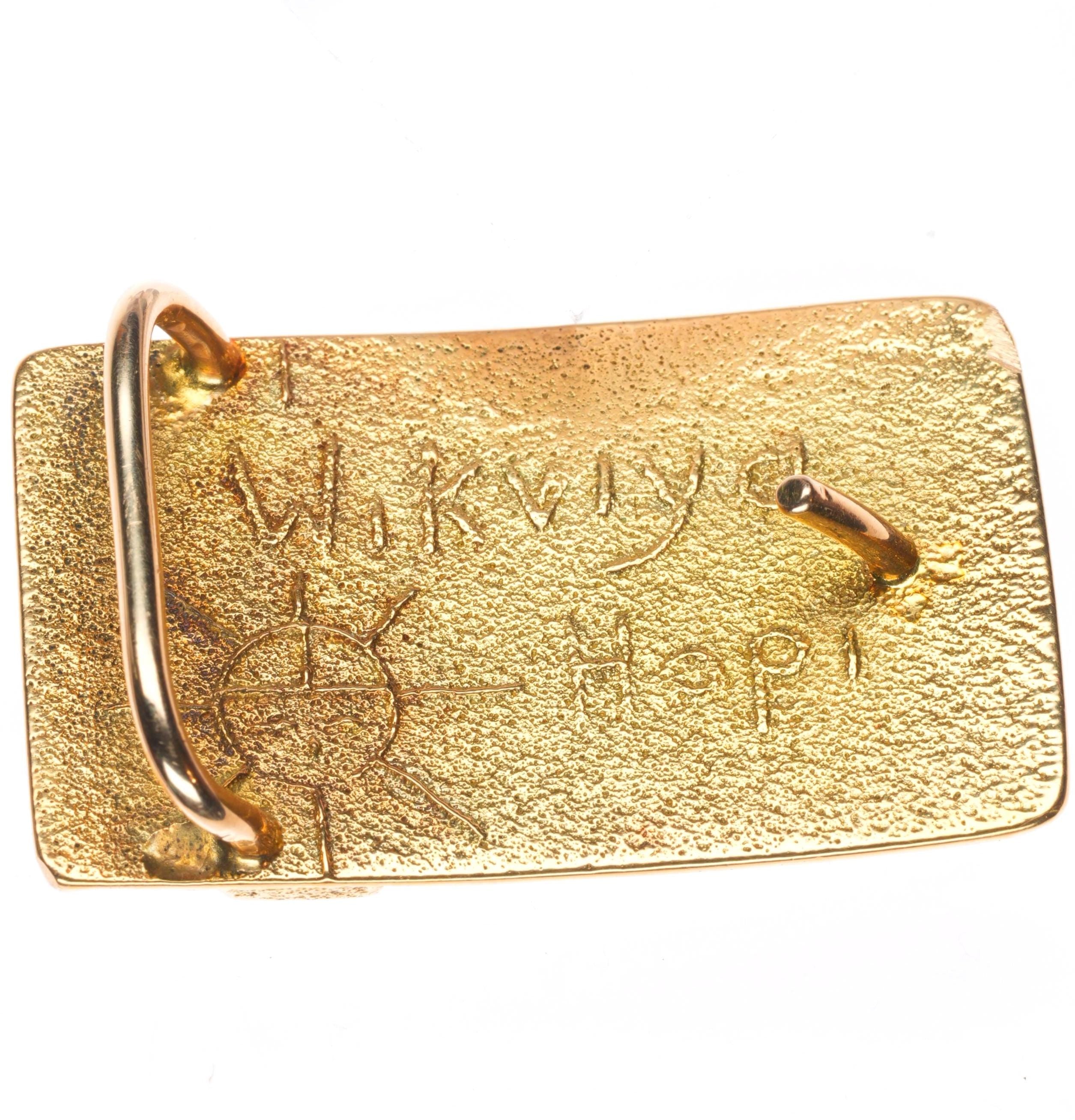 18k Gold Tufa Cast Steve Wikviya Larance Hopi turquoise/coral/lapis belt buckle. Tested and guaranteed solid 18k gold with no significant wear. Very fine piece mad by a top Hopi artist, his work is carried by the top galleries in the US. I've been testing gold most of my life and guarantee it to be at least 18k gold. No purity markings which is common with much Native American jewelry. Other gold pieces I have found by this artist also have no 18k, etc markings.