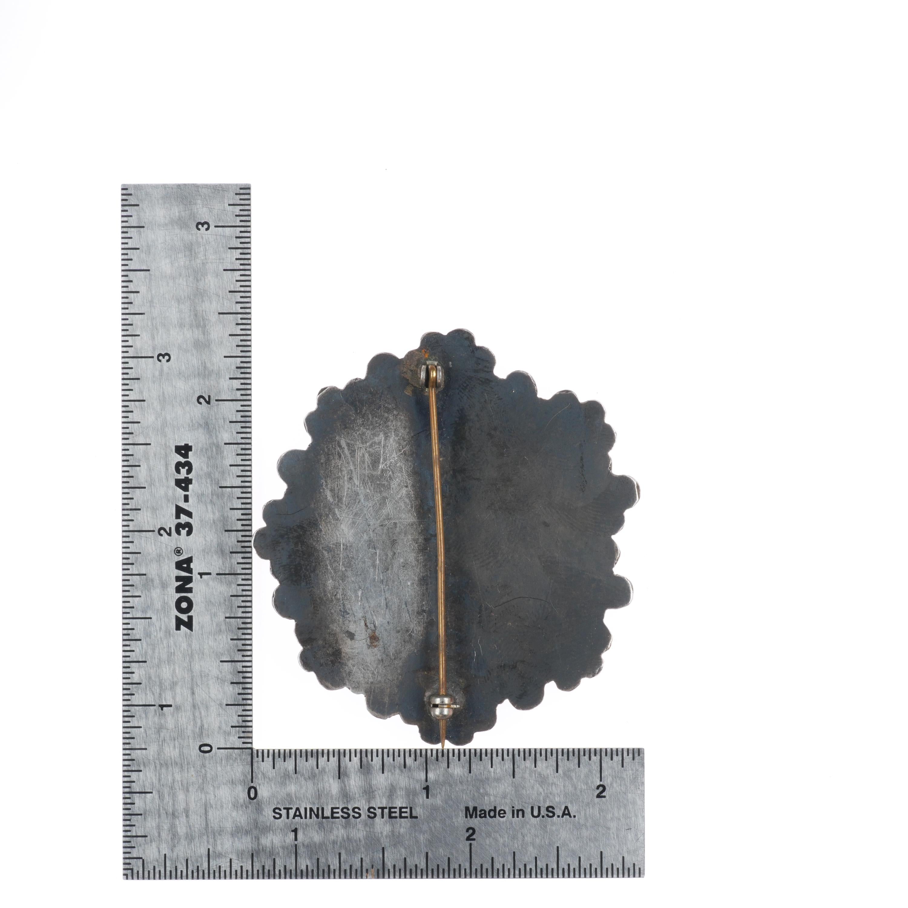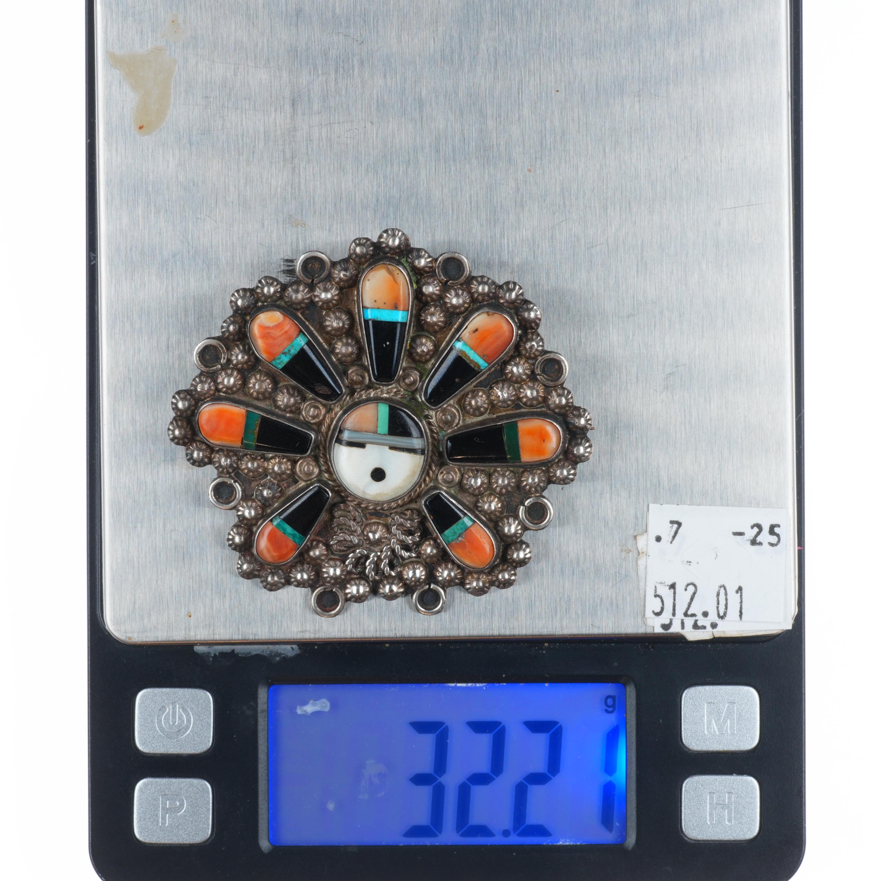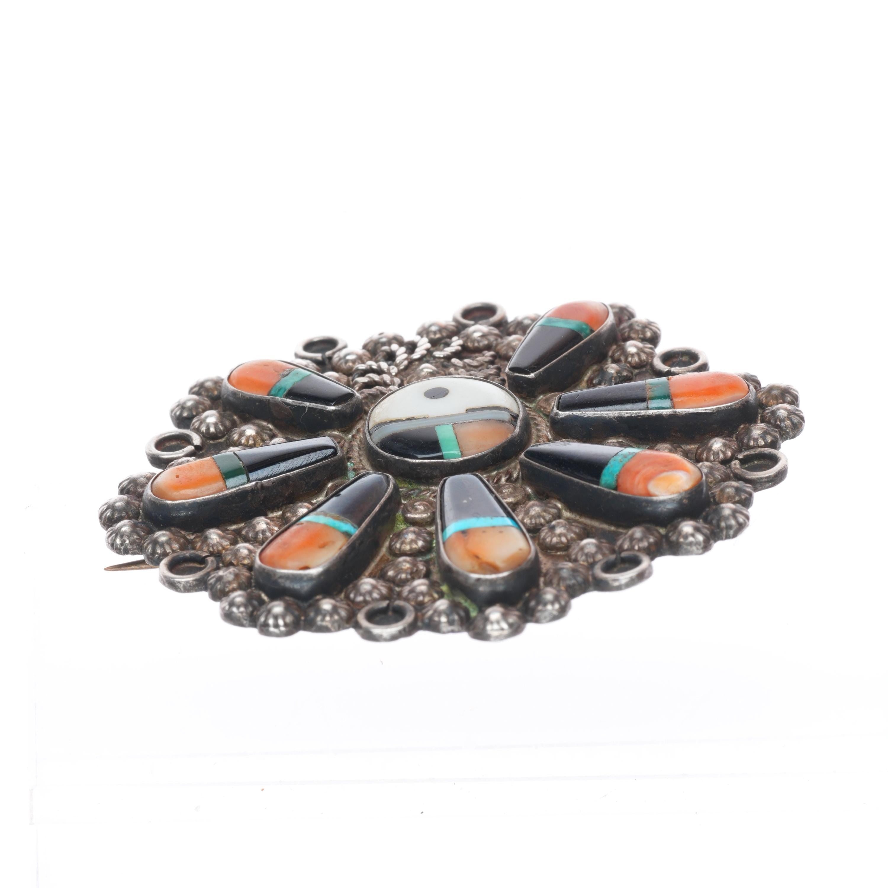1940's Zuni sterling silver spiny oyster, turquoise-jet large sunface pin/brooch