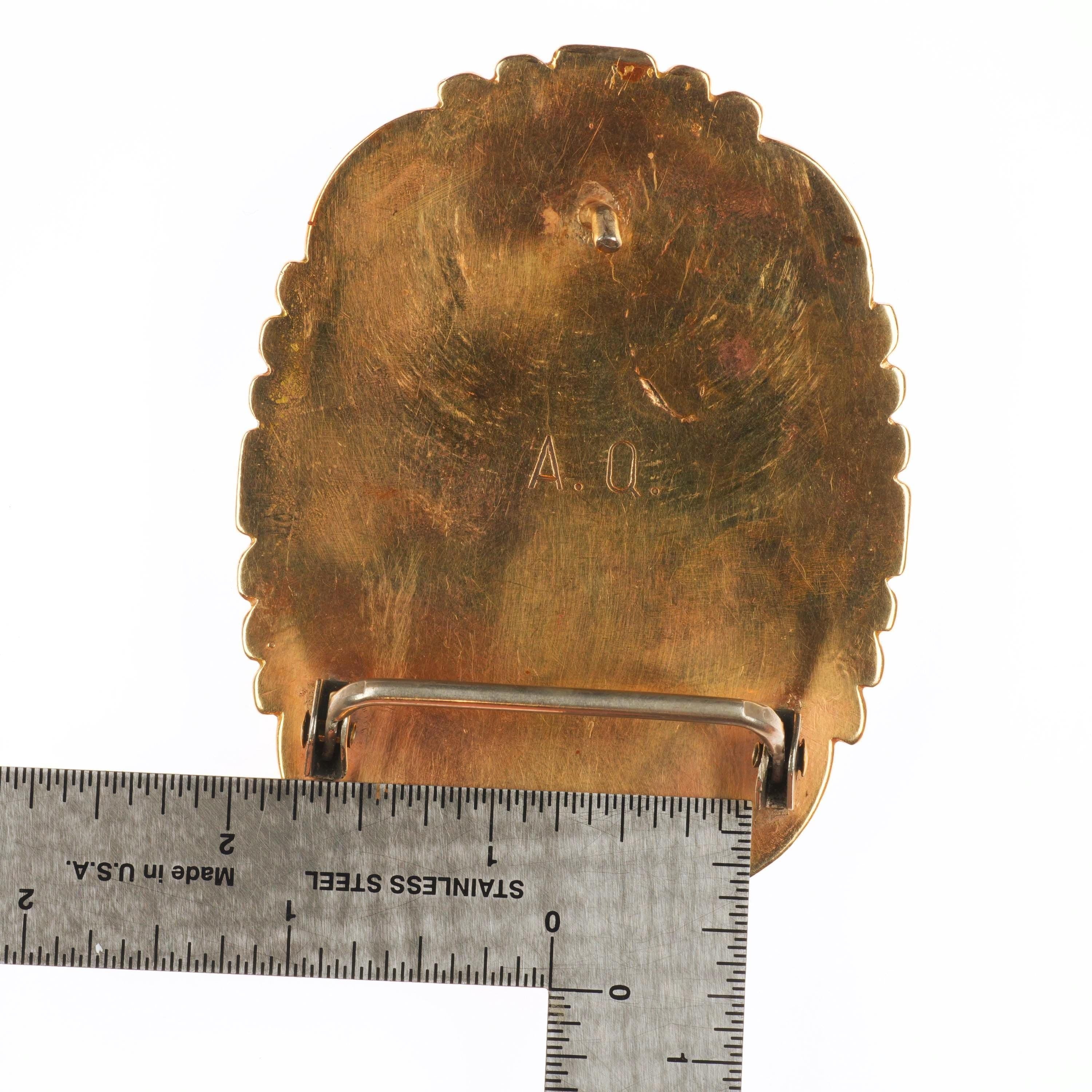 1970‘s Alice Quam Zuni 14k gold belt buckle carved pyrite turquoise cluster. Tested and guaranteed solid 14k gold. Steel bar to catch the belt. Weight and measurements in pictures, circa third quarter of the 20th century. Fits a 1.5" belt. This is a style that was later adopted by Alice Quam‘s daughter Alvina Quam, though not in gold that I know of. I have seen a few Alice Quam pieces in gold, but not that many even though when she was active gold was 1/7 to 1/130 of the current price. Yes you read that correctly, during much of the time she was active gold was .7% of it‘s current price. The average was probably 1/20 current price. Still gold items by her are extremely rare and were likely custom items as it was always more expensive than silver and not as popular with top Native American artists as it is today. Alice Quam was definitely a top Zuni artist