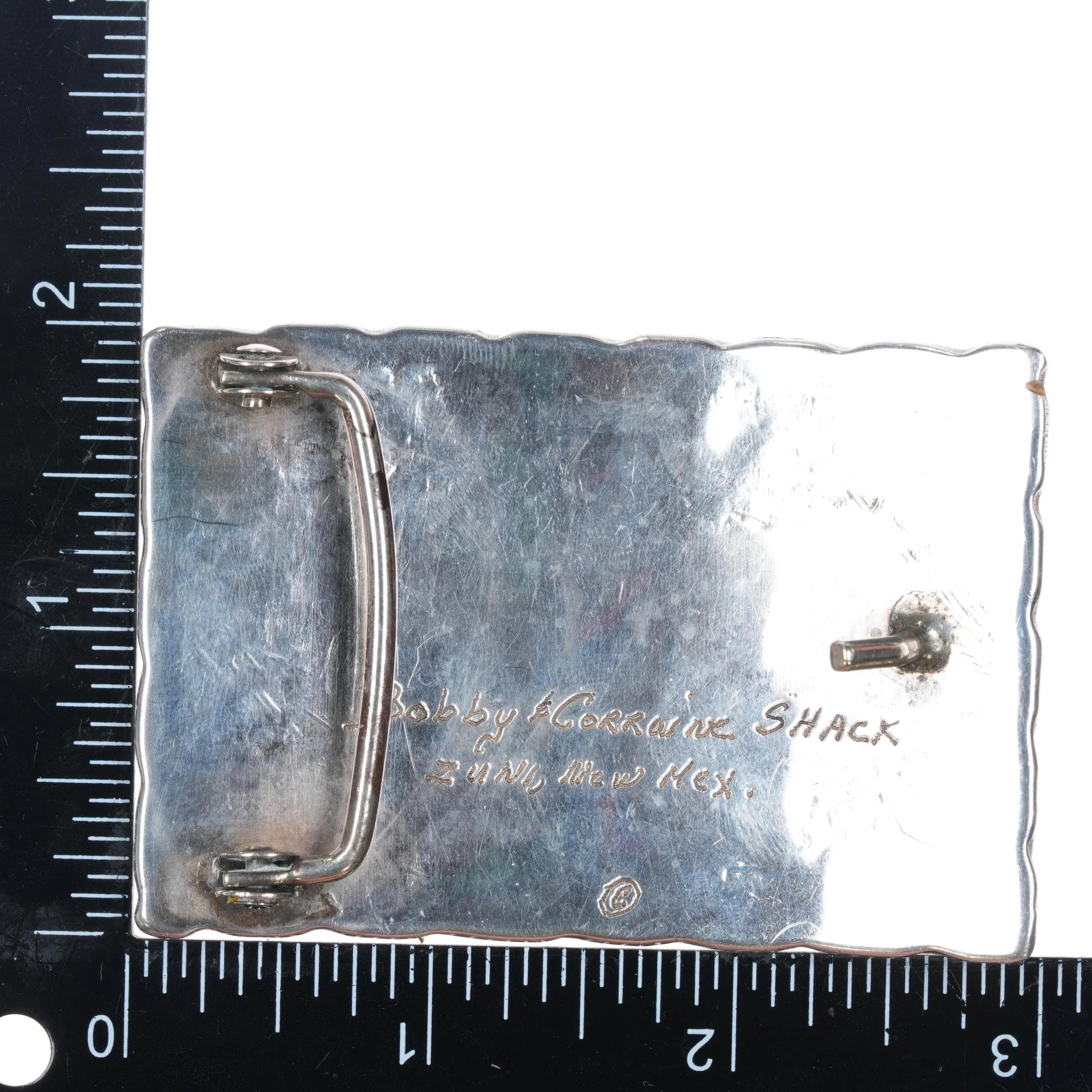 1970‘s Bobby & Corraine Shack Zuni sterling silver inlay thunderbird belt buckle. Solid sterling silver with weight and measurements in pictures. Tested and guaranteed solid sterling silver.