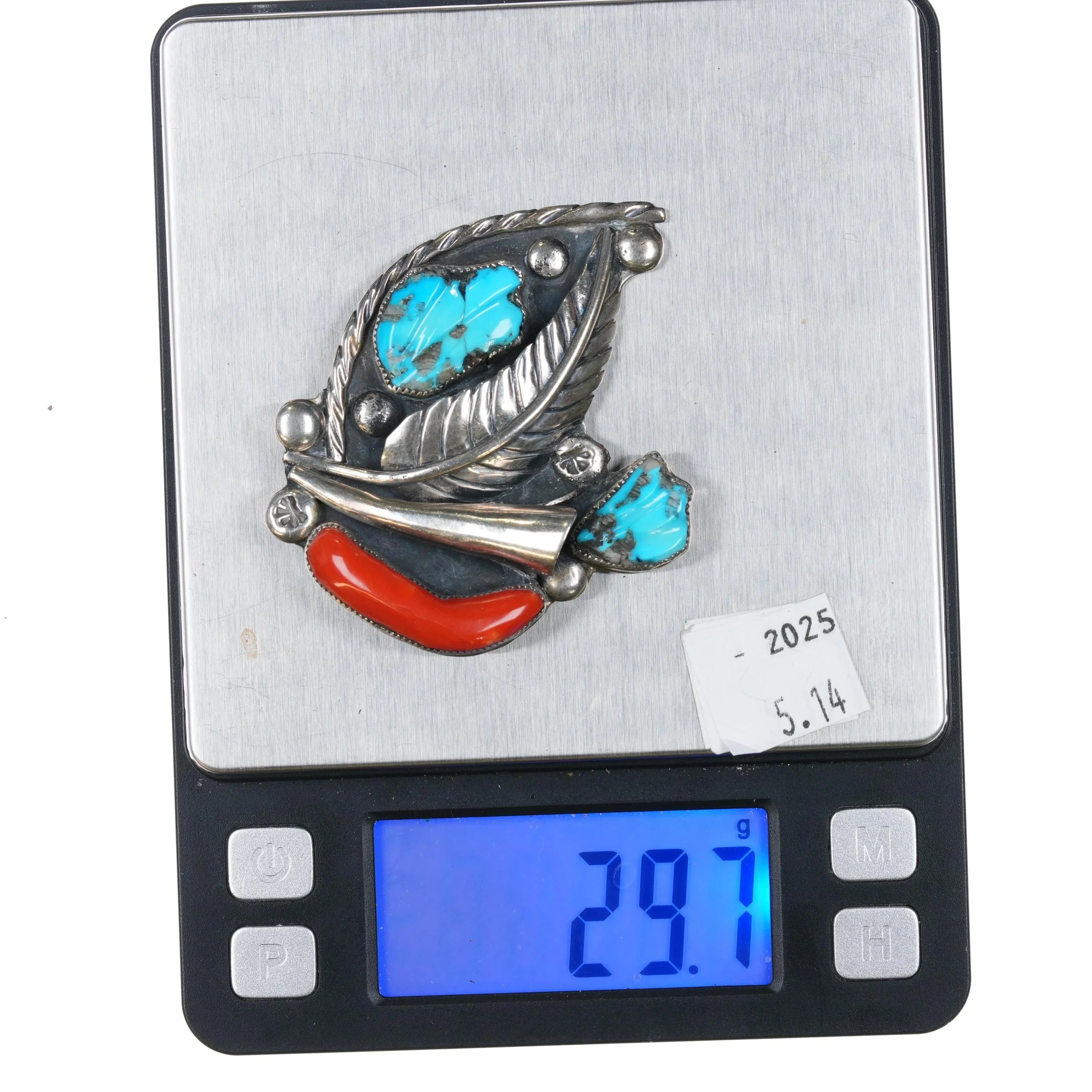 1970‘s Eustace Cochiti Pueblo Sterling silver carved turquoise coral pendant/pin. Tested and guaranteed solid sterling silver, nice large piece with weight and measurements in pictures. Larger turquoise with old fracture. All stones secure in bezels.