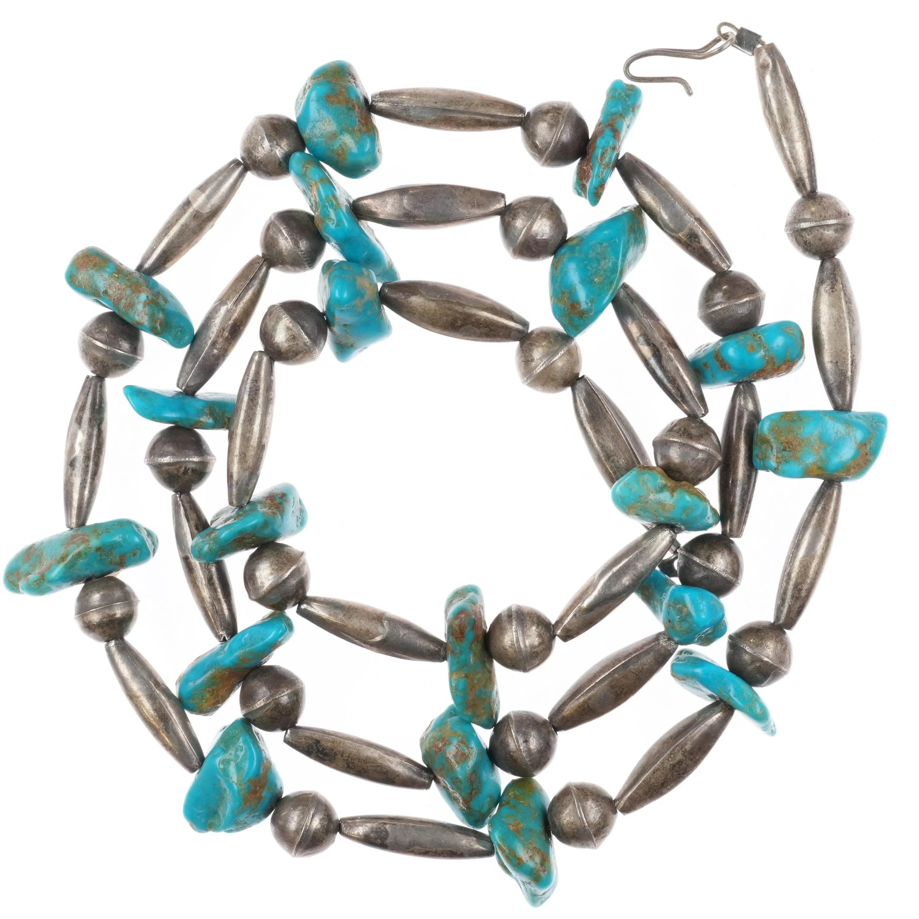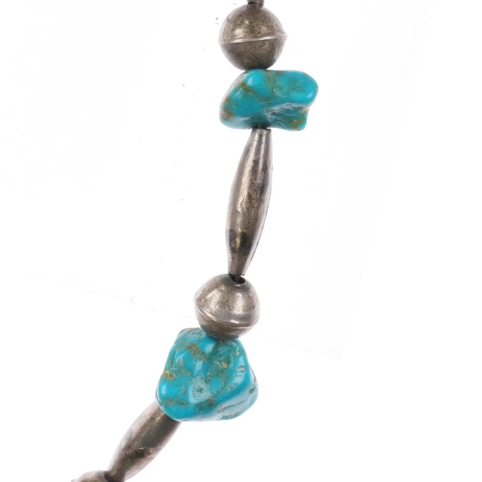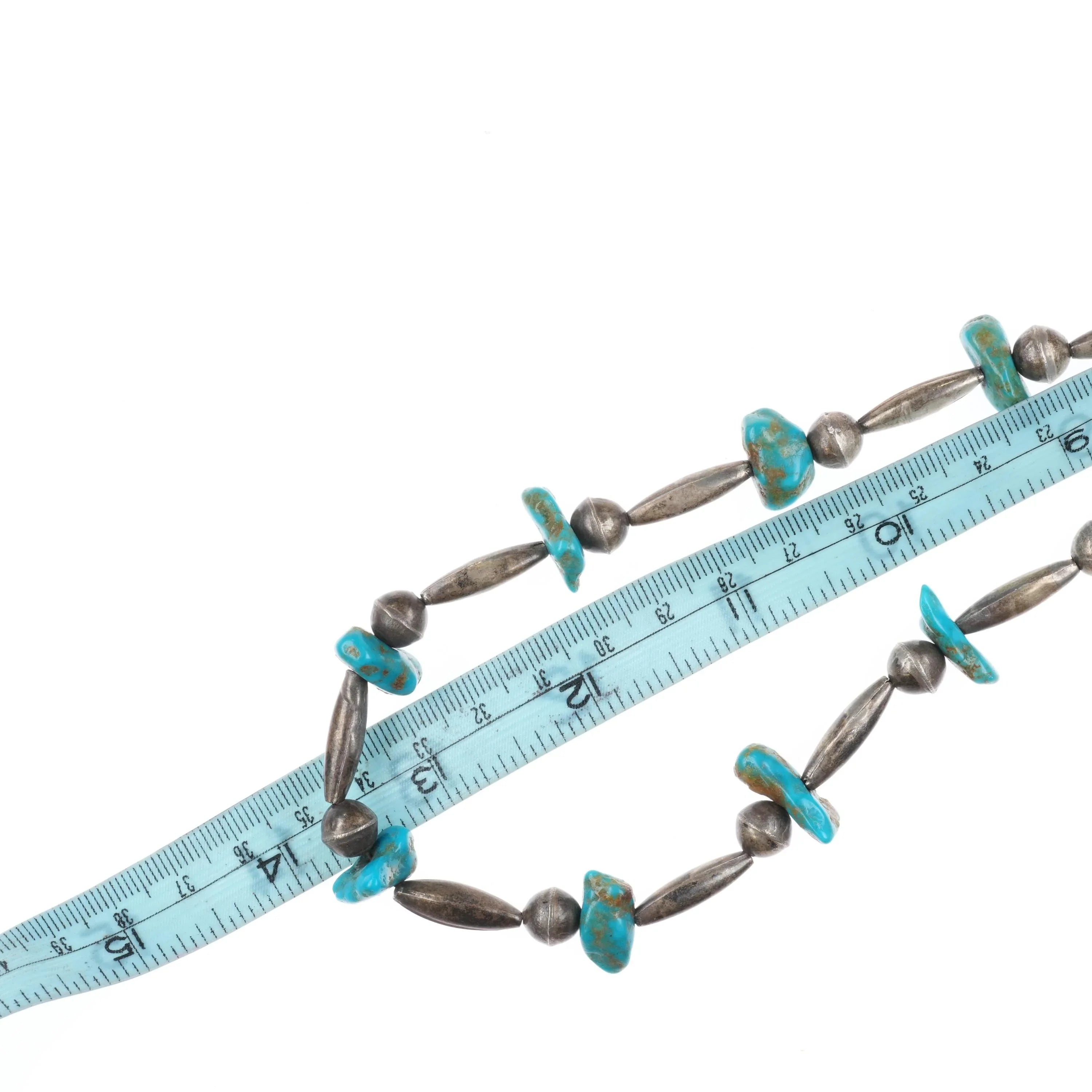 1970‘s Navajo sterling silver tube bead necklace with turquoise stones 28" long. Tested and guaranteed solid sterling silver with weight and measurements in the pictures. No detectable issues. Any markings detected will be shown in the pictures. Unknown artist, likely Native American made from large collection of Native American jewelry purchased in the last quarter of the 20th century and never worn for the most part.