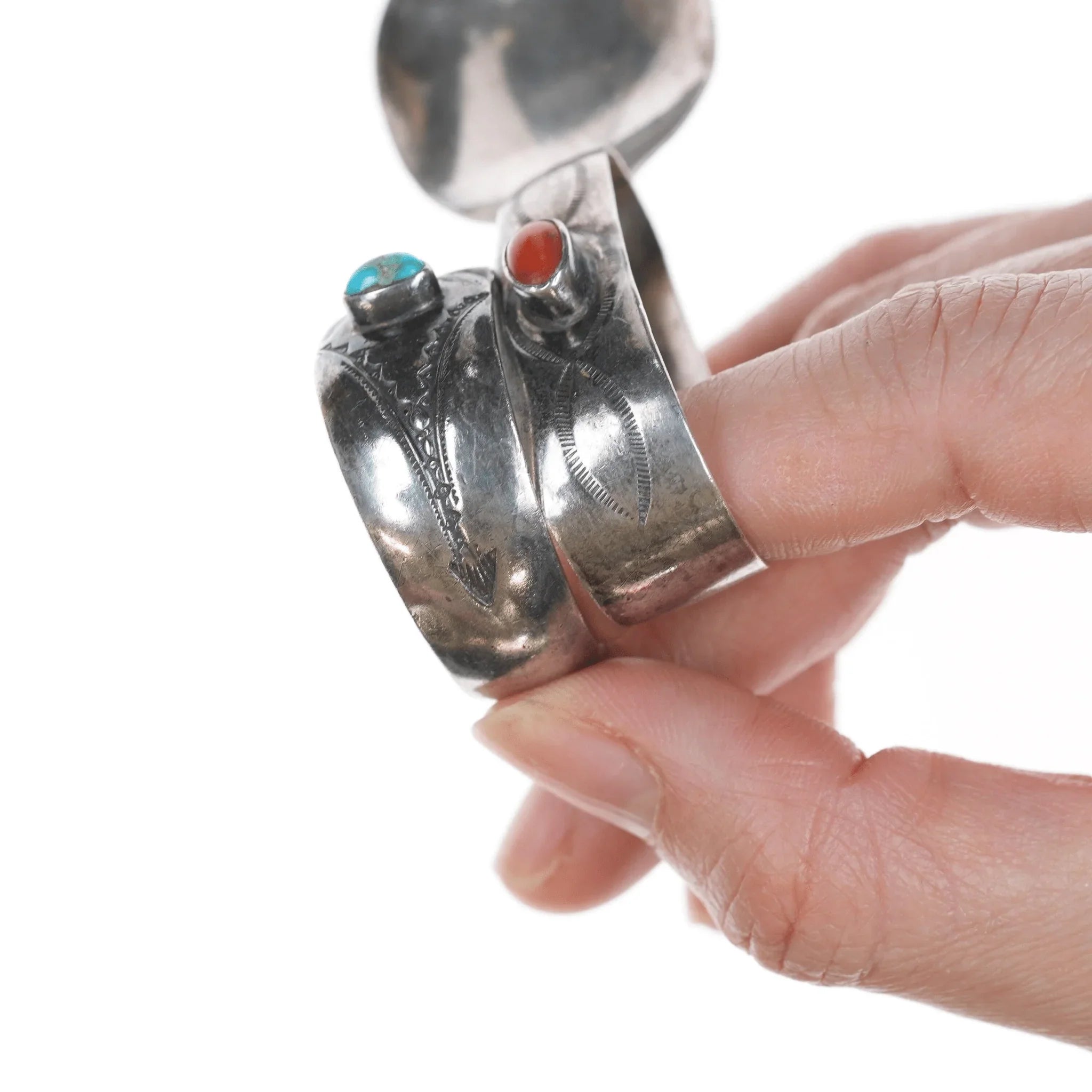 2 Vintage Navajo Baby Spoons, unmarked or marked as shown. If a mark isn't shown<br>then it isn't marked which is common with pre 1970's Native American jewelry<br>that isn't from one of the larger trading posts.<br><br>All precious metals are tested and guaranteed, any Native American jewelry<br>referred to as Silver or Sterling is guaranteed to be a minimum of 90% (coin)<br>silver and possibly higher content. Anything marked is guaranteed to be what<br>it's marked, most bracelets are photographed on a 6" wrist (non hairy), rings<br>photographed on the appropriate sized finger when possible. With bracelets if<br>the measurement is not given in the description then inside circumference is<br>shown where the metal meets the number on the the cloth tape measure.