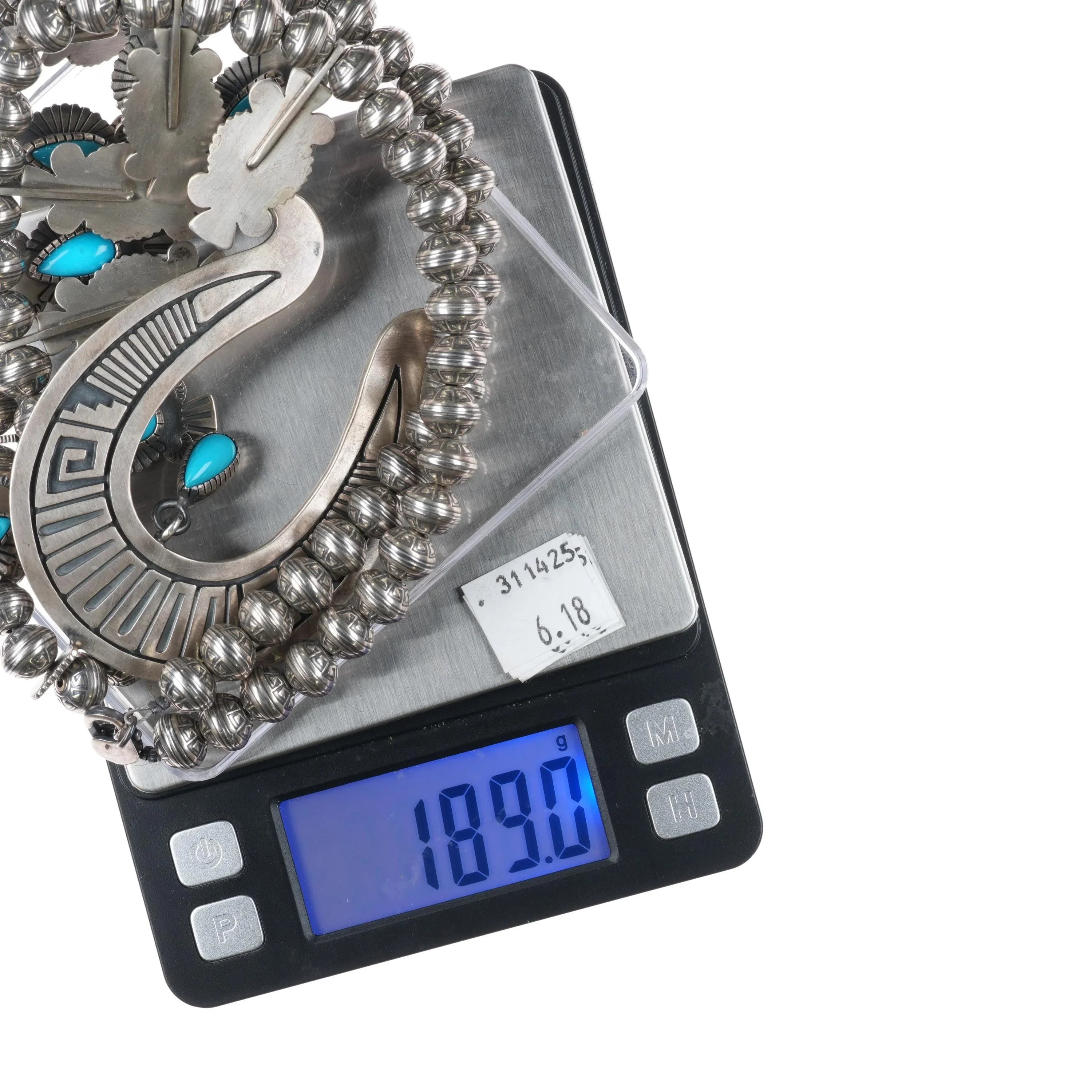 26" Ernest T Bilagody Navajo sterling silver turquoise squash blossom necklace. Tested and guaranteed solid sterling silver with weight and measurements in the pictures. High quality natural Sleeping Beauty turquoise. Buying the Necklace shown with no damage, high quality workmanship by a well respected artist, worn little if any. Very heavy, sturdy, and well made.