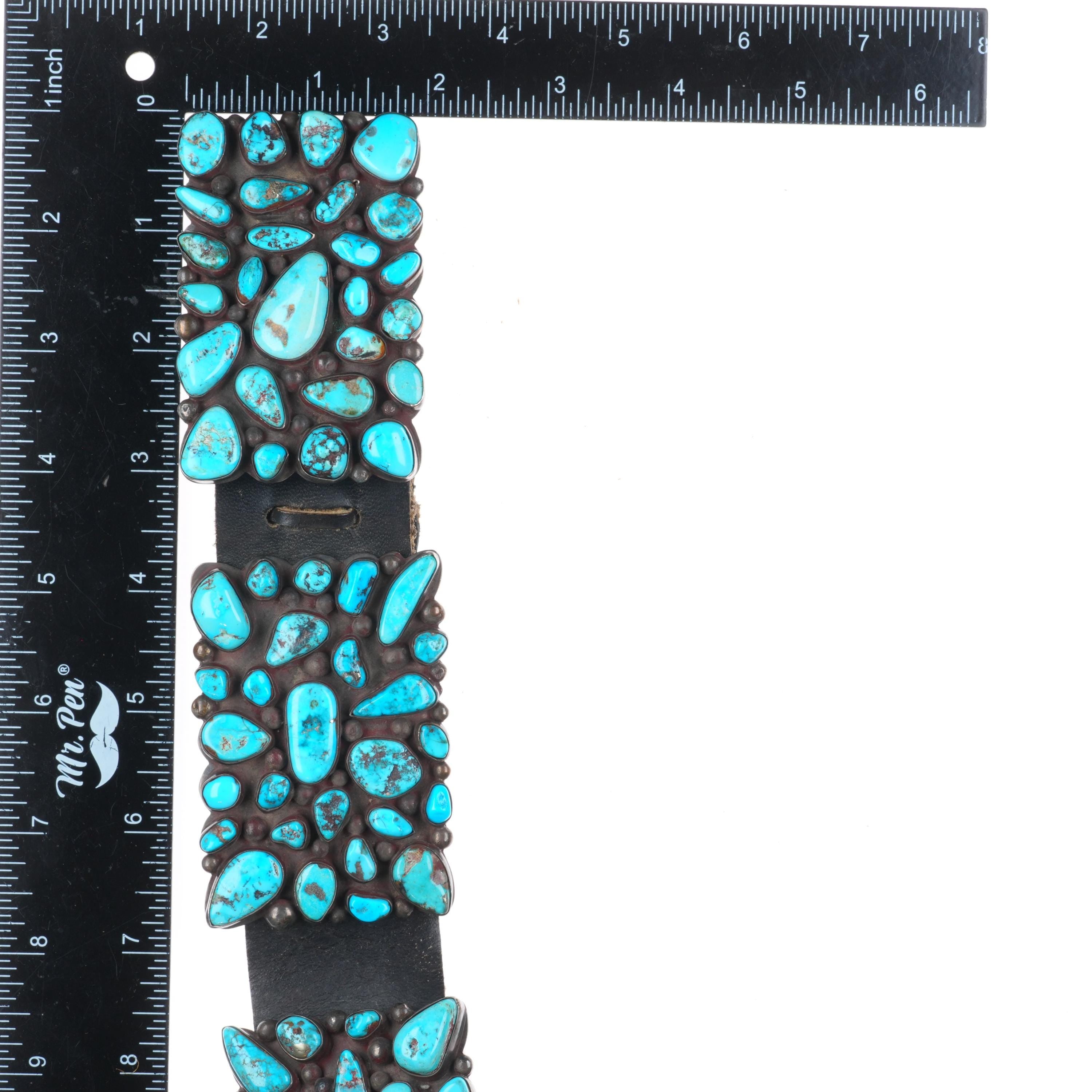 33" Vintage Navajo sterling silver turquoise nugget cluster concho belt. Tested and guaranteed solid sterling silver with weight and measurements in pictures. Fully functional. Fits up to a 33" waist with added holes, great condition, circa third quarter of the 20th century. 7 Conchos, 1 buckle.