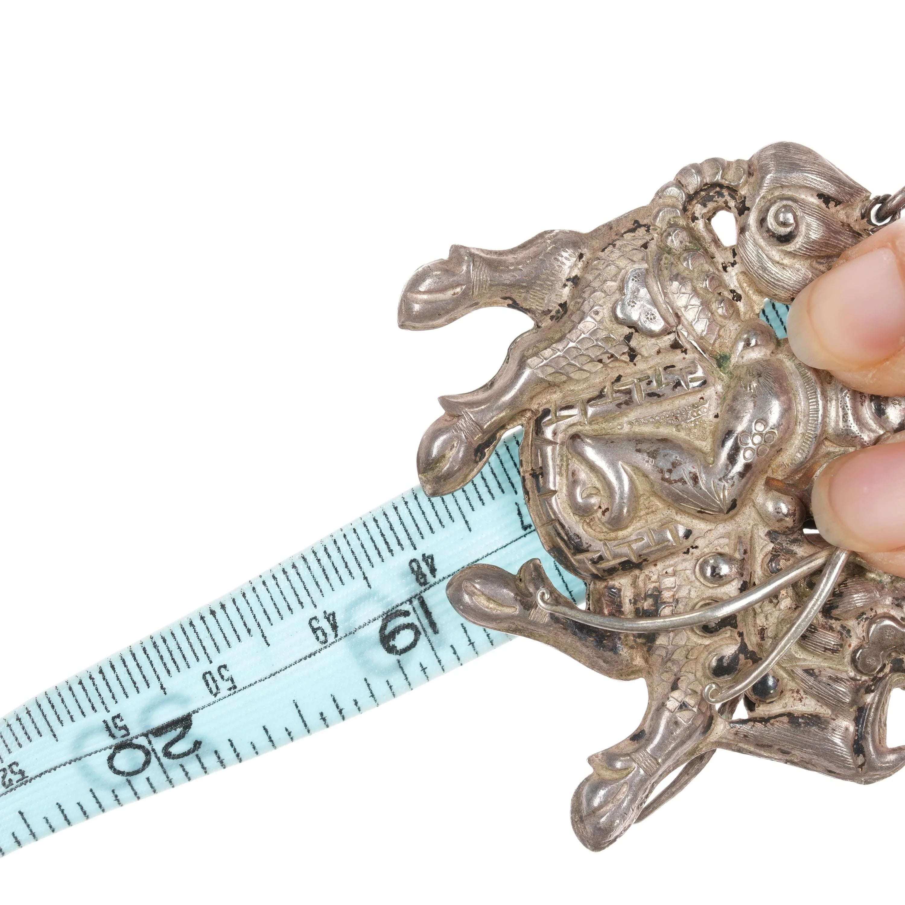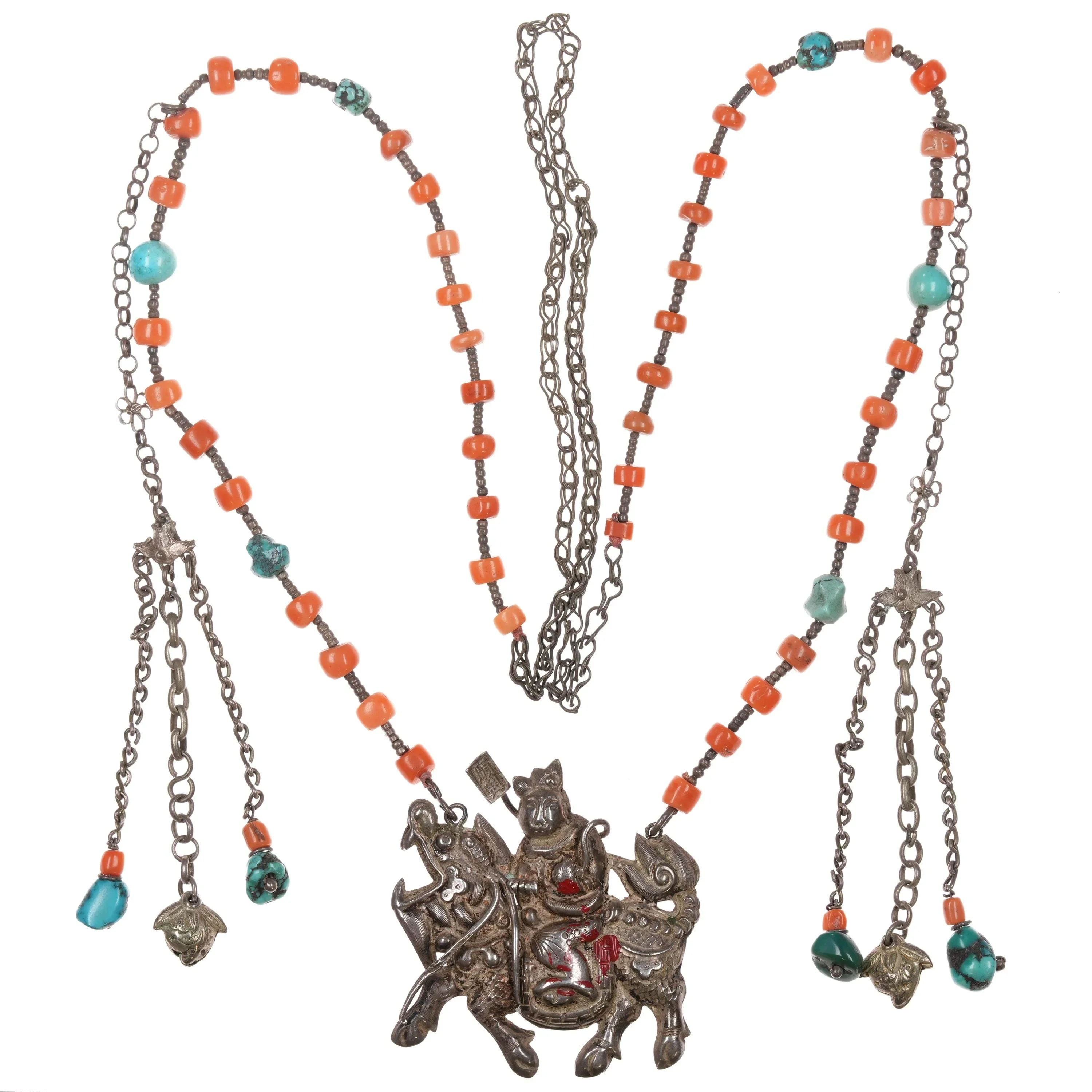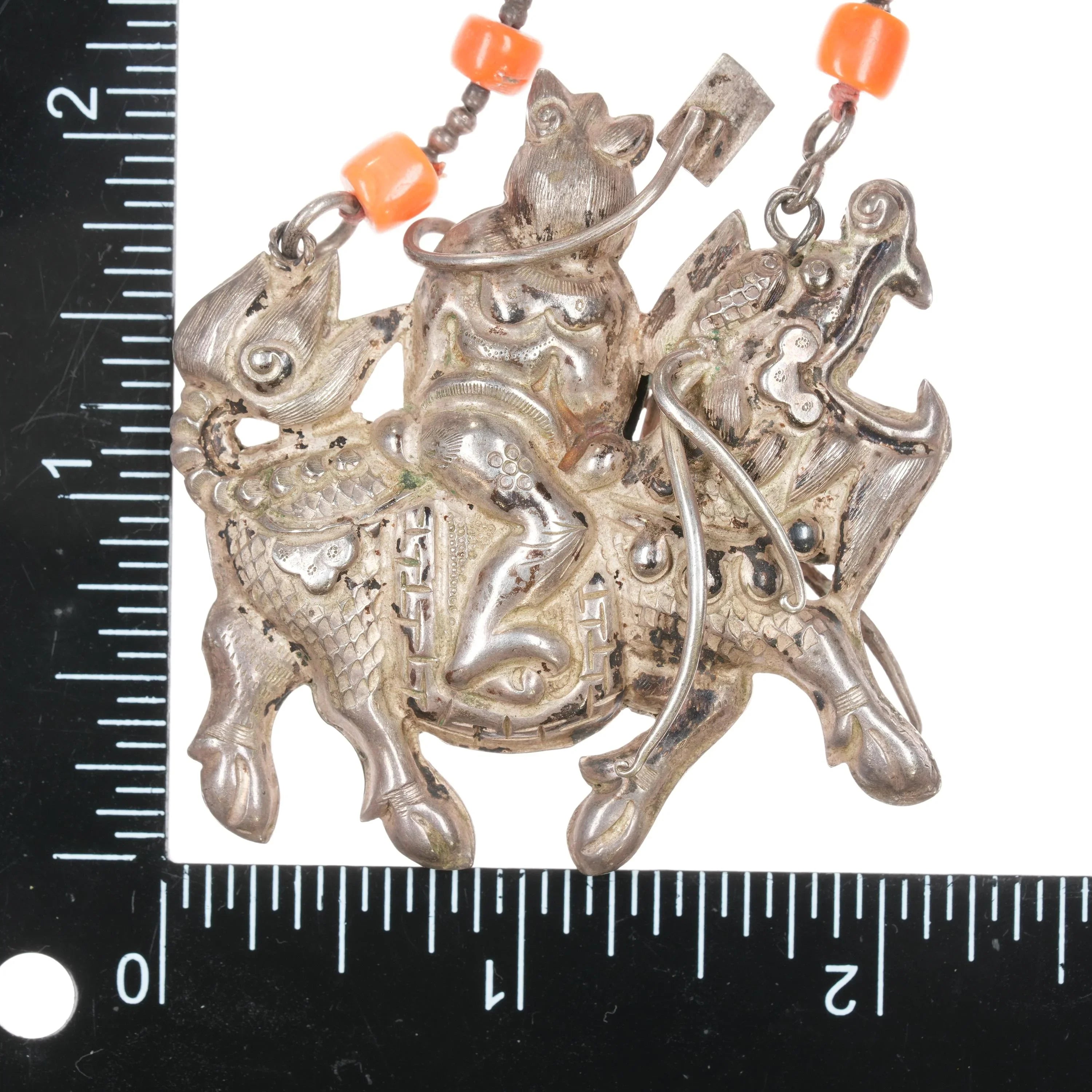 Antique Chinese silver Qilin necklace with coral/turquoise beads. Very substantial 34" long 19th century necklace with solid silver pendant and beads, no significant issues. Weight and measurements in pics.